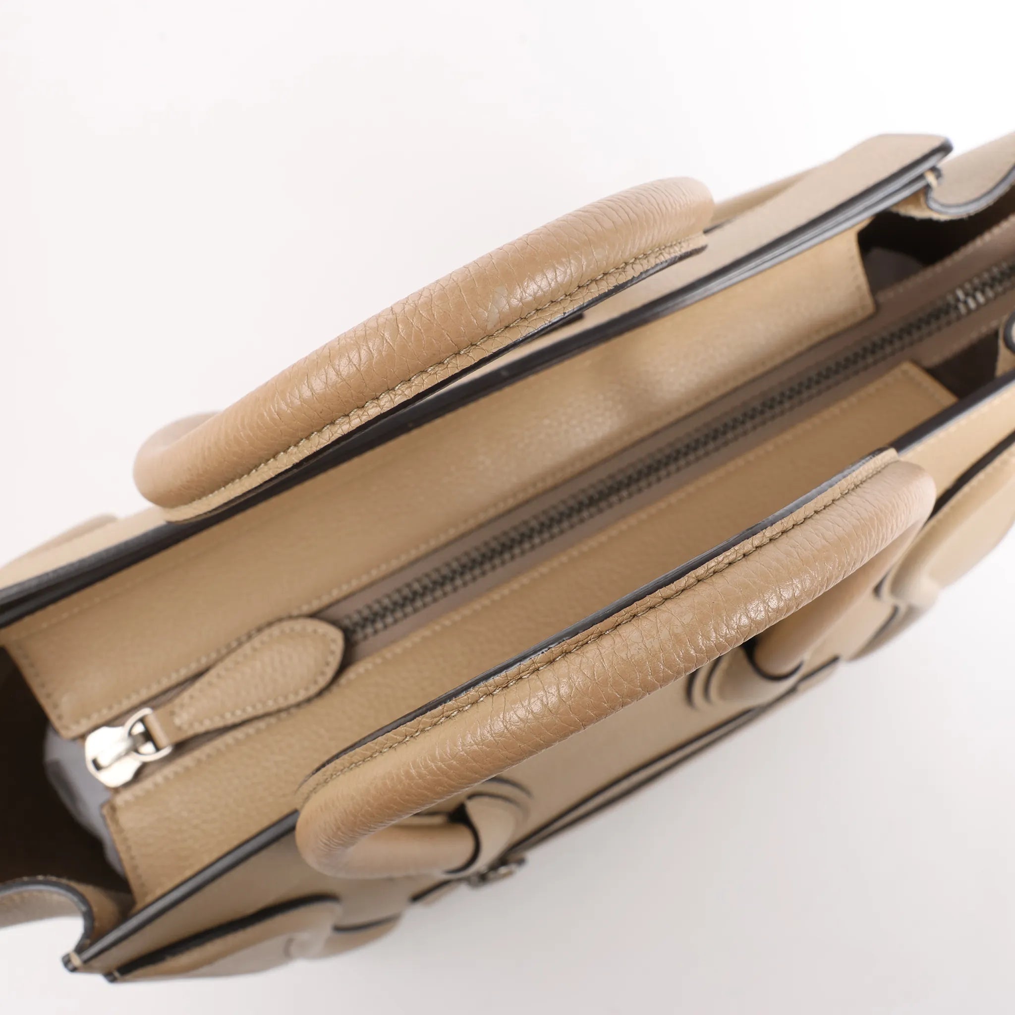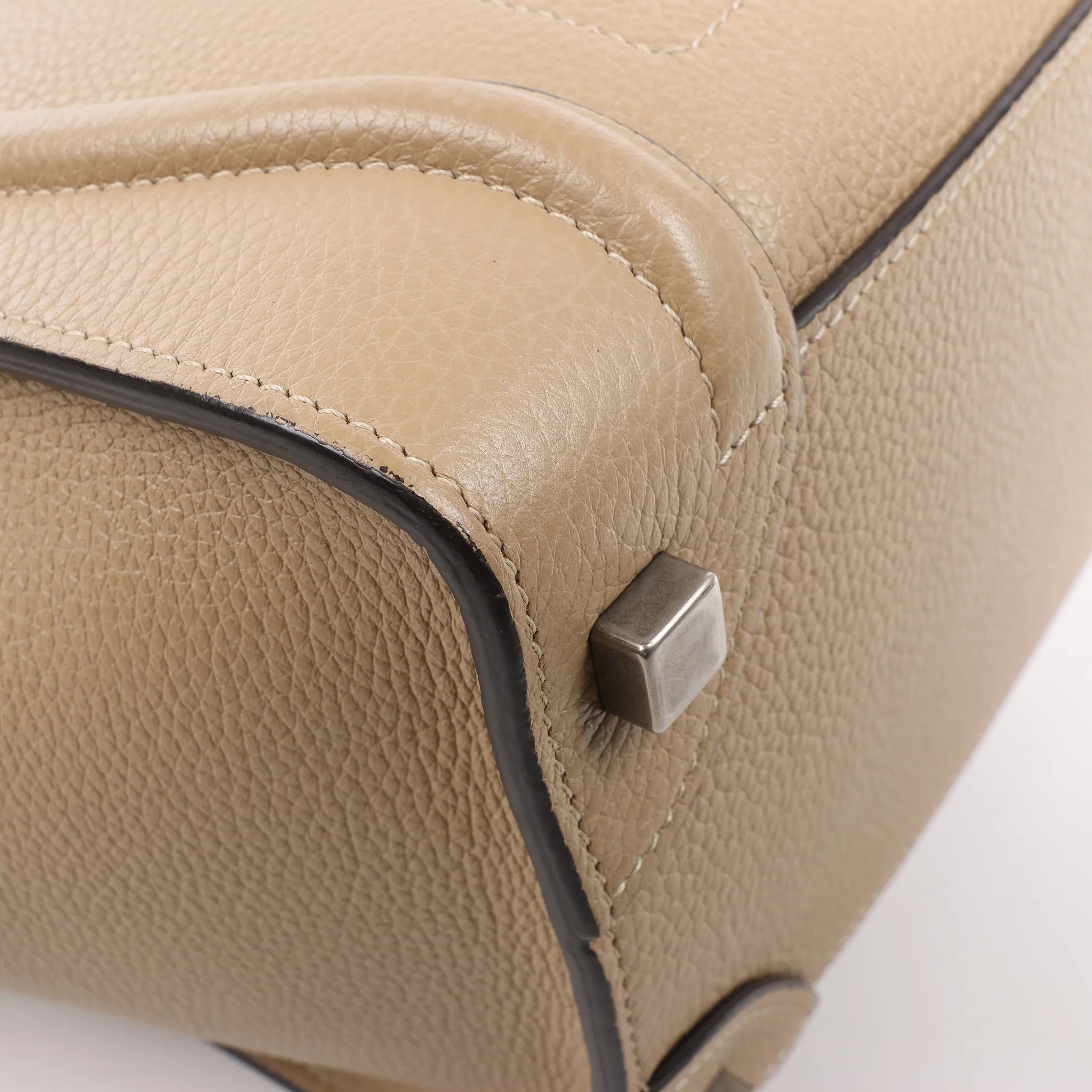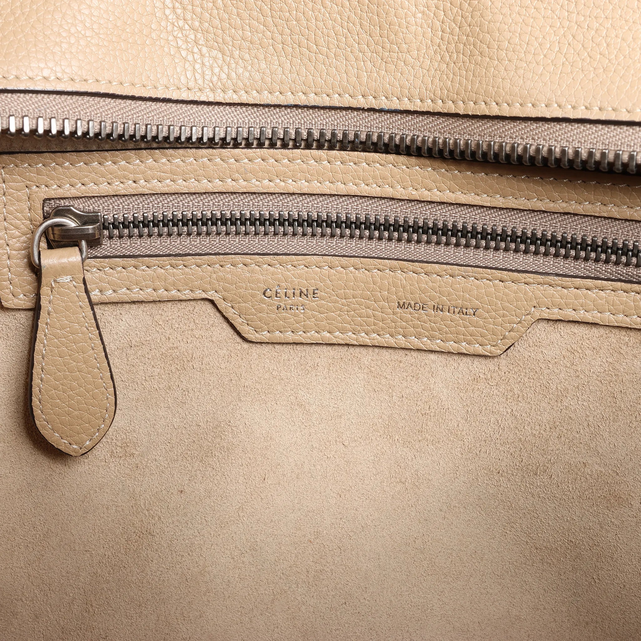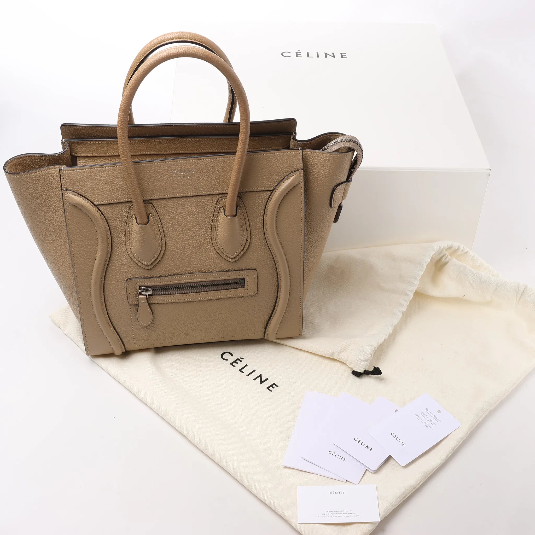 Brand: CelineModel: LuggageSize: MicroWidth: 26 cm Height: 28 cmExterior Condition: ExcellentInterior Condition: ExcellentCondition Details: Exterior leather is clean and beautiful in very good condition except some scratches and rubbings. Handles are clean and firm in very good condition, but has usage rubbings. Hardware is bright with scratches. The interior lining is in very good condition, except some small stains. Width at the top is 40 cm.Colour: BeigeInterior Colour: BeigeHardware Colour: SilverMaterial: LeatherComes With: Box, dustbag, papers
