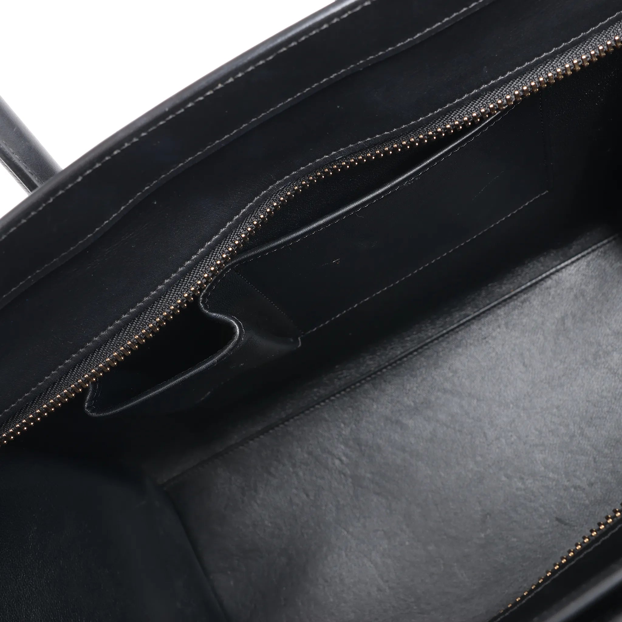 Brand: CelineModel: LuggageSize: MiniWidth: 30 cmHeight: 30 cmExterior Condition: ExcellentInterior Condition: ExcellentCondition Details: Exterior leather is clean and beautiful in excellent condition, with some small scratches and rubbings at the corners. The handles are firm and in great condition. The hardware is crisp and in great condition. The interior lining is in great condition, but has small stains and scratches. Width at the top is 49 cm.Colour: Blue, Beige, BlackInterior Colour: BlackHardware Colour: GoldMaterial: LeatherComes With: -