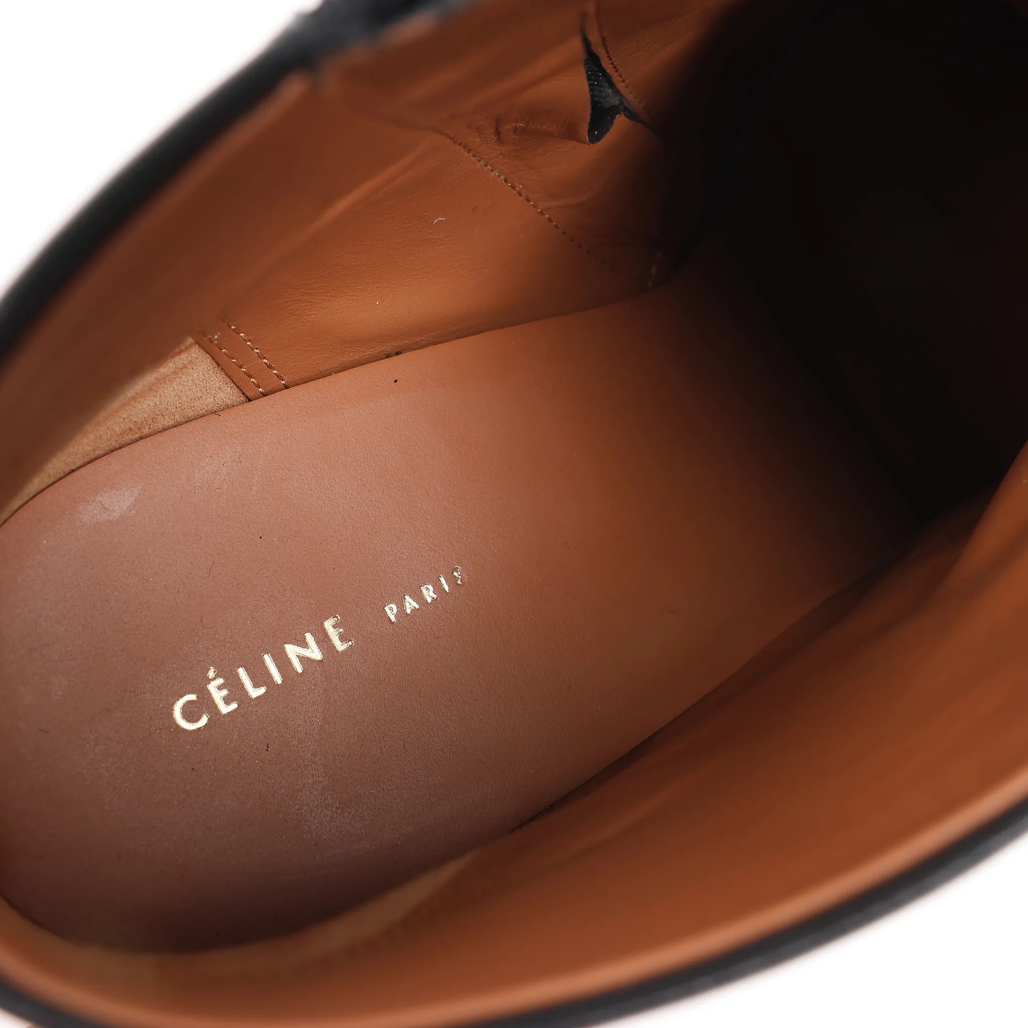 Sleek and sculptural, the Celine Phoebe Ankle Boots in black leather, size 38 EU, feature a signature minimalist silhouette with a striking metallic block heel. A refined statement piece that blends luxury craftsmanship with modern architectural edge.