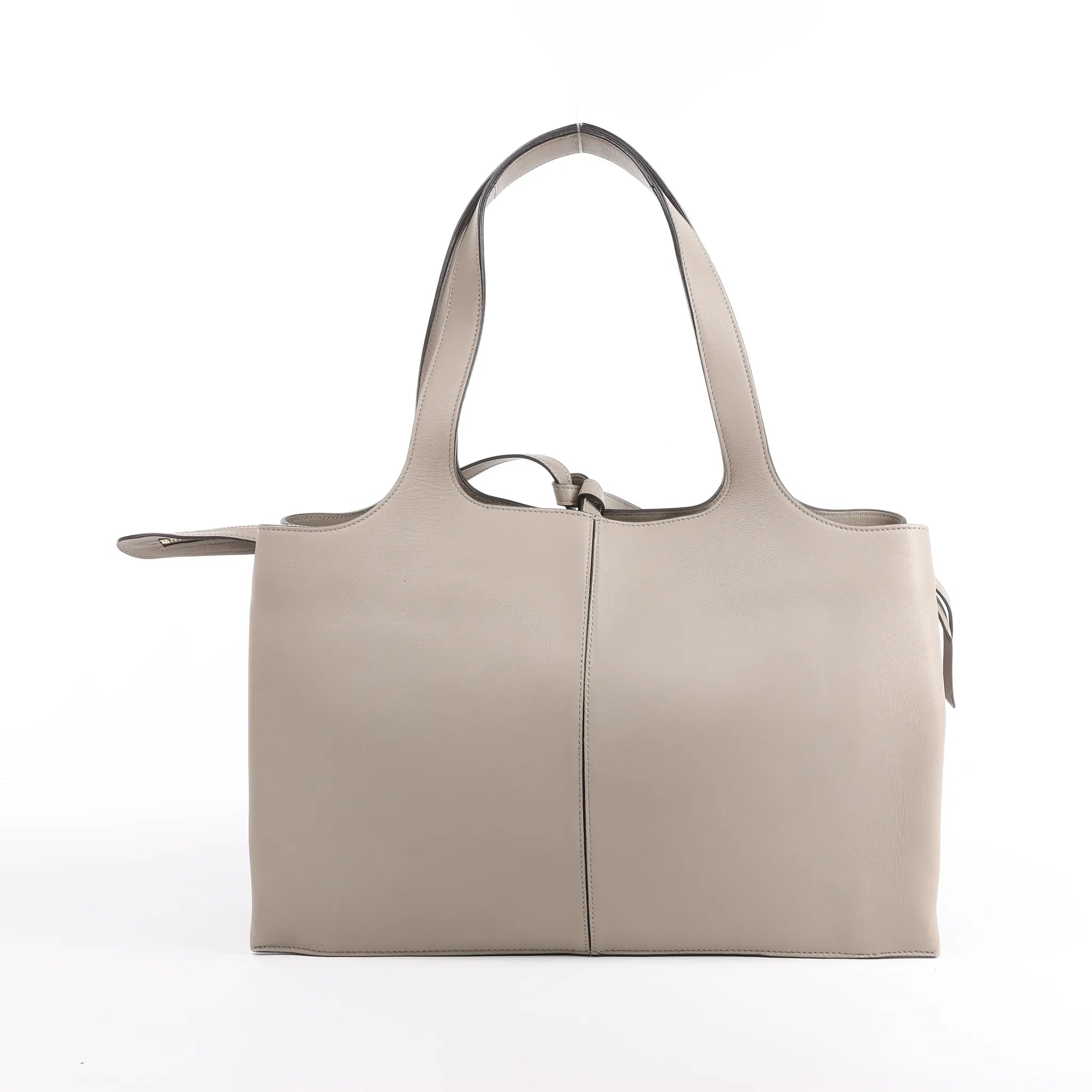 The Celine Tri-Fold Shoulder Bag in greige leather is a minimalist masterpiece with a spacious design. Featuring slim handles and refined detailing, this elegant bag offers both everyday practicality and timeless sophistication.