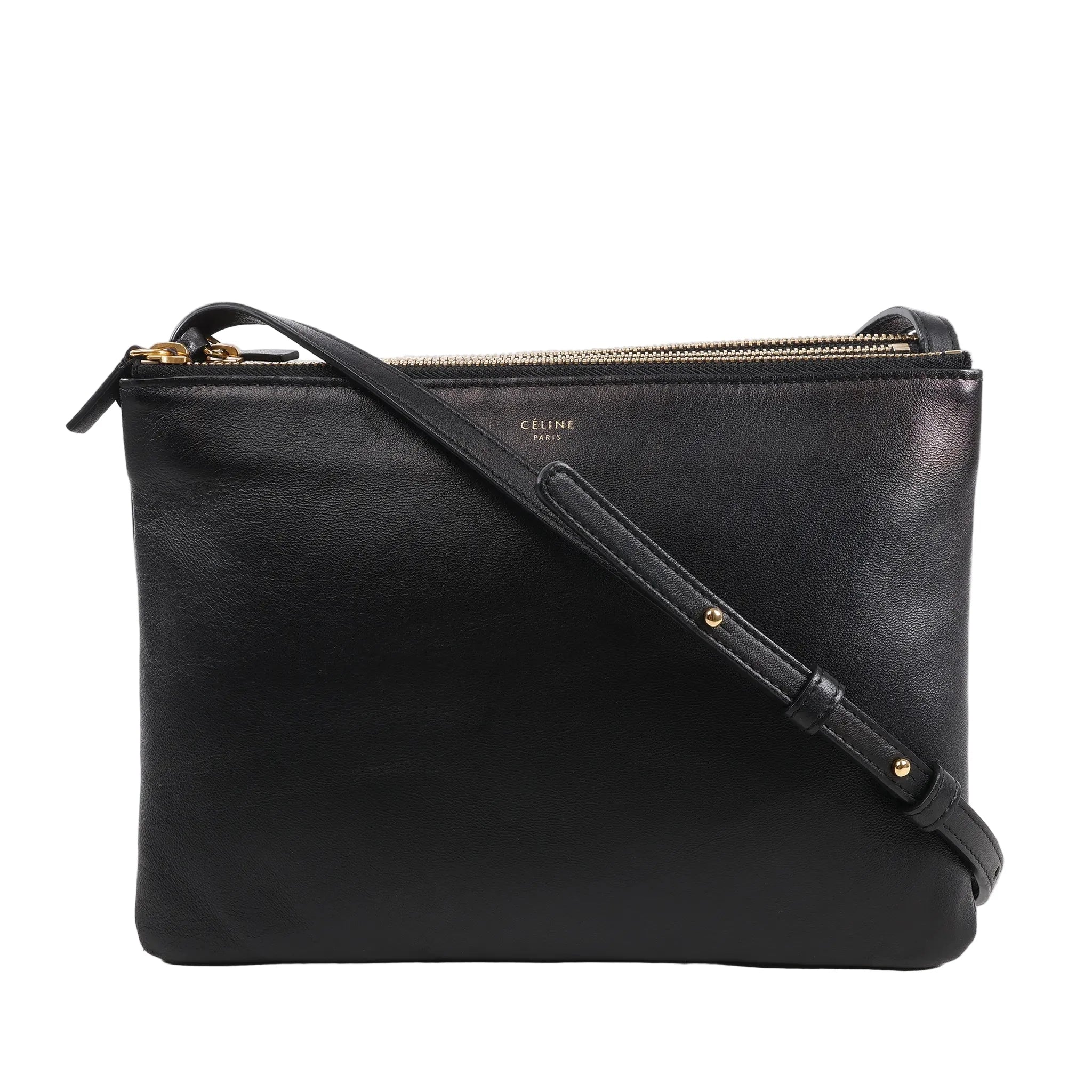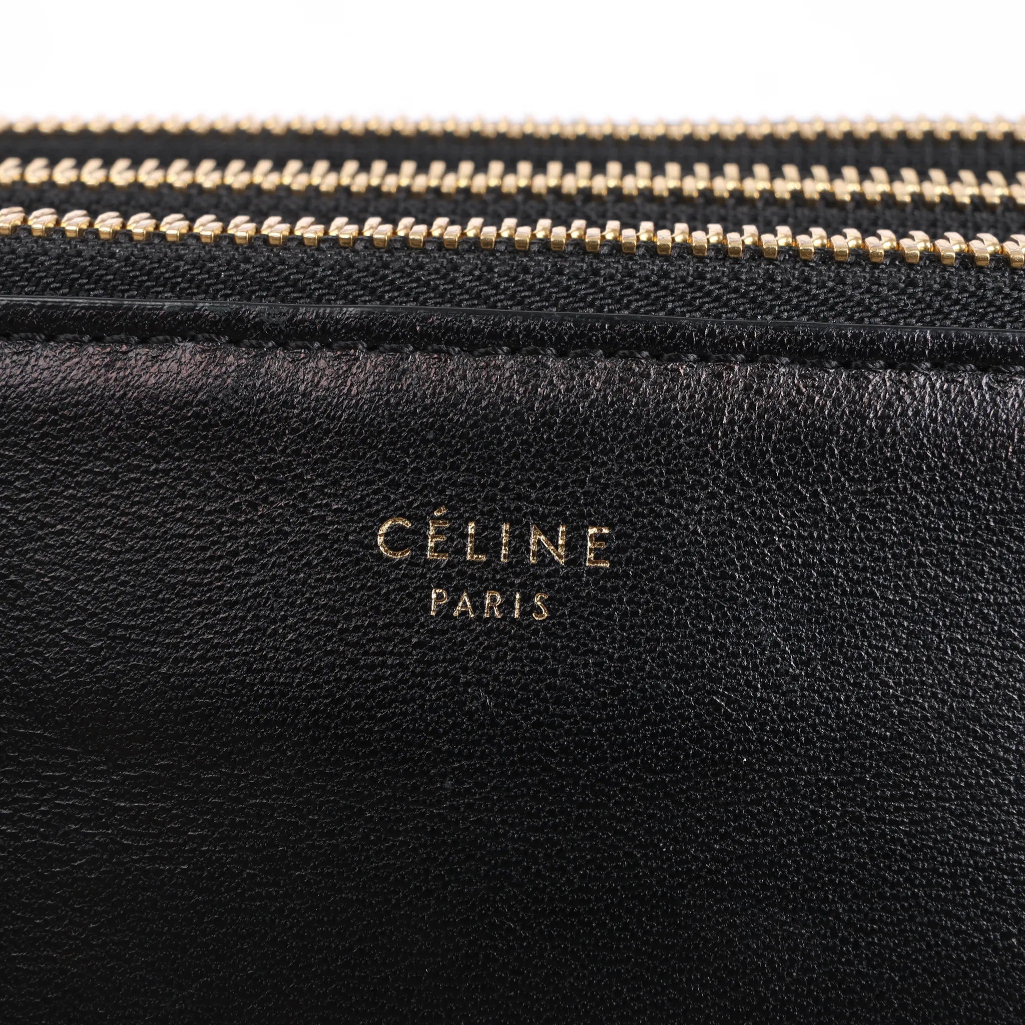 Brand: CELINEModel: Trio Size: LargeWidth: 24.5 cmHeight: 17 cmExterior Condition: ExcellentInterior Condition: ExcellentCondition Details: The exterior leather is clean in excellent condition. The hardware is bright and crisp. The shoulder strap is clean and in good condition The interior lining is clean and excellent condition Overall looks like NEW!Colour: BlackInterior Colour: BlackHardware Colour: GoldMaterial: LeatherComes With: Dustbag