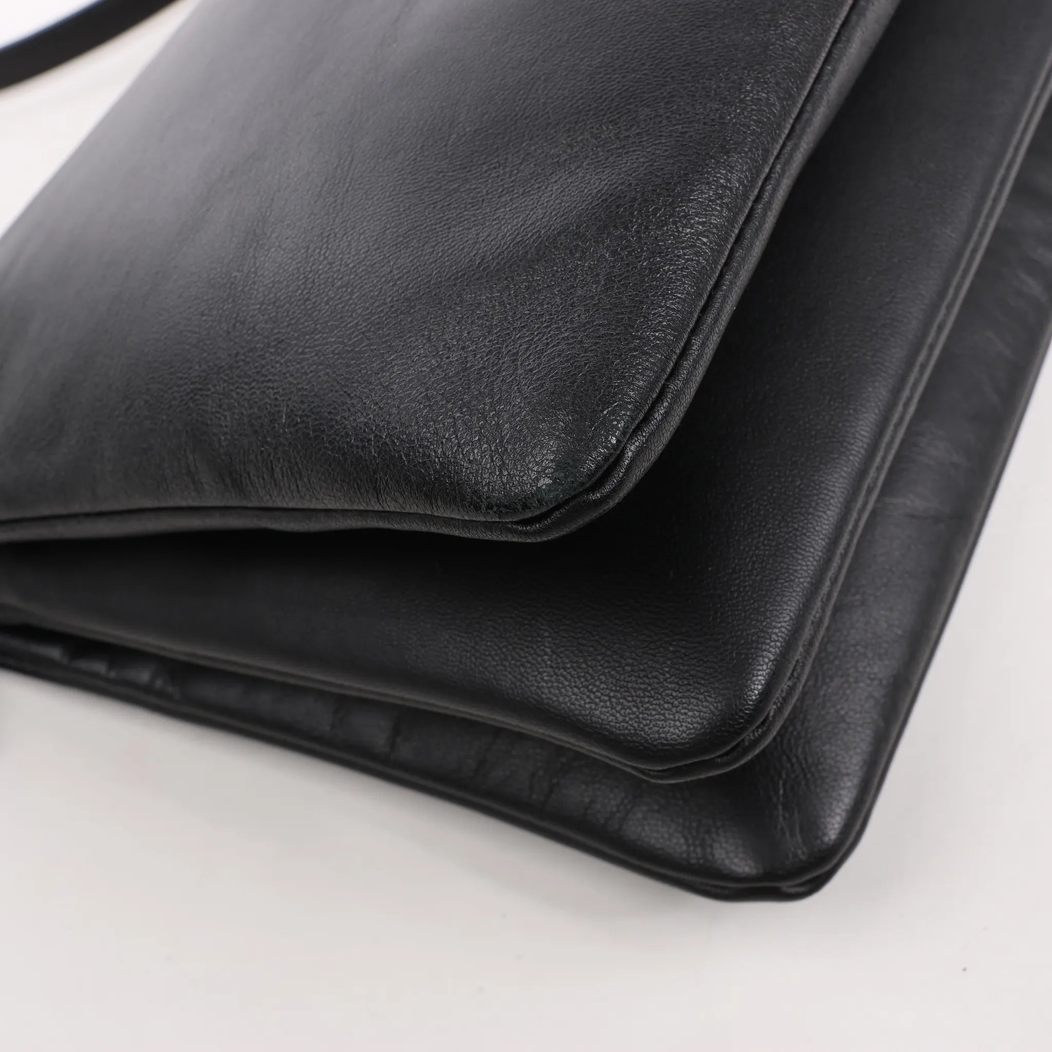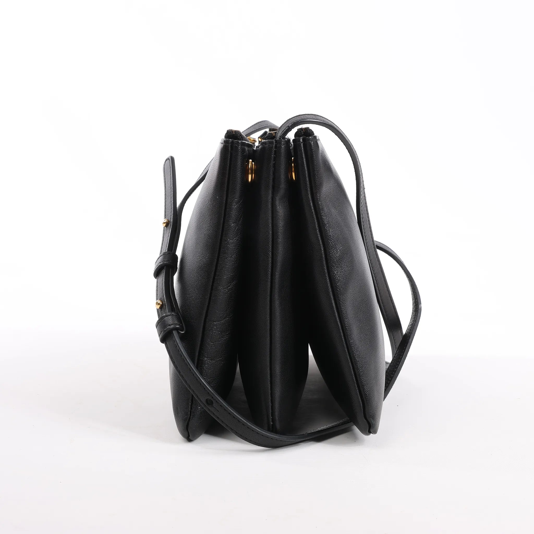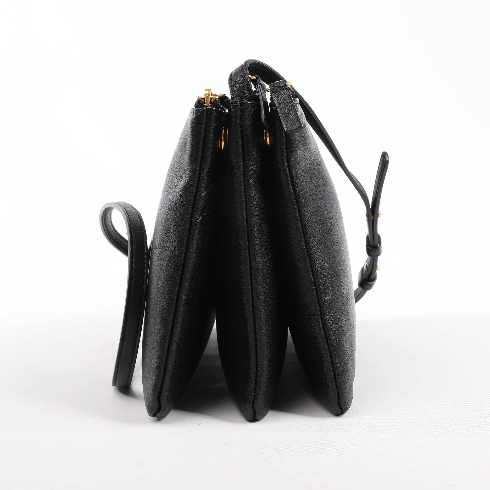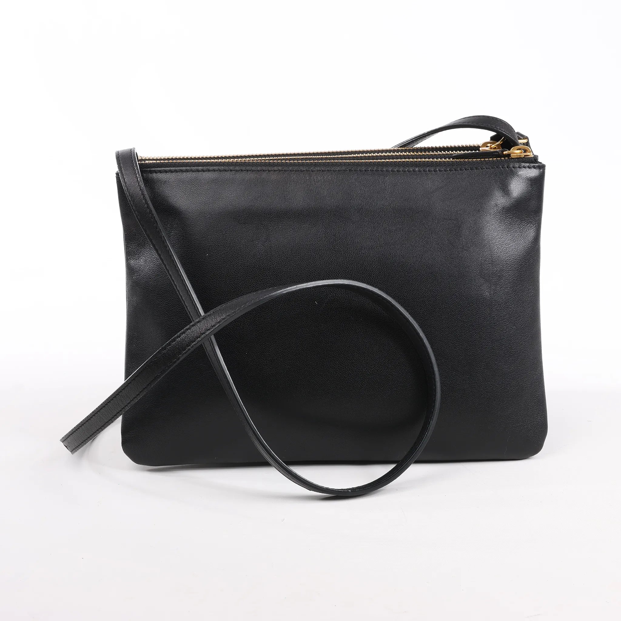 The Celine Trio Large Crossbody Bag in Black is the epitome of minimalist elegance. Crafted from smooth black leather, this iconic design features three zippered compartments and an adjustable shoulder strap—perfect for organized, hands-free sophistication.