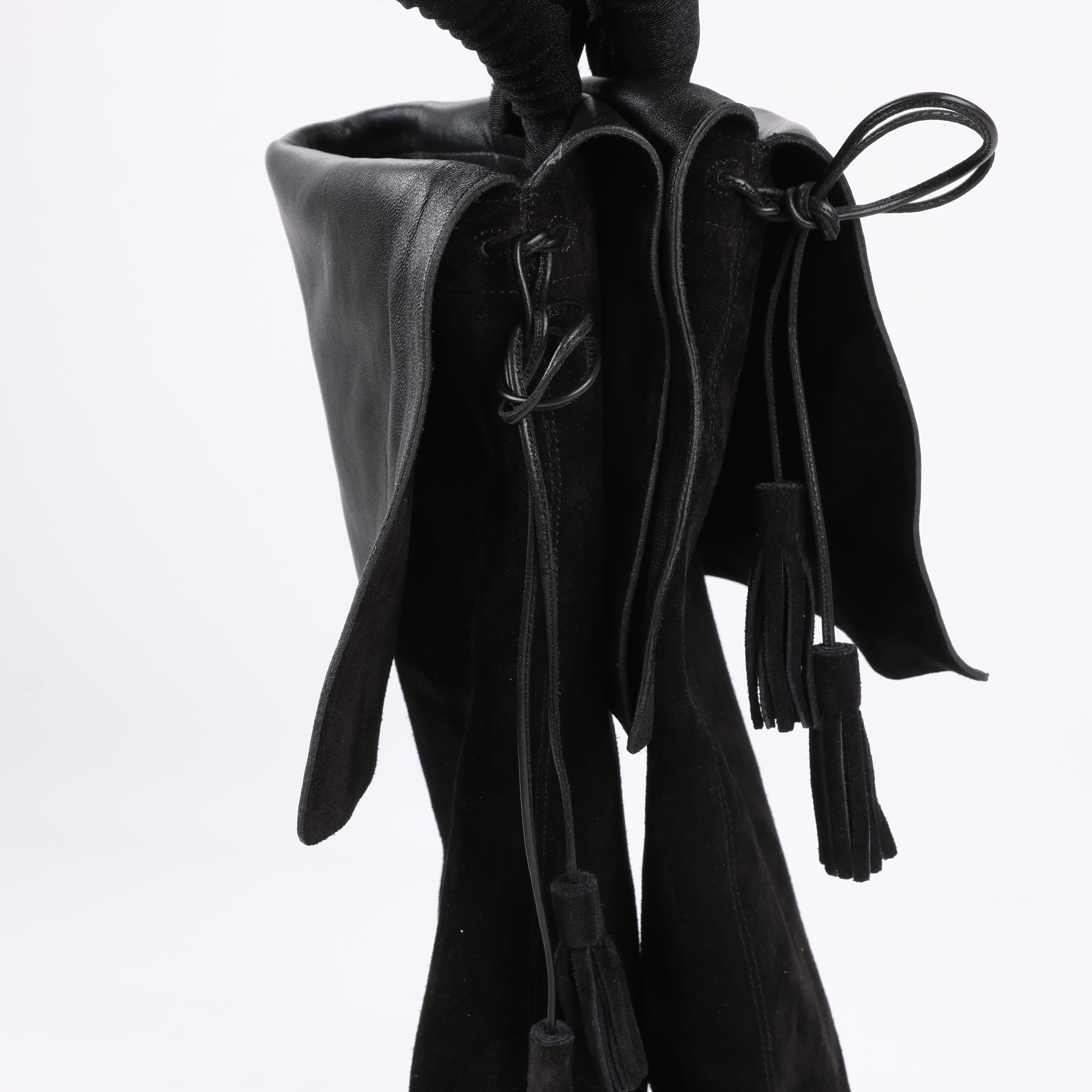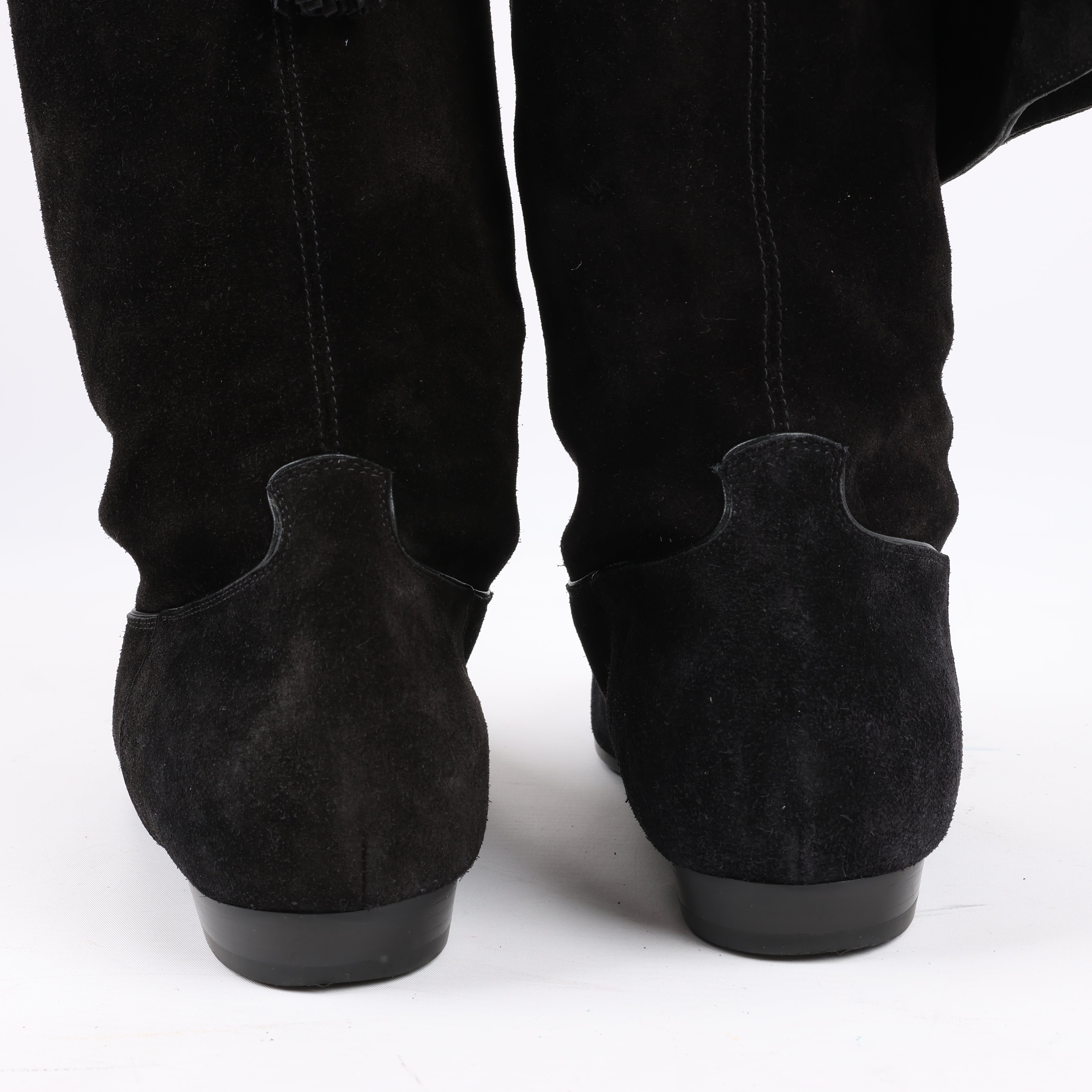 Celine Chat Botté Over-The-Knee Flat Boots in Suede Calfskin, Size 38 (RM0220), exude timeless elegance with their luxurious black suede and signature fold-over leather cuff. A chic, flat-soled silhouette ensures comfort without compromising style.