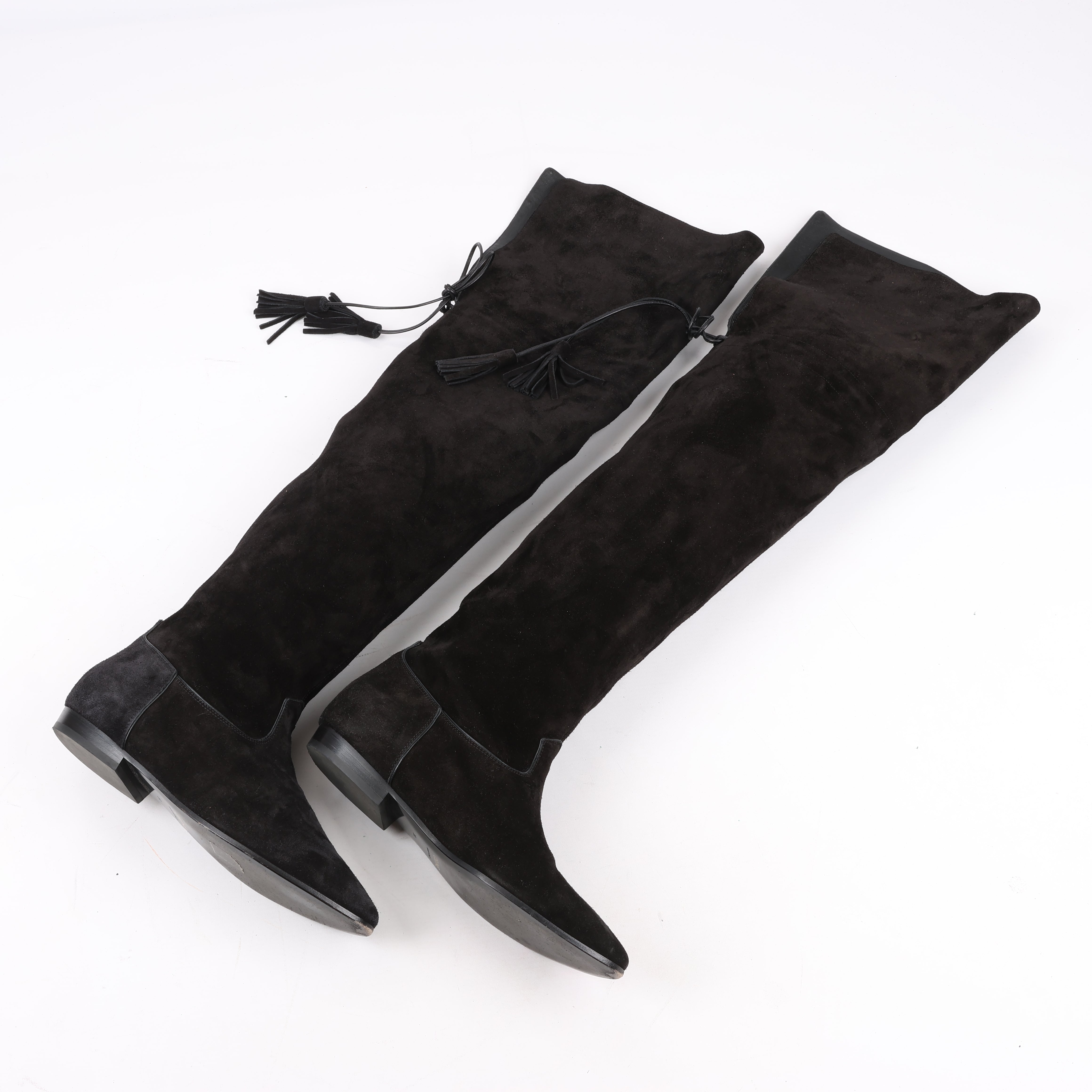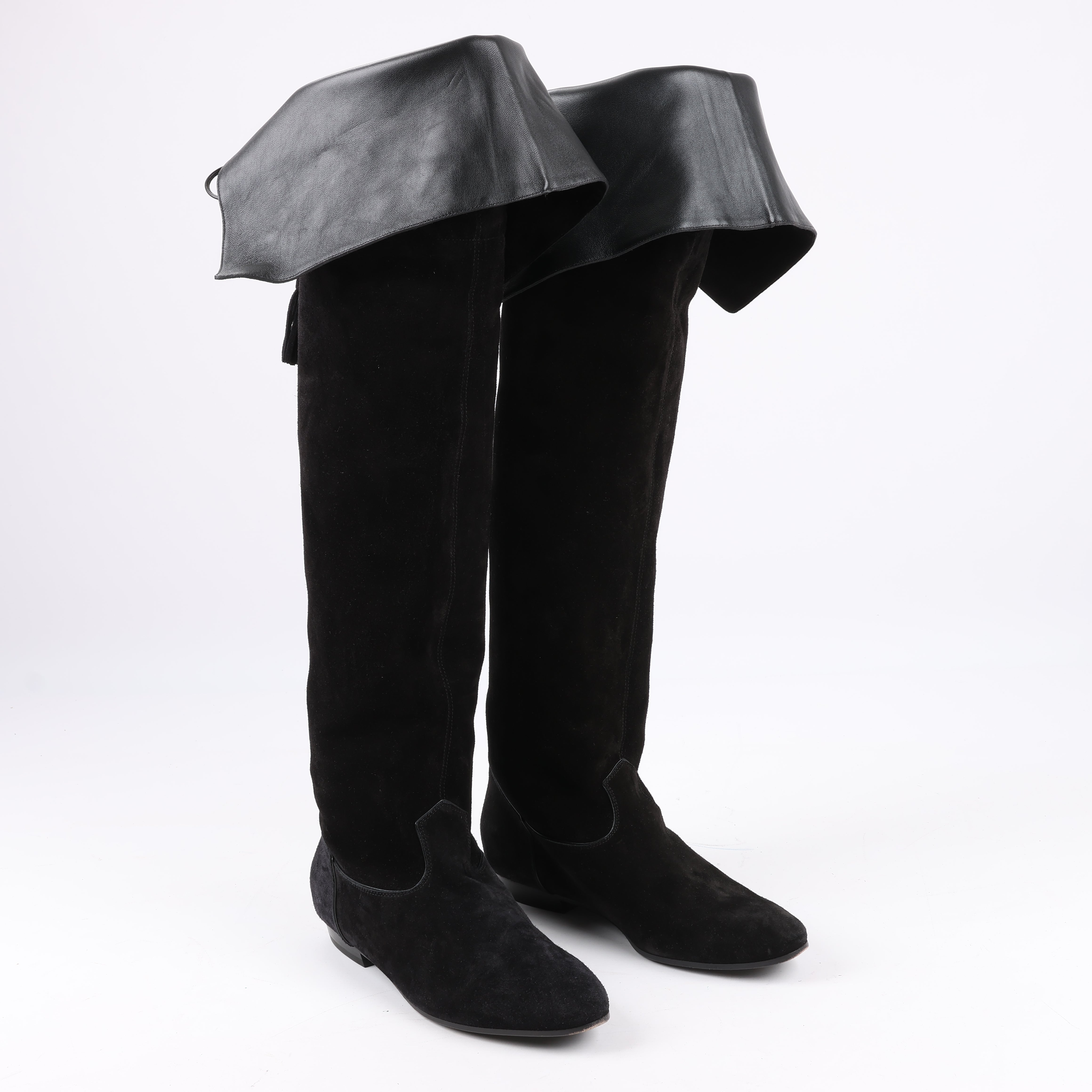 Celine Chat Botté Over-The-Knee Flat Boots in Suede Calfskin, Size 38 (RM0220), exude timeless elegance with their luxurious black suede and signature fold-over leather cuff. A chic, flat-soled silhouette ensures comfort without compromising style.