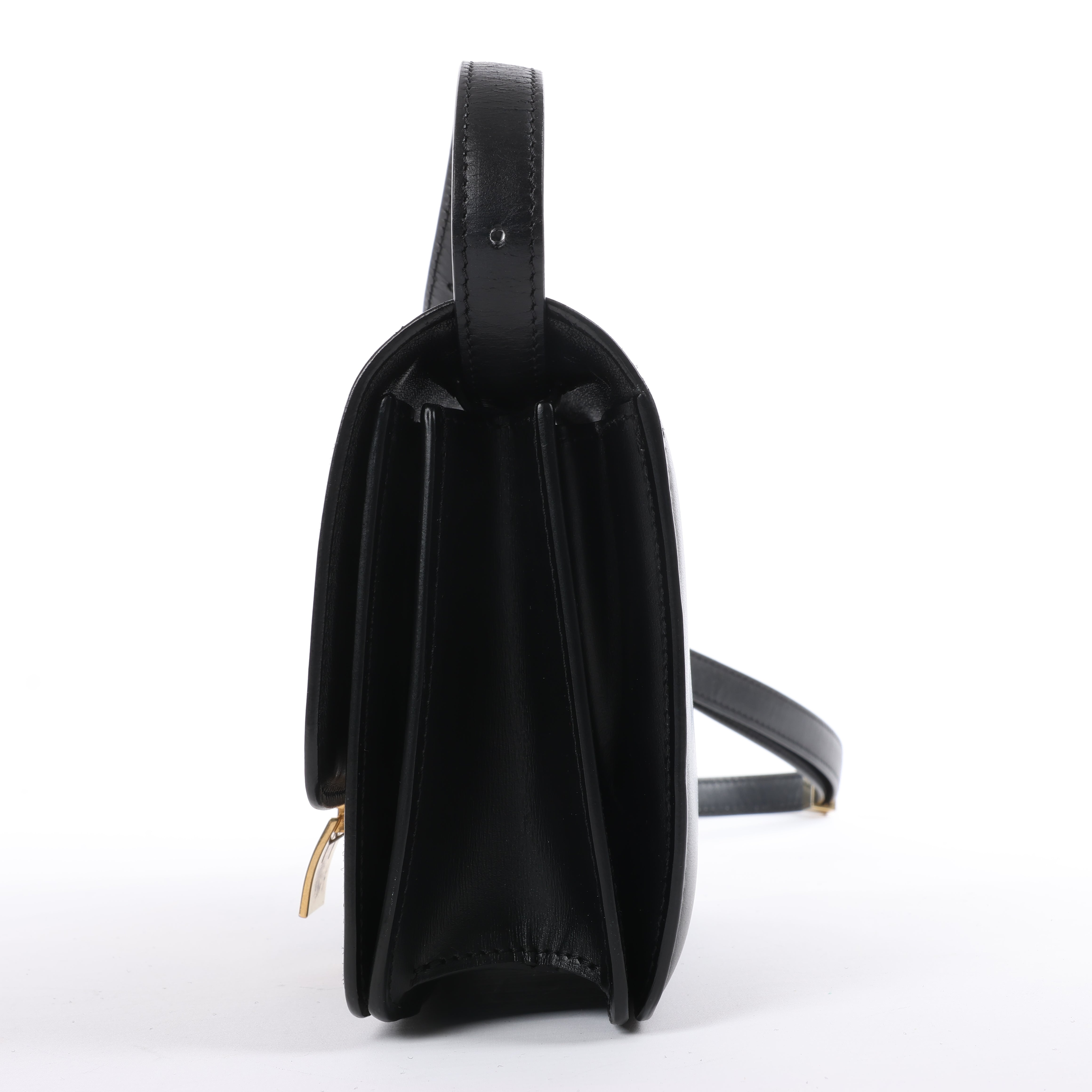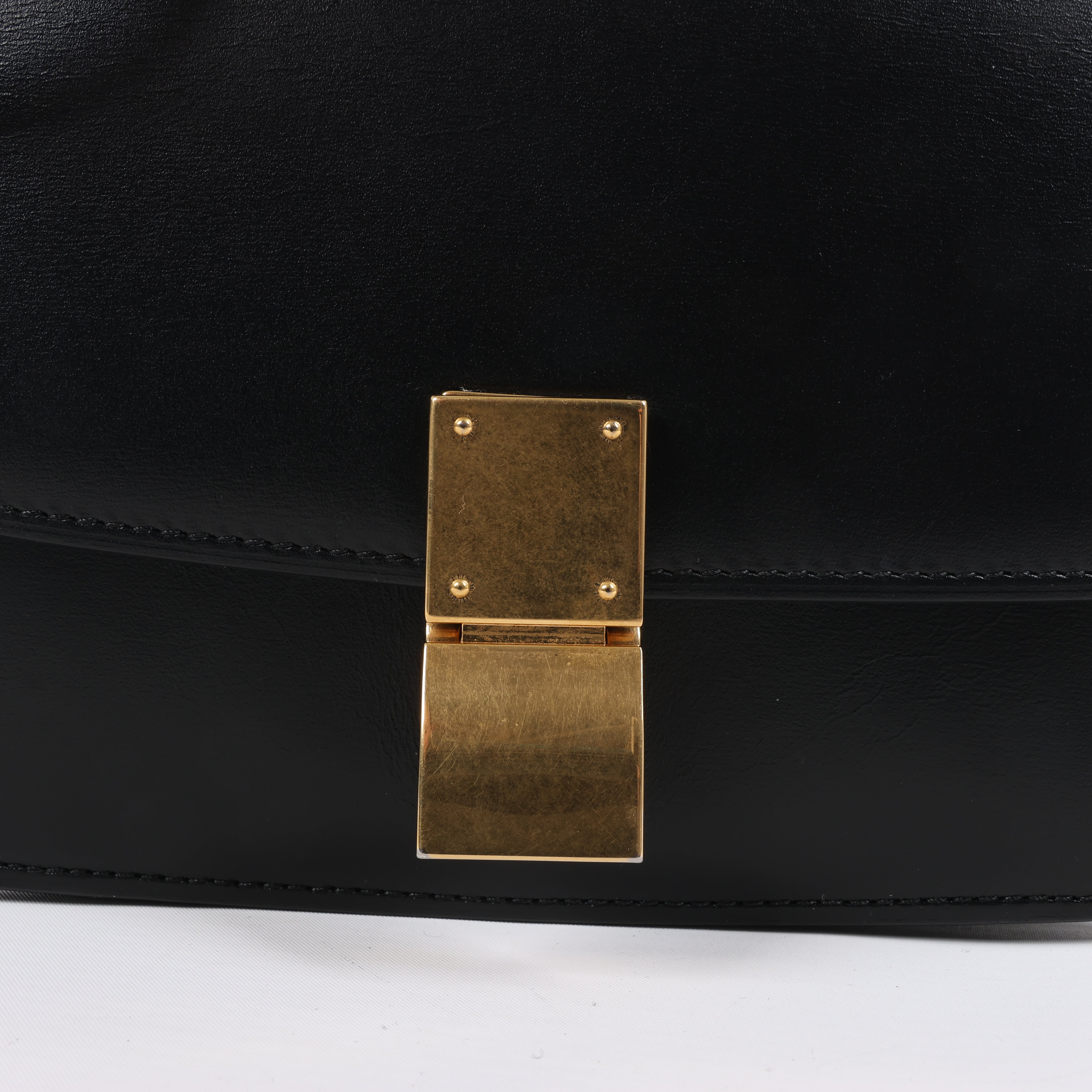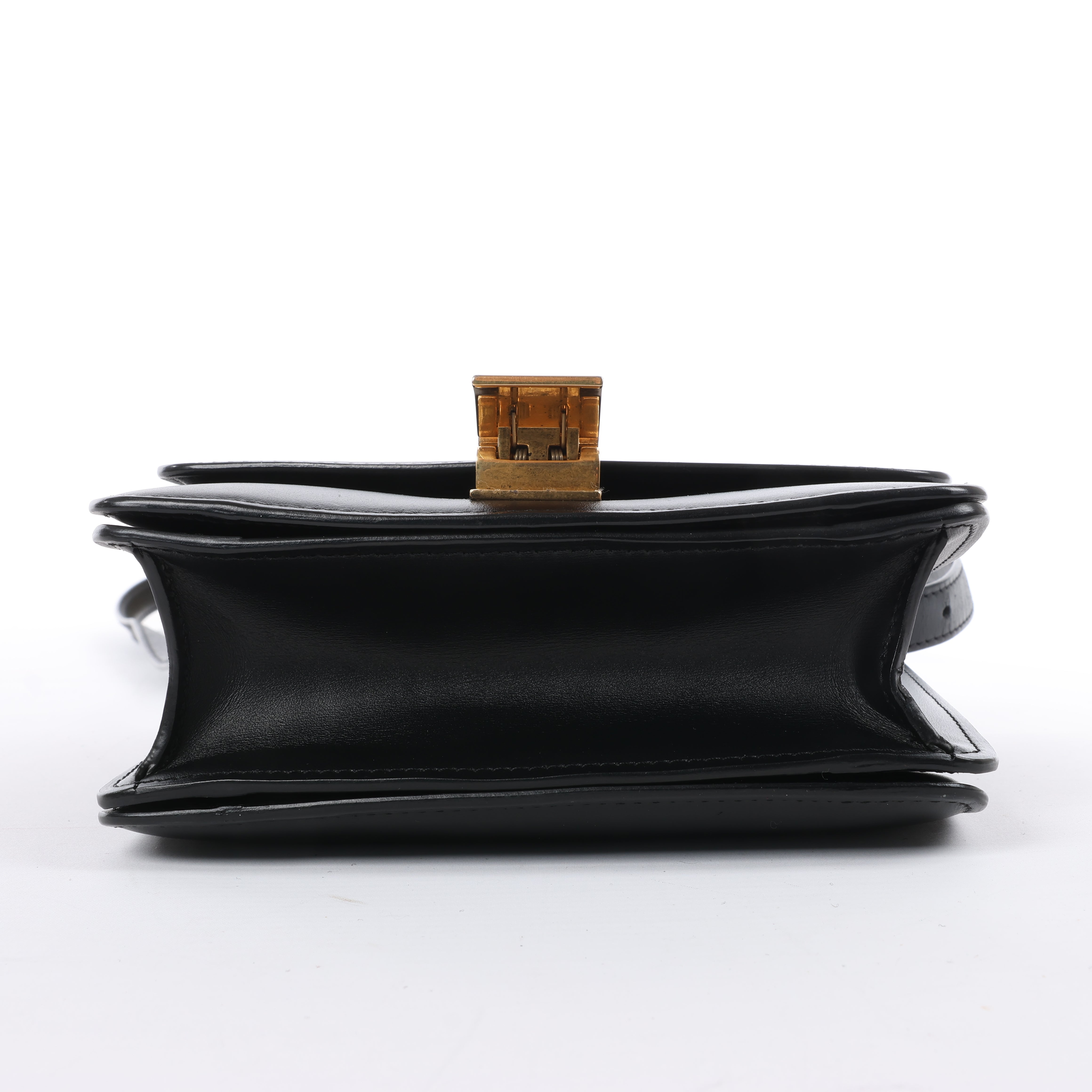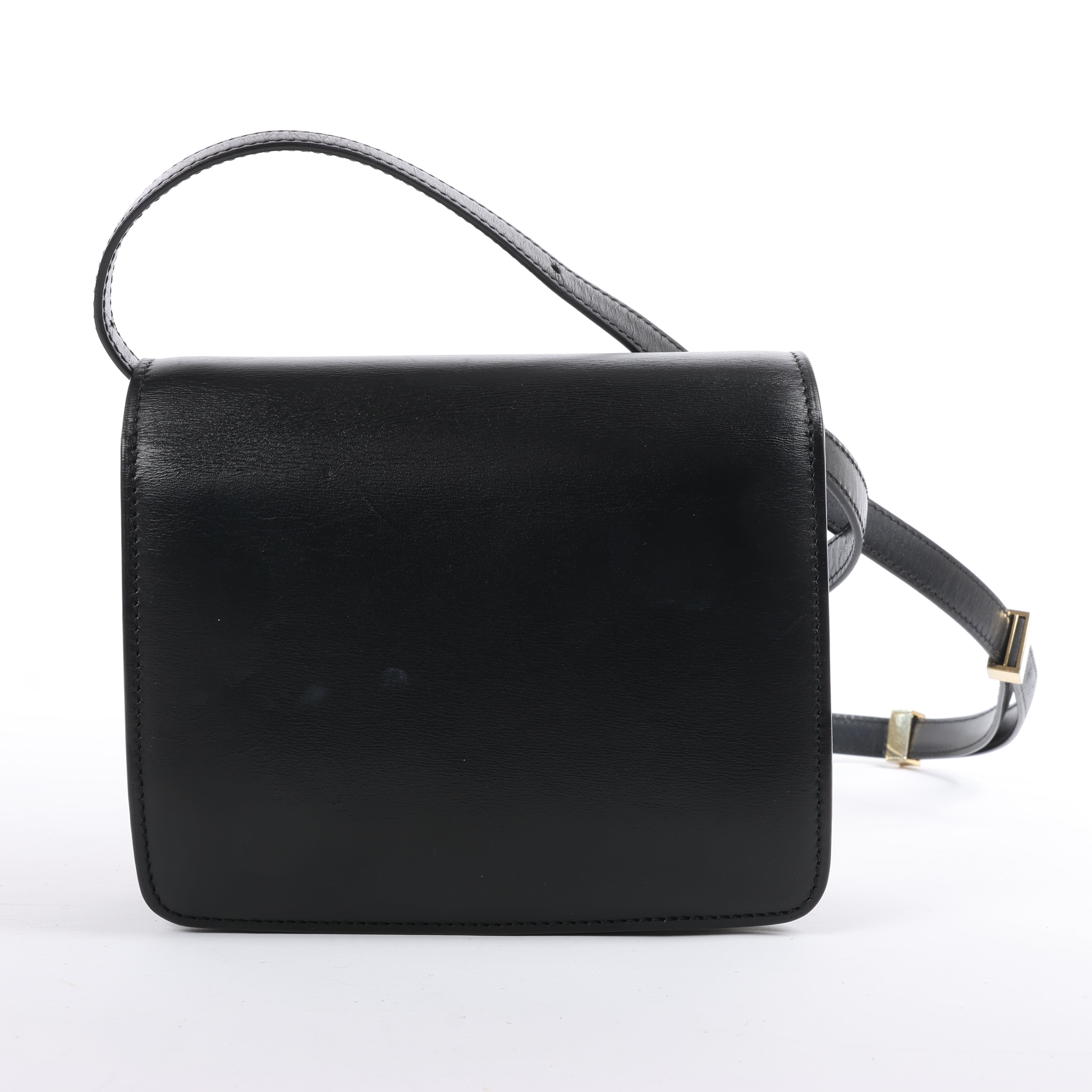 Brand: CELINEModel: Classic BoxSize: SmallWidth: 16.5 cmHeight: 14.5 cmExterior Condition: ExcellentInterior Condition: ExcellentCondition Details: The exterior leather is beautiful in excellent condition. The strap is in good condition. The hardware has light surface scratches but remains bright. The interior leather is clean and in excellent condition.Colour: BlackInterior Colour: BlackHardware Colour: GoldMaterial: LeatherComes With: Entrupy certificate