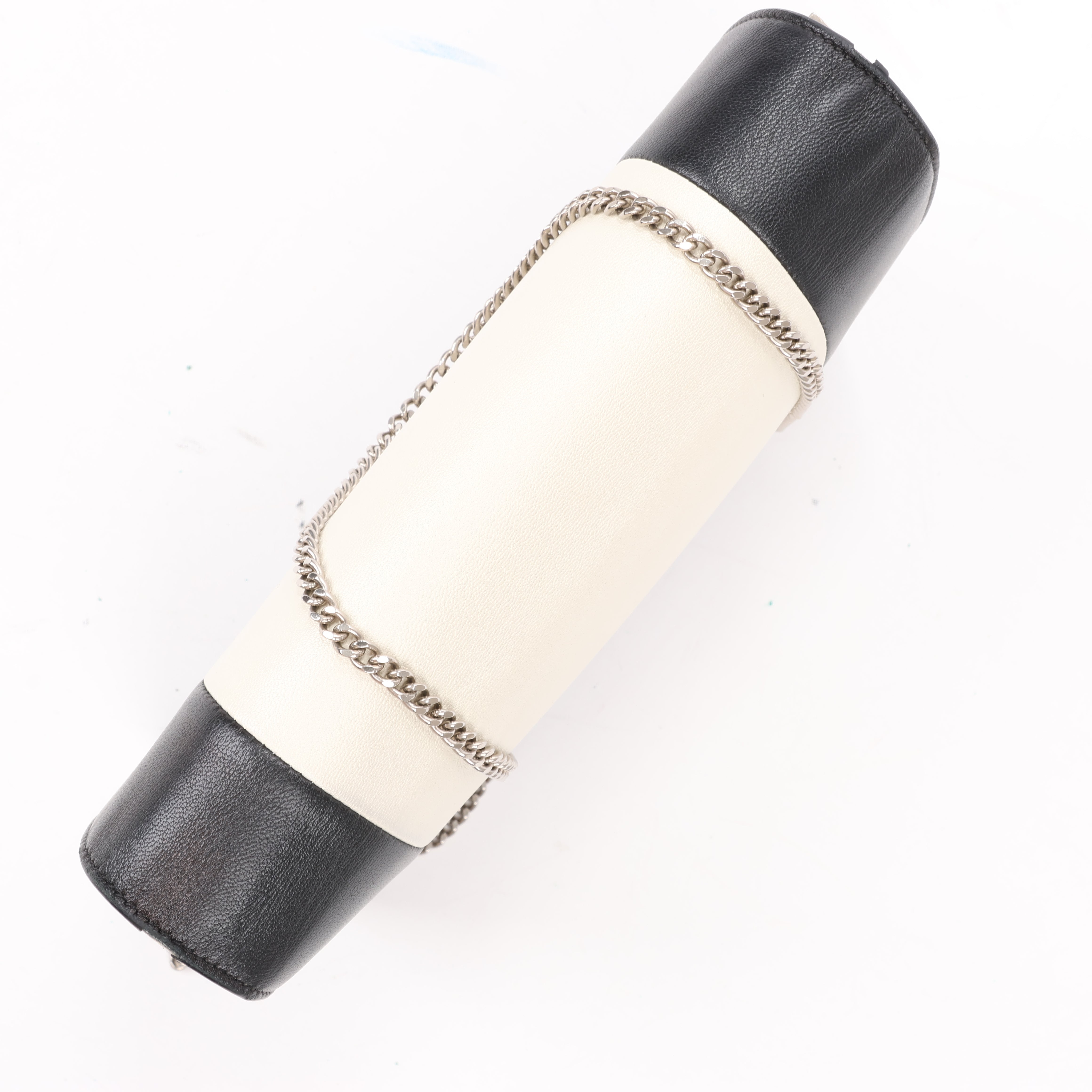 The Celine Frame Evening Leather Chain Shoulder Bag in Black × White boasts a chic two-tone design with smooth leather. Its silver-tone chain adds elegance, making it ideal for evening outings. A blend of minimalist style with sophisticated details.