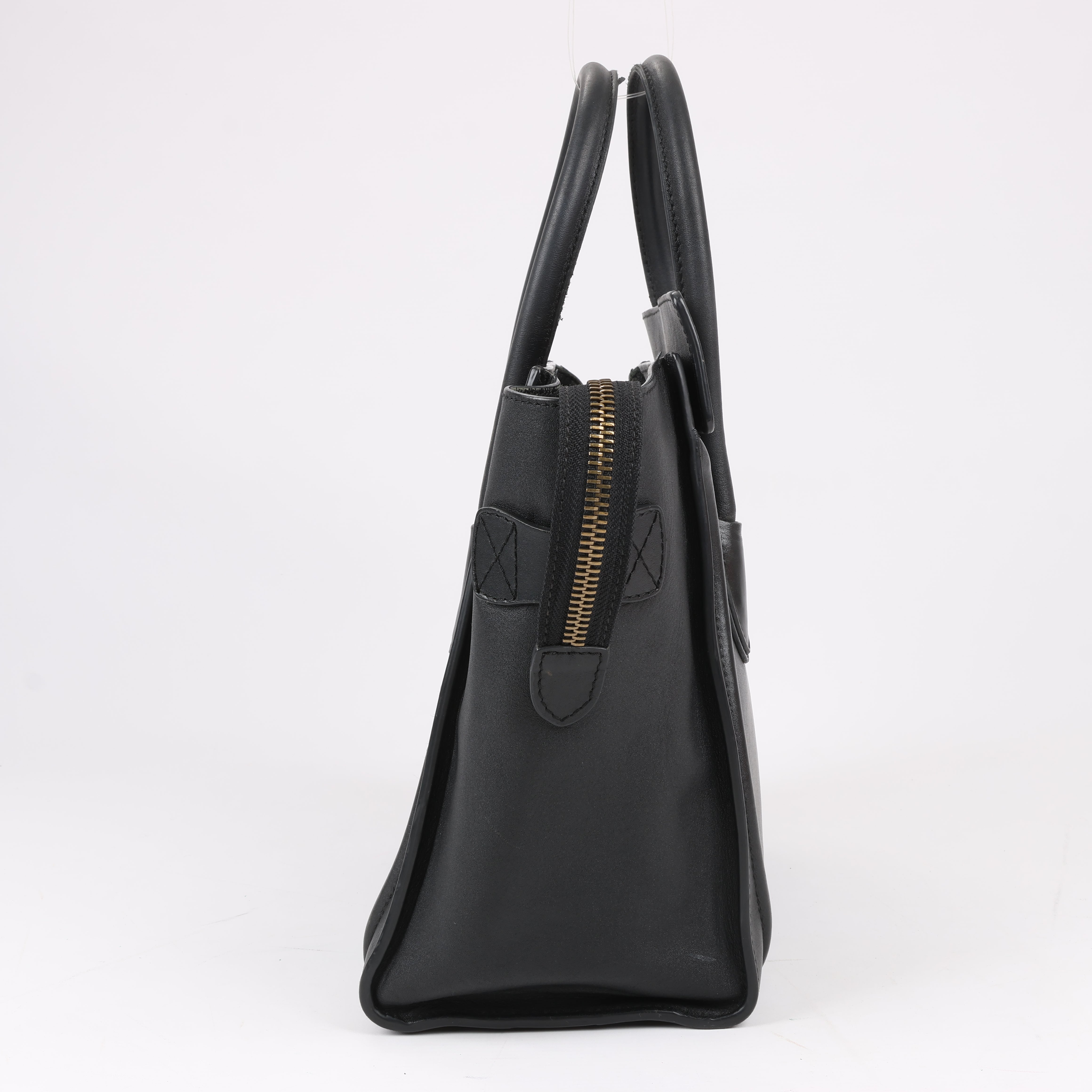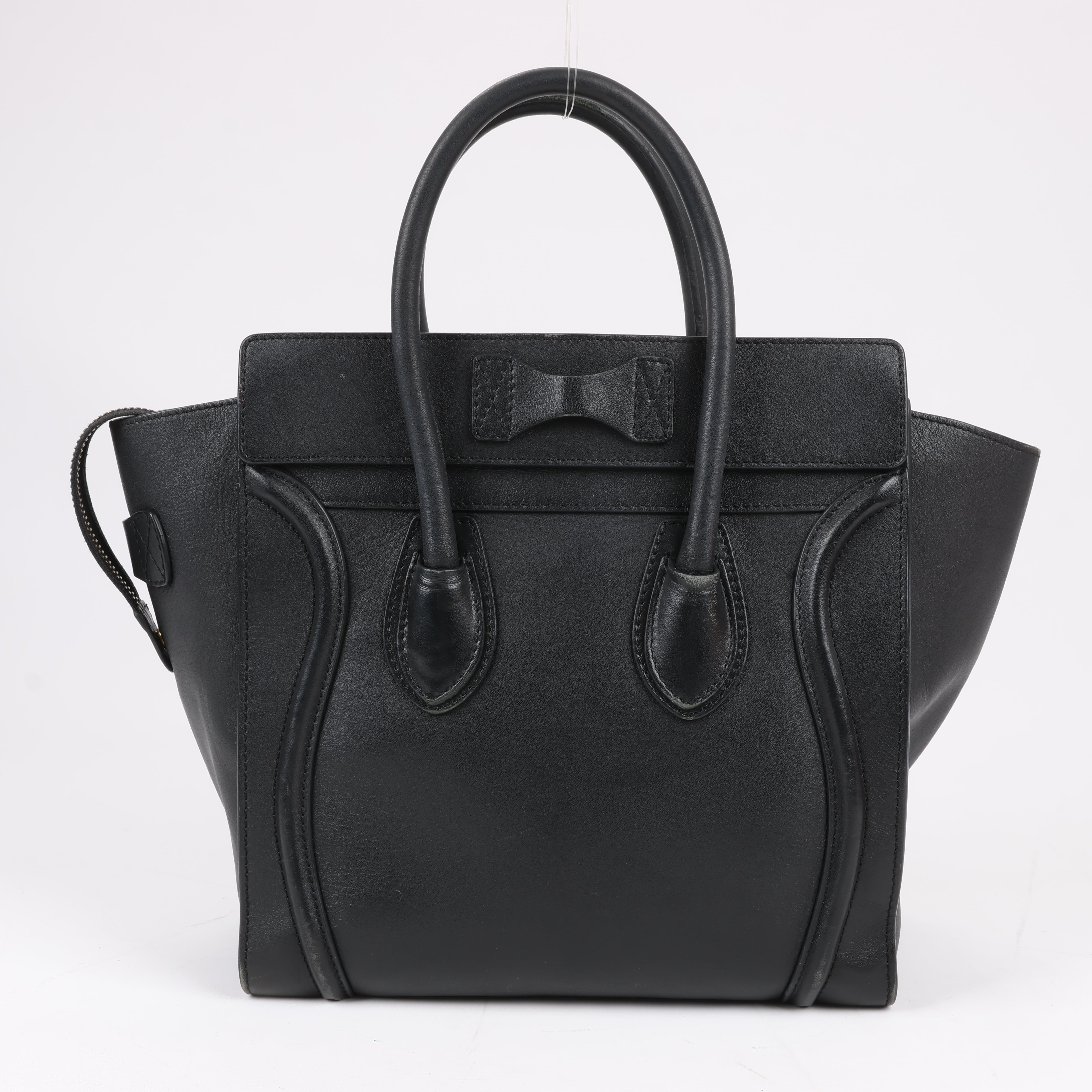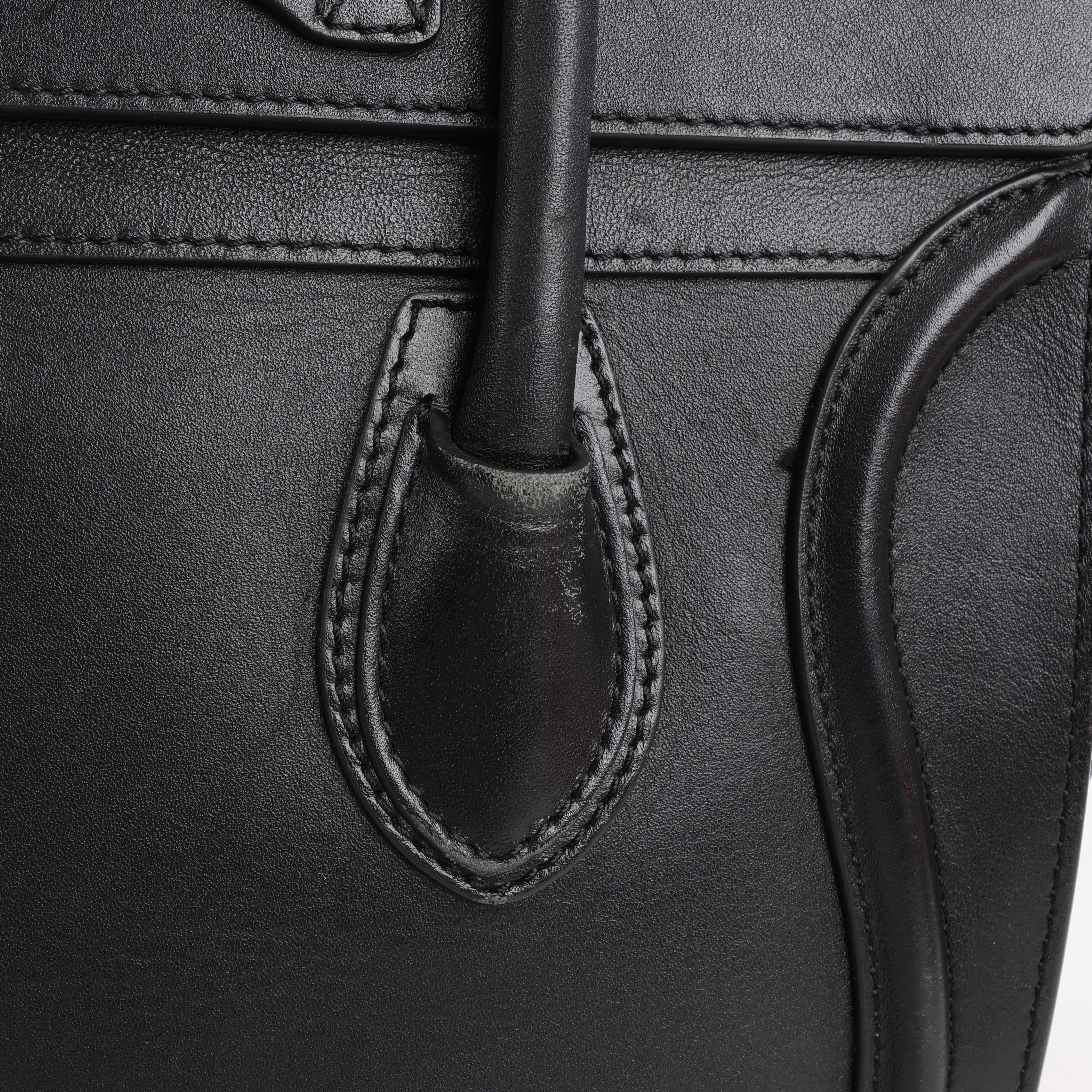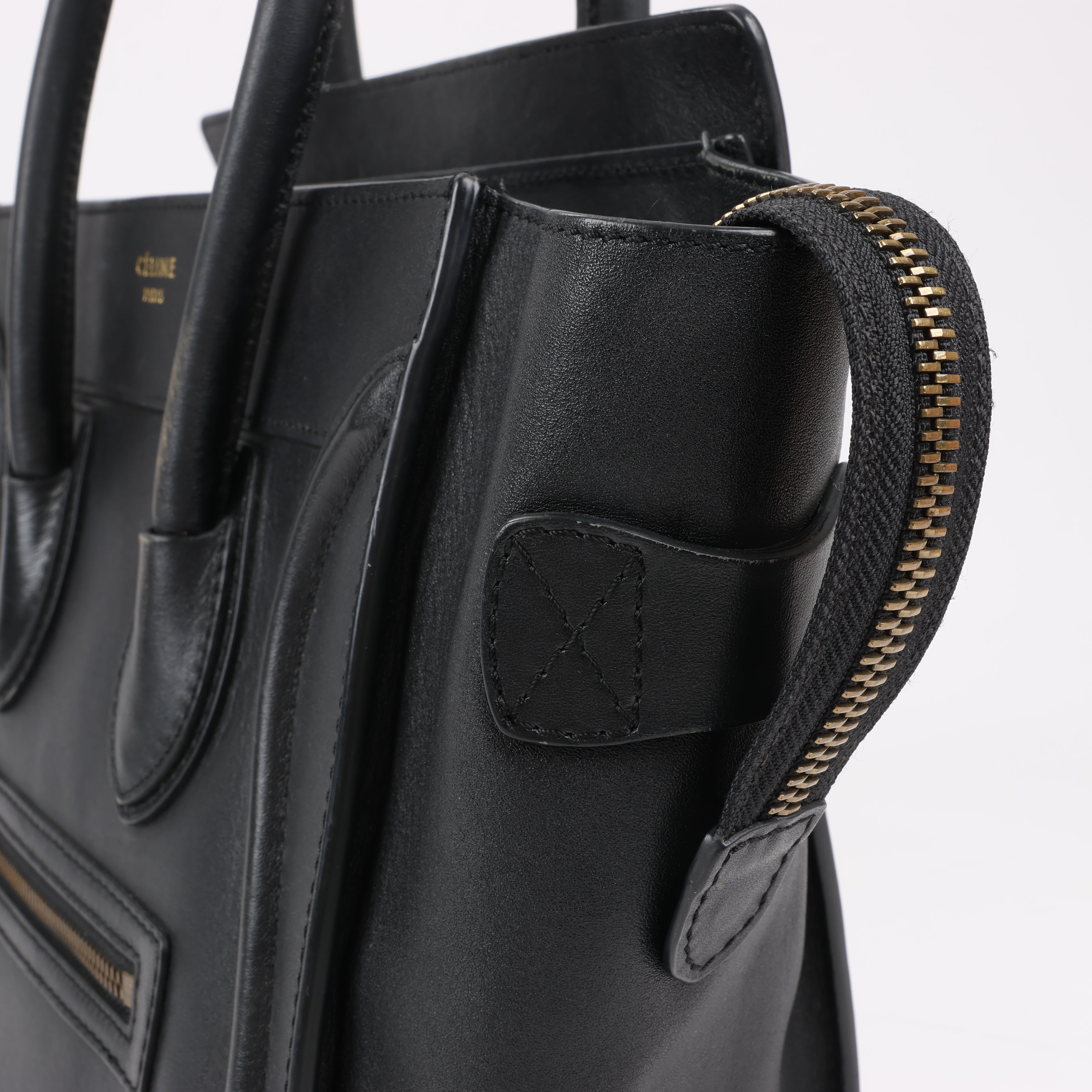 The CELINE Luggage Micro Leather Handbag in Black is a timeless icon, featuring smooth, high-quality leather with the brand's signature winged sides. Its spacious interior and distinctive front zip pocket make it both stylish and practical for everyday use.