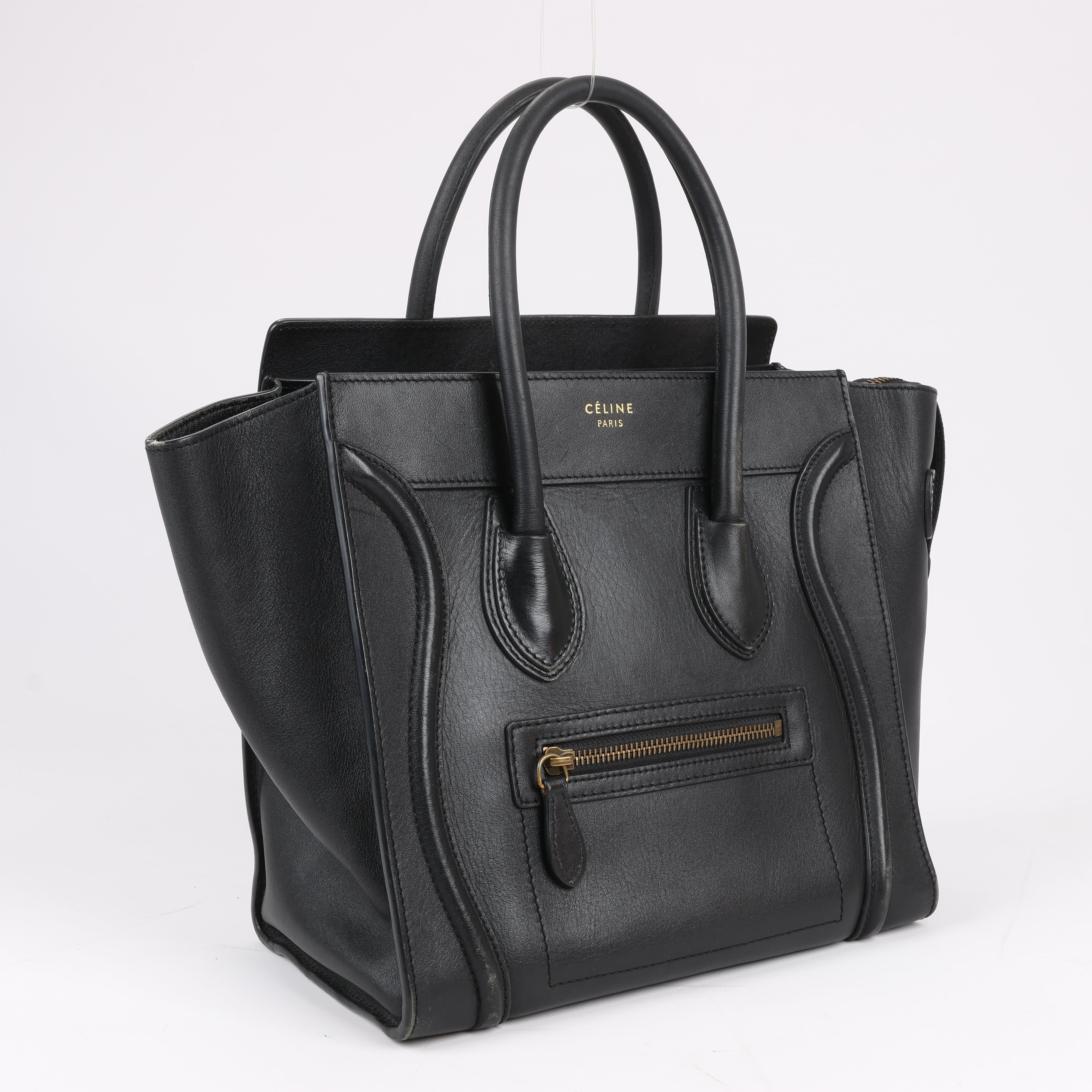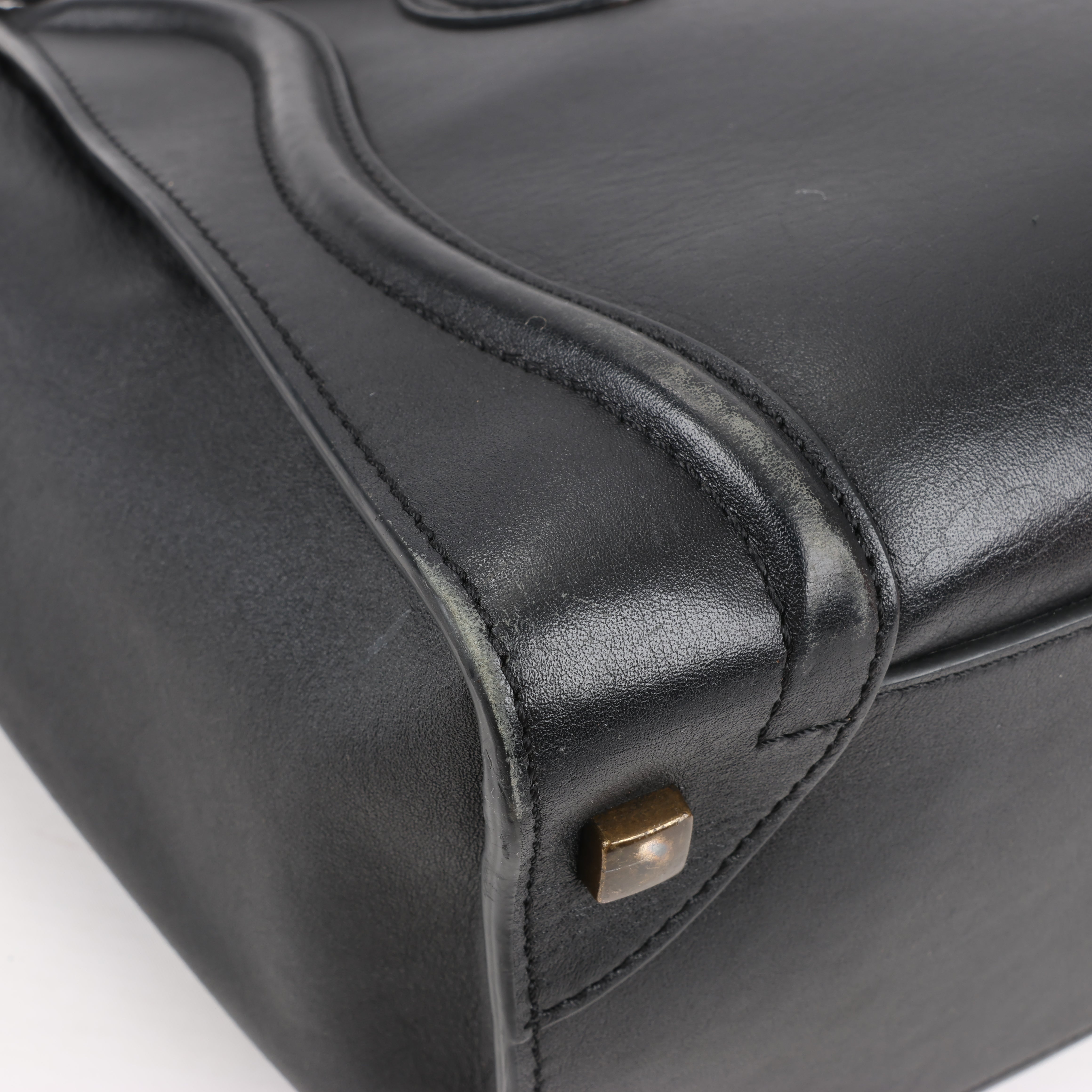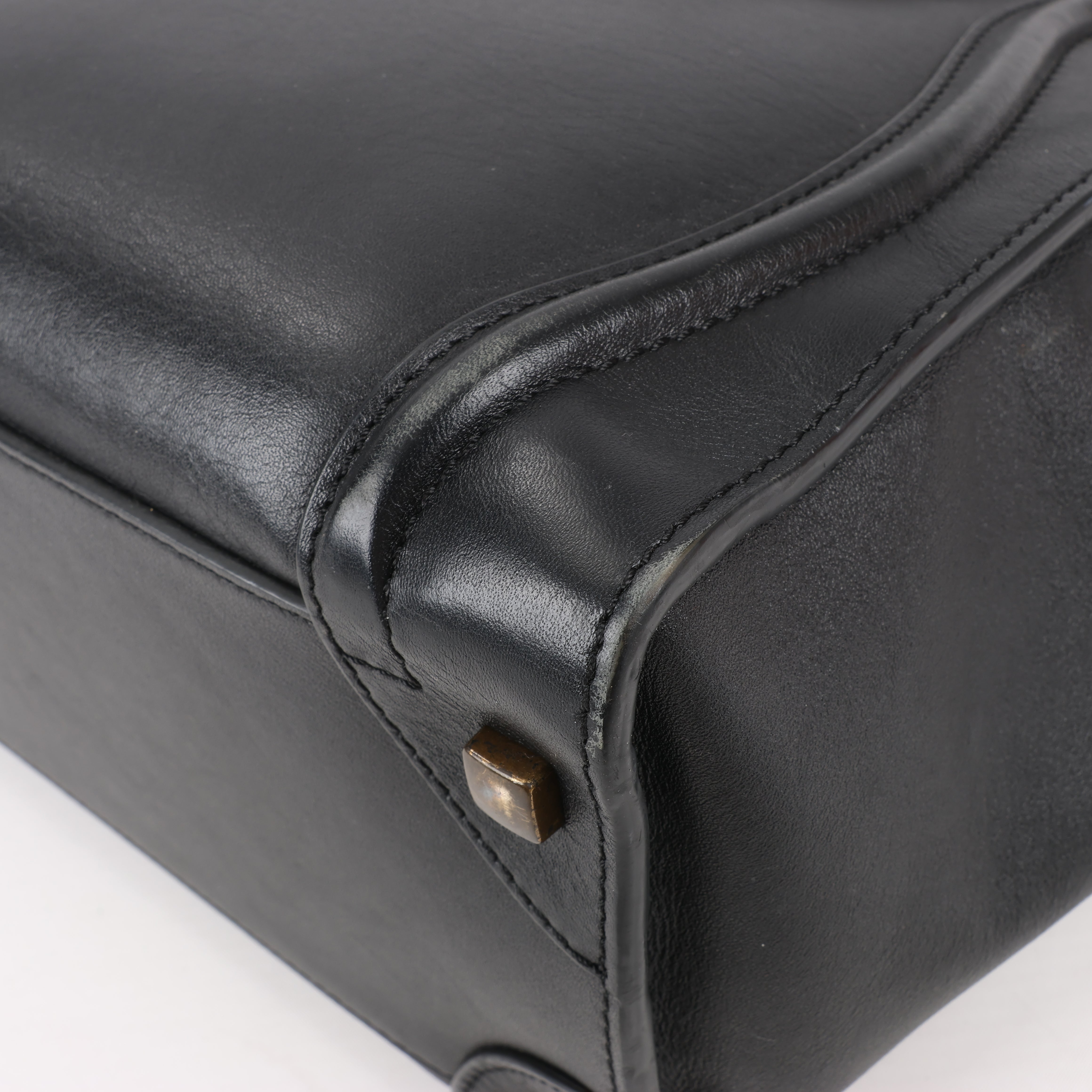 The CELINE Luggage Micro Leather Handbag in Black is a timeless icon, featuring smooth, high-quality leather with the brand's signature winged sides. Its spacious interior and distinctive front zip pocket make it both stylish and practical for everyday use.