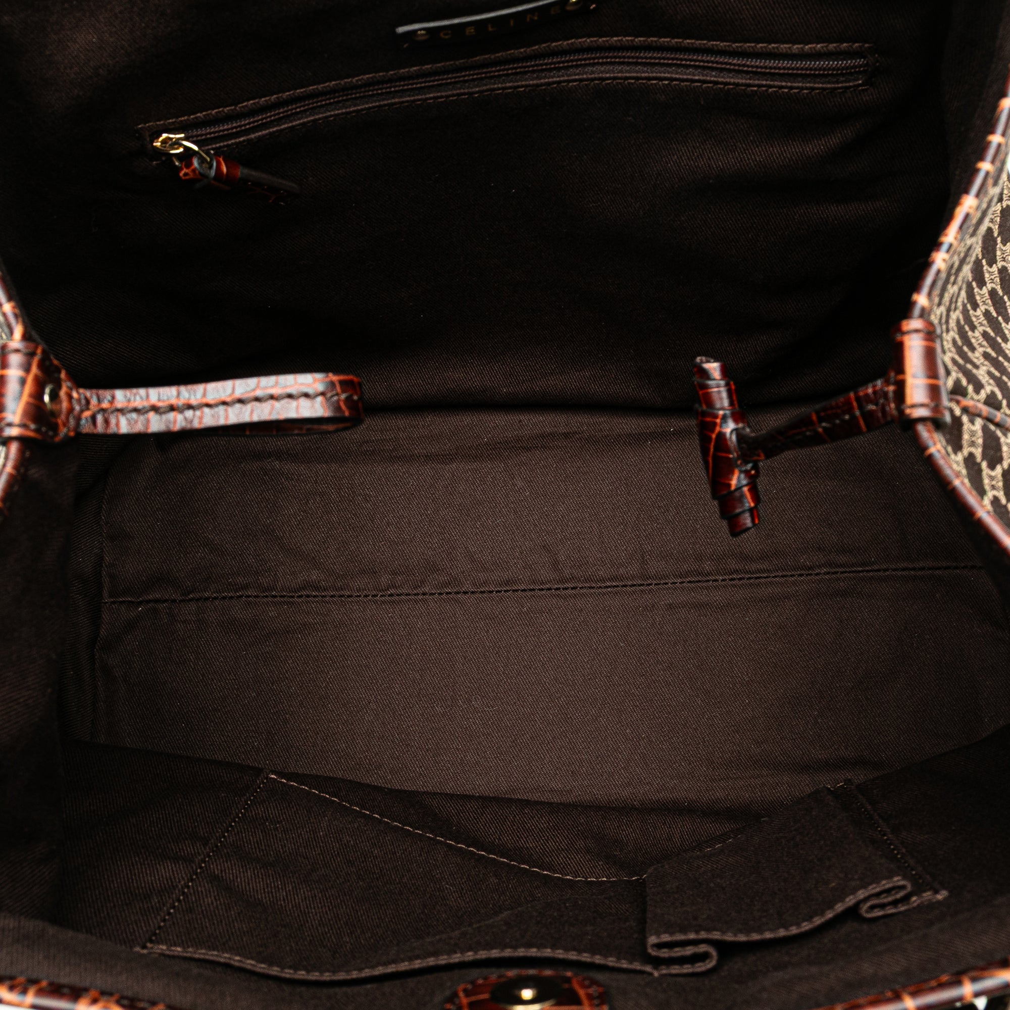 This tote bag features a canvas body with embossed leather trim, flat leather straps, an open top with magnetic and hook closure, and interior zip and slip pockets. Retail Price: 500.00