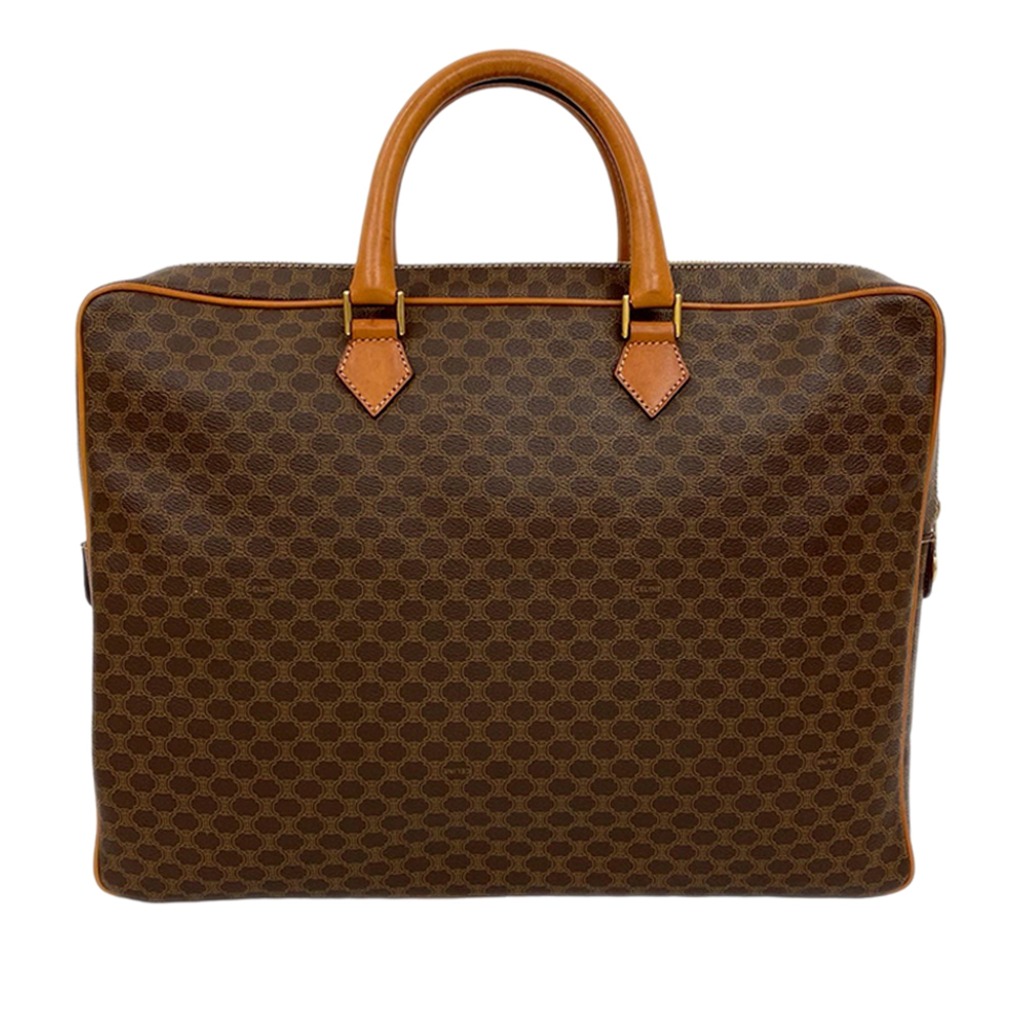 This business bag features a coated canvas body with leather trim, rolled leather top handles, a top zip closure, and exterior front zip pockets. Retail Price: 1240.00