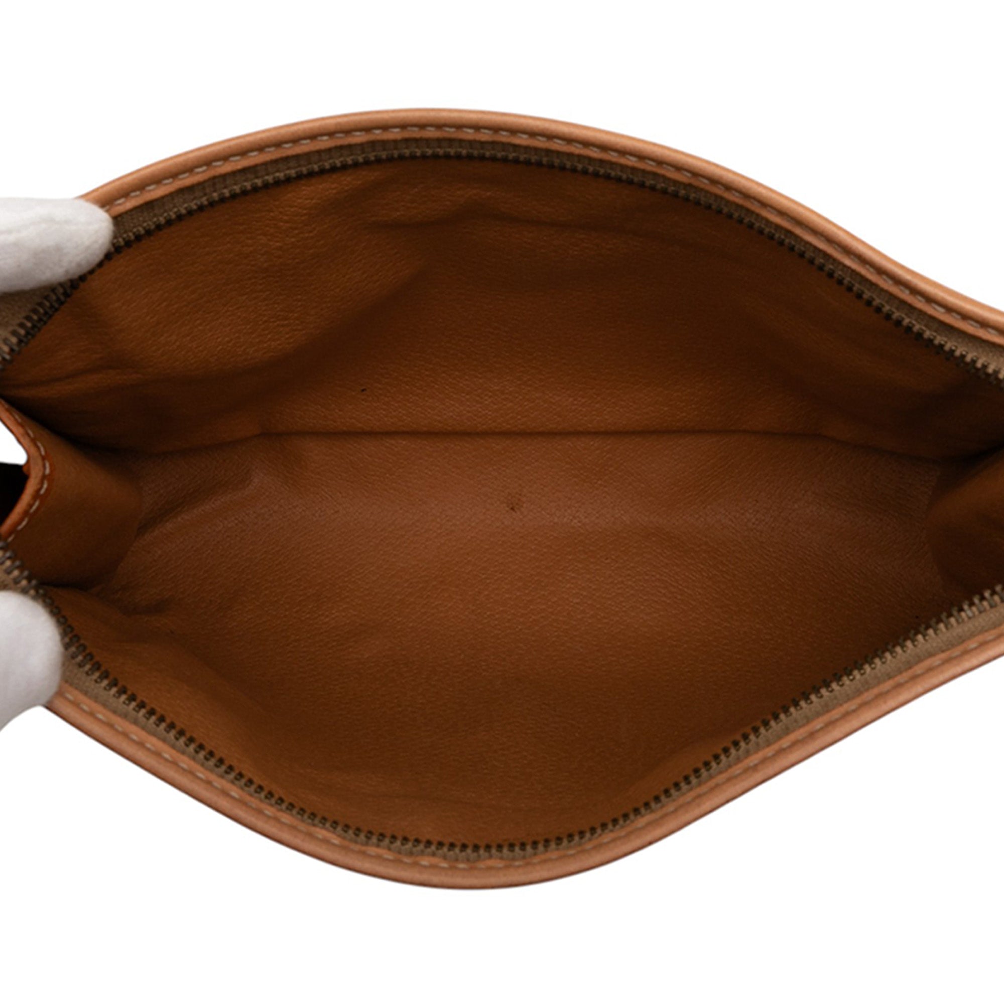 This clutch features a coated canvas body with leather trim, a top zip closure, and an exterior front slip pocket. Retail Price: 525.00