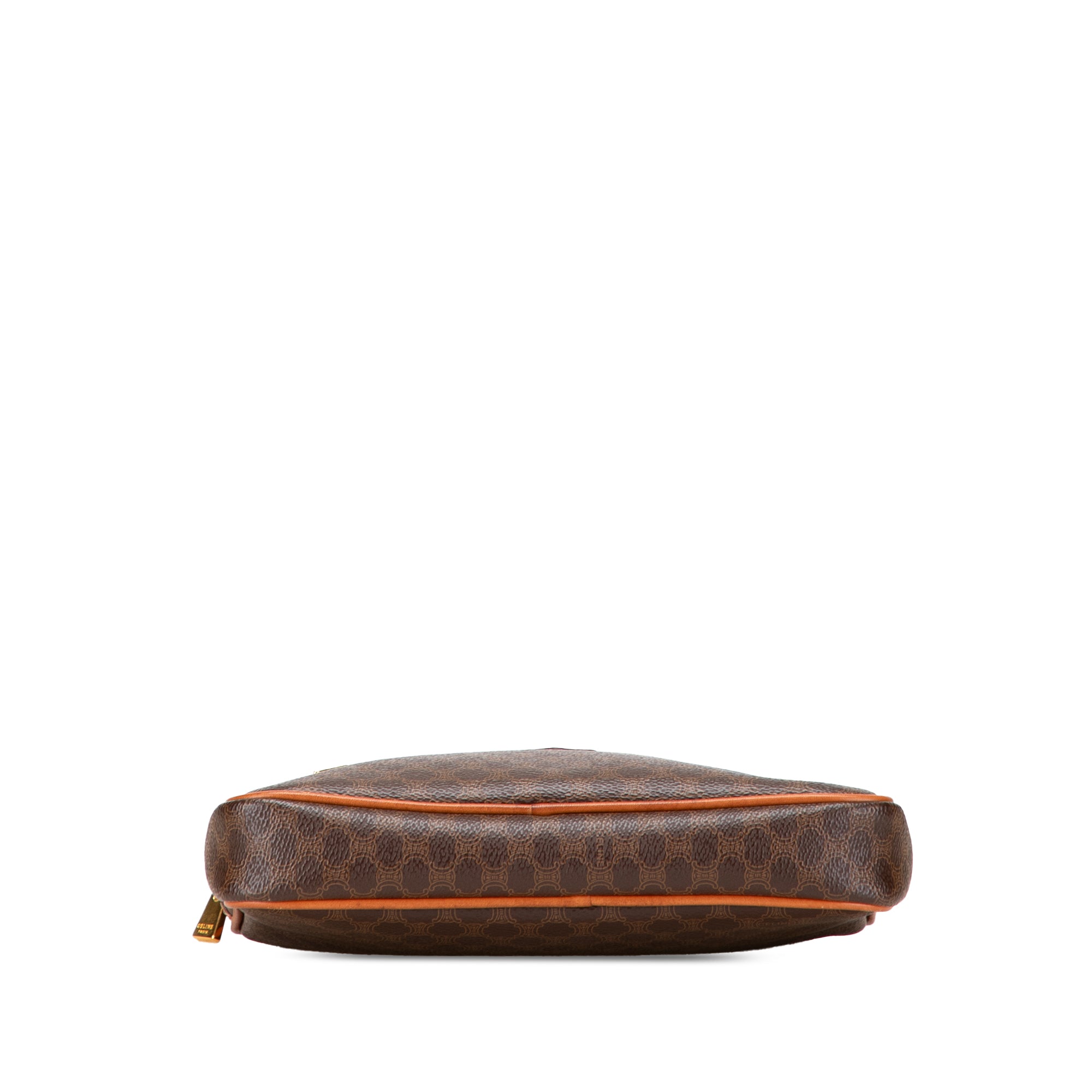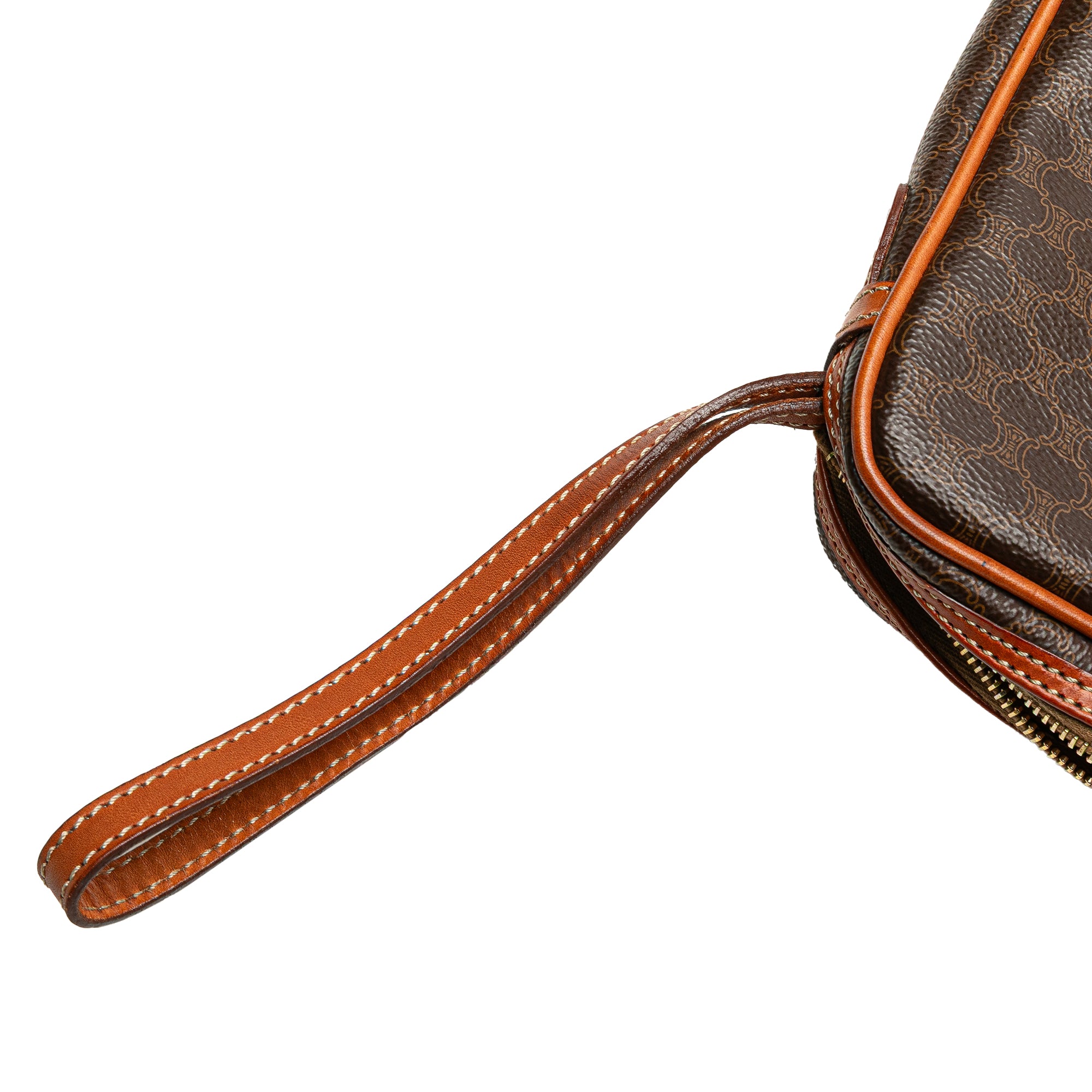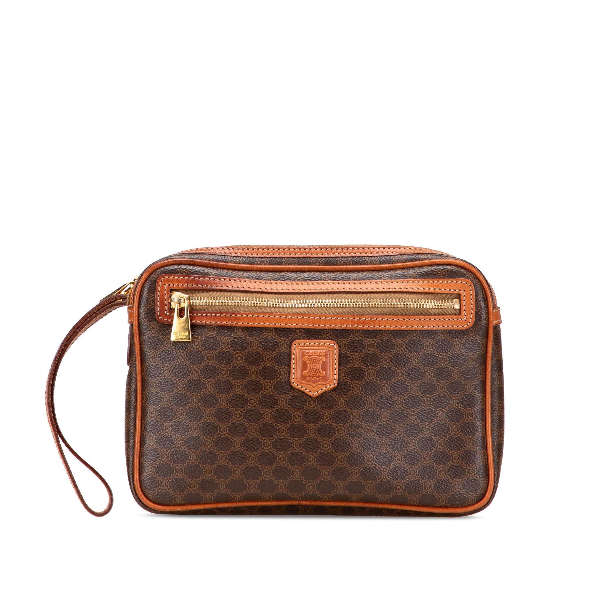 This clutch bag features a coated canvas body with leather trim, a flat leather wrist strap, a top zip closure, an exterior zip pocket, and interior zip and slip pockets. Retail Price: 450.00