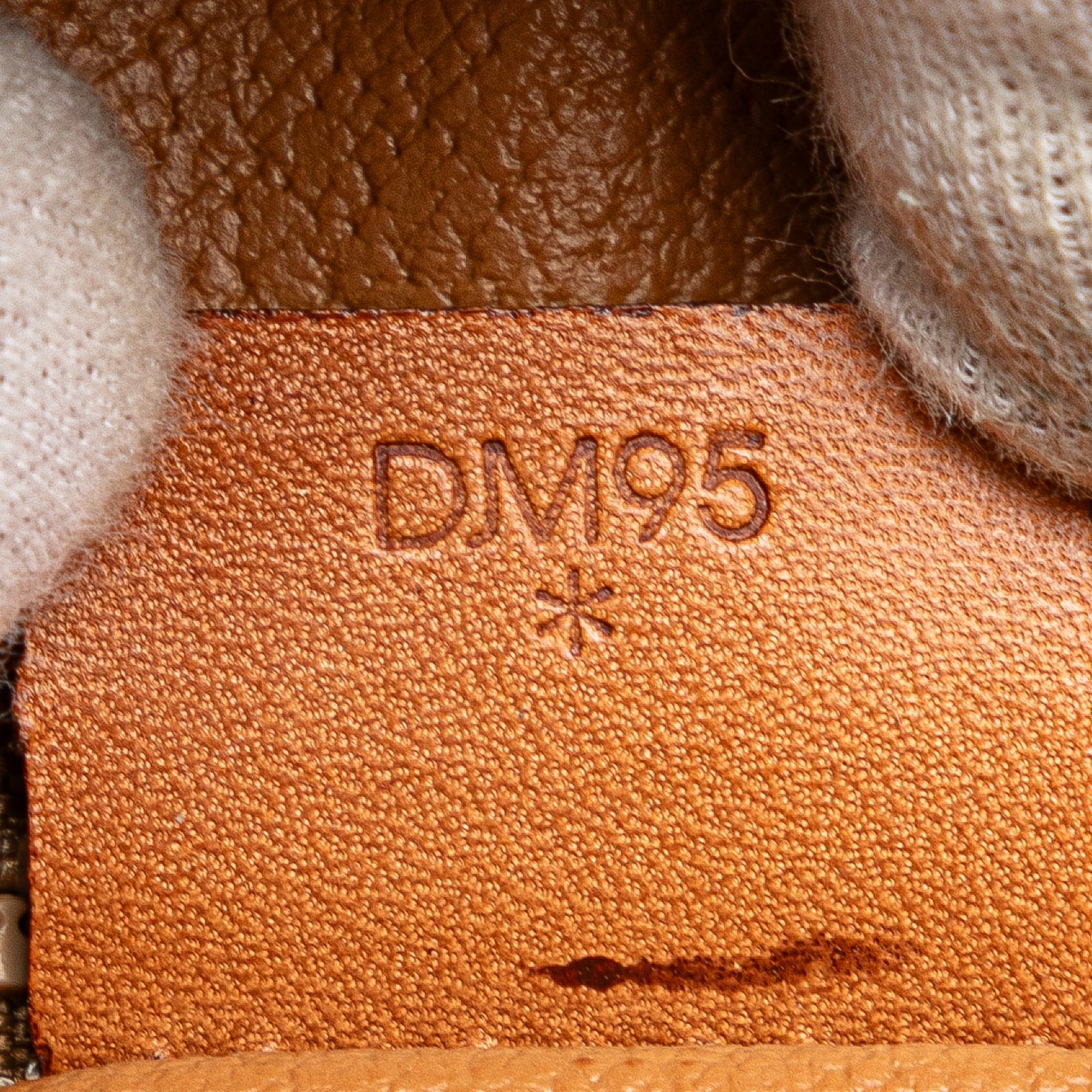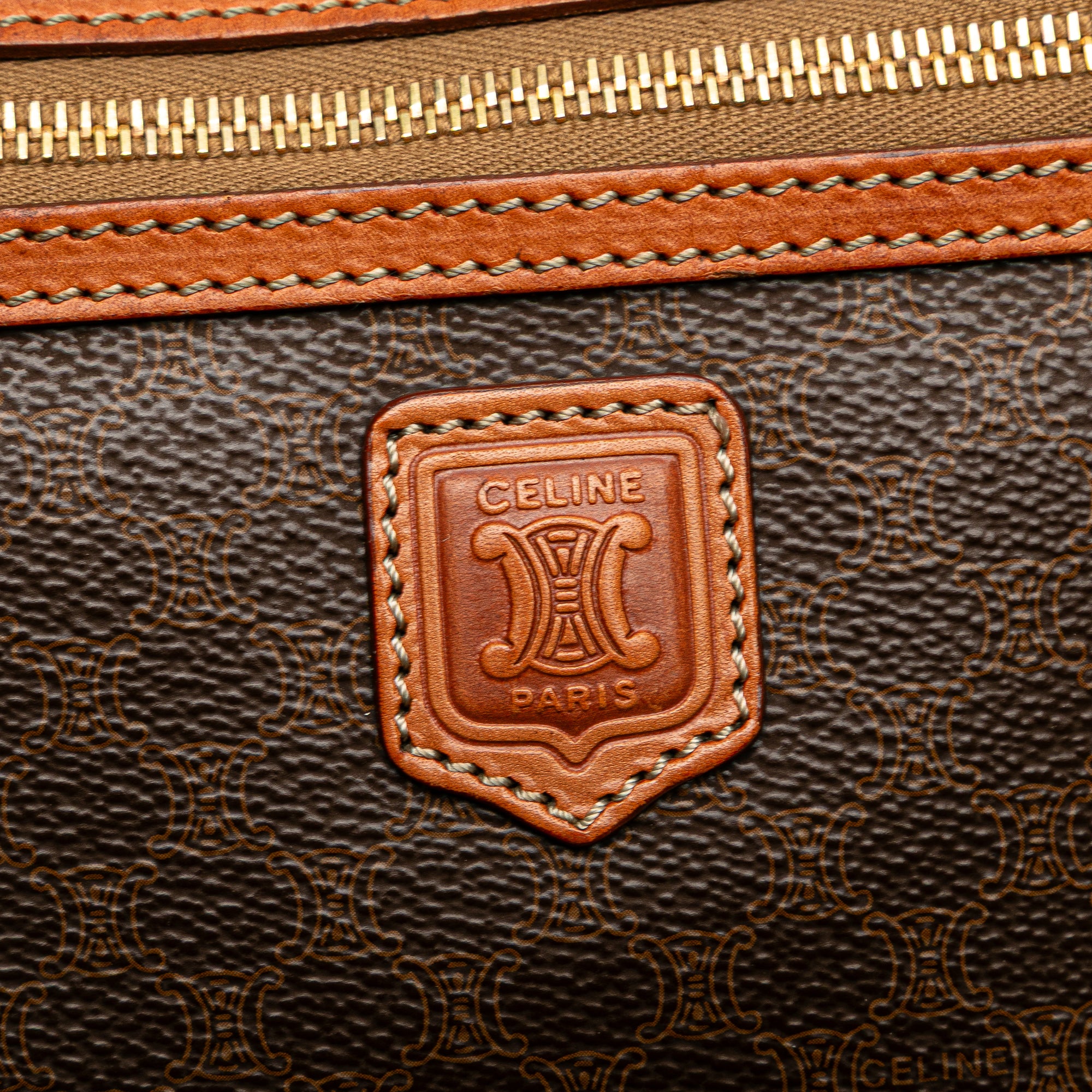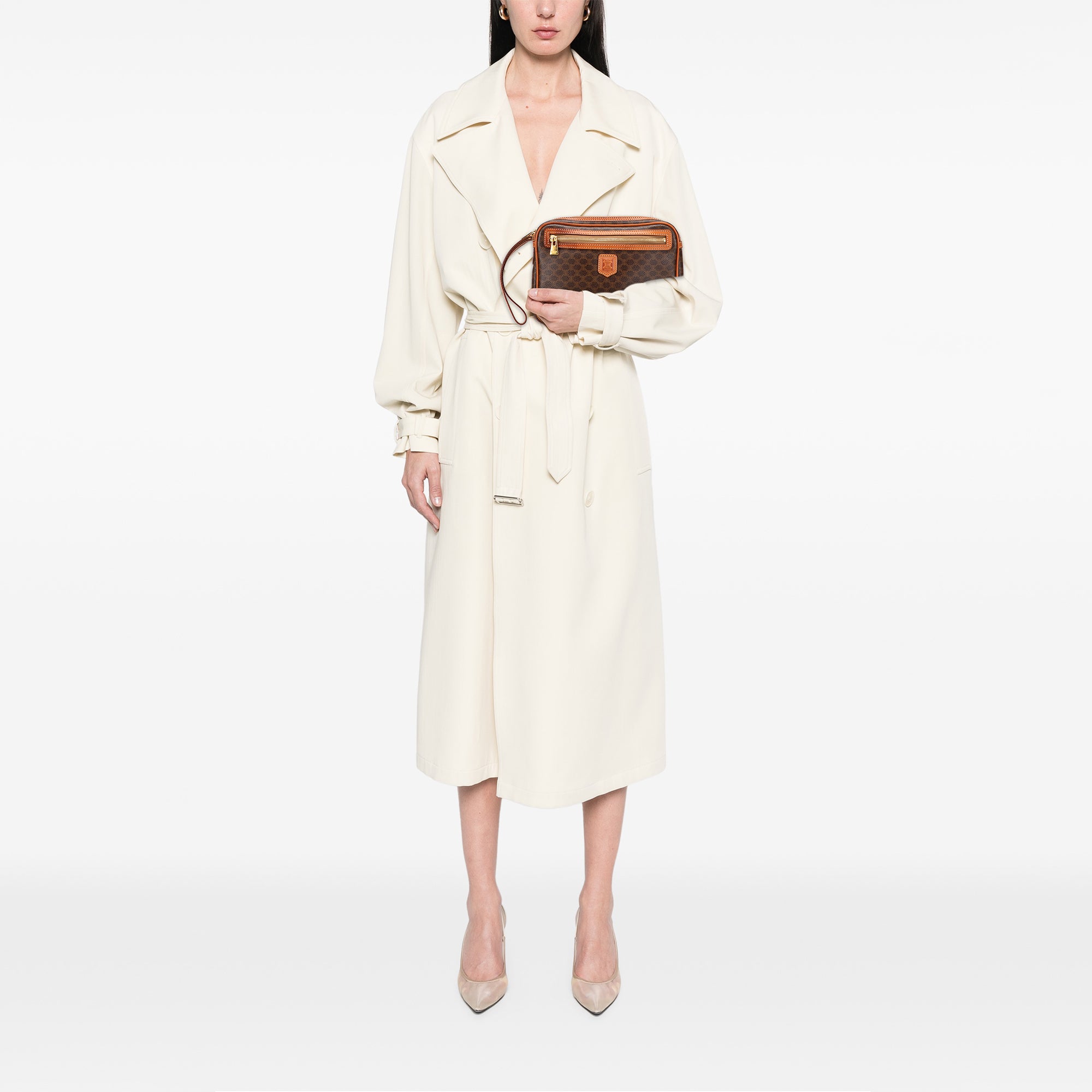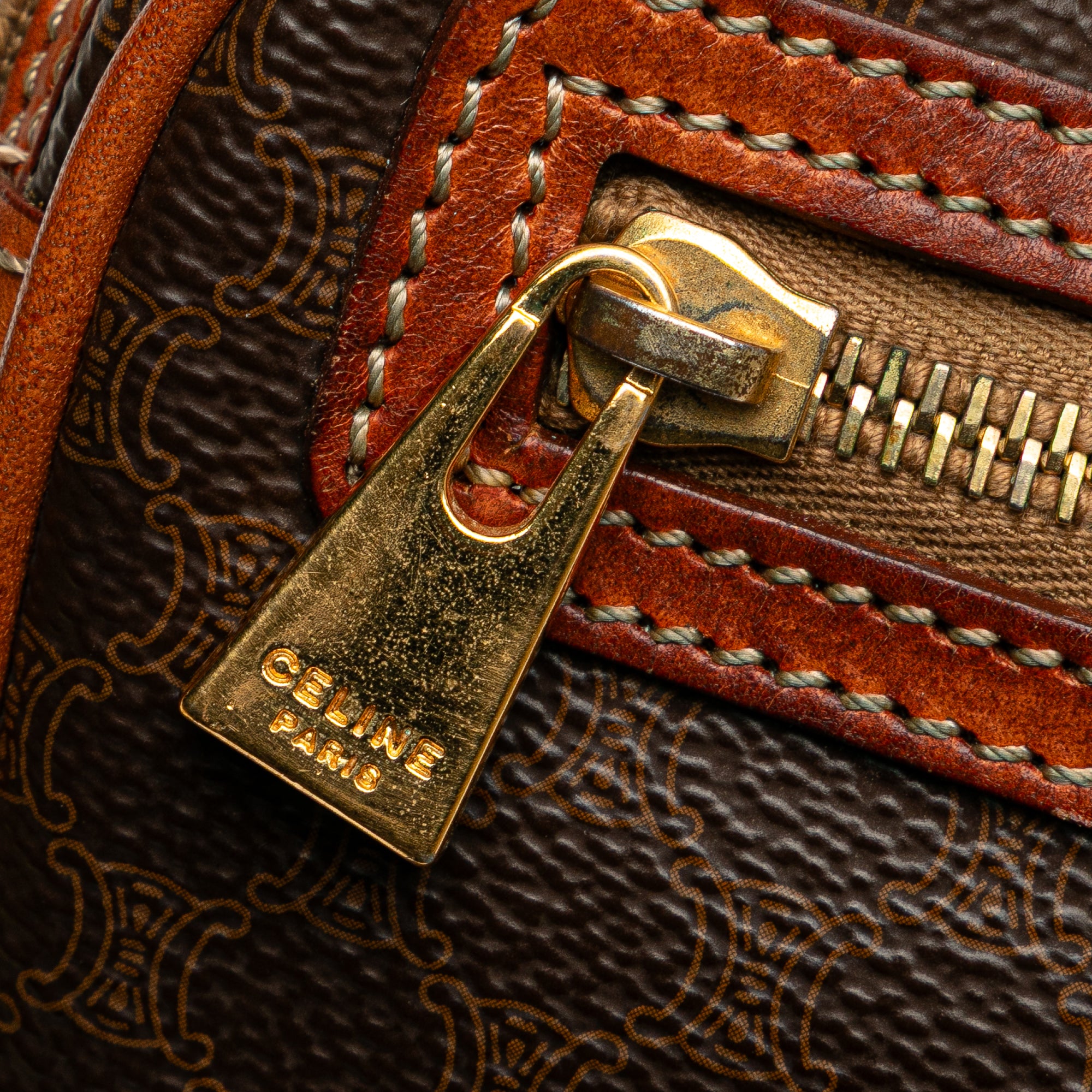 This clutch bag features a coated canvas body with leather trim, a flat leather wrist strap, a top zip closure, an exterior zip pocket, and interior zip and slip pockets. Retail Price: 450.00