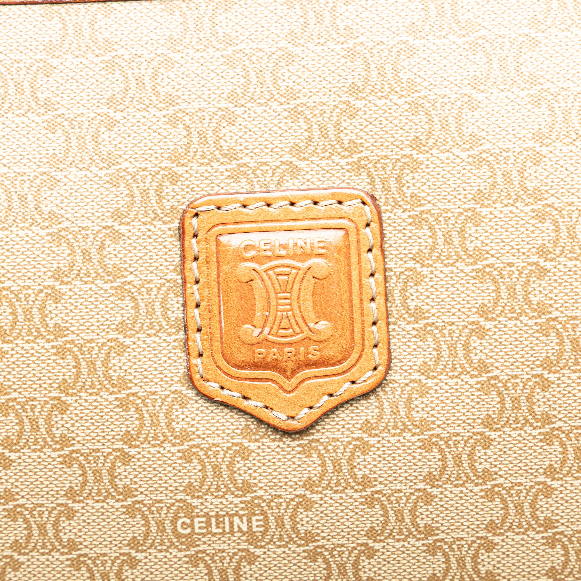 This clutch bag features a coated canvas body with leather trim, a flat leather wrist strap, a top zip closure, an exterior front zip pocket, and an interior zip pocket. Retail Price: 489.00