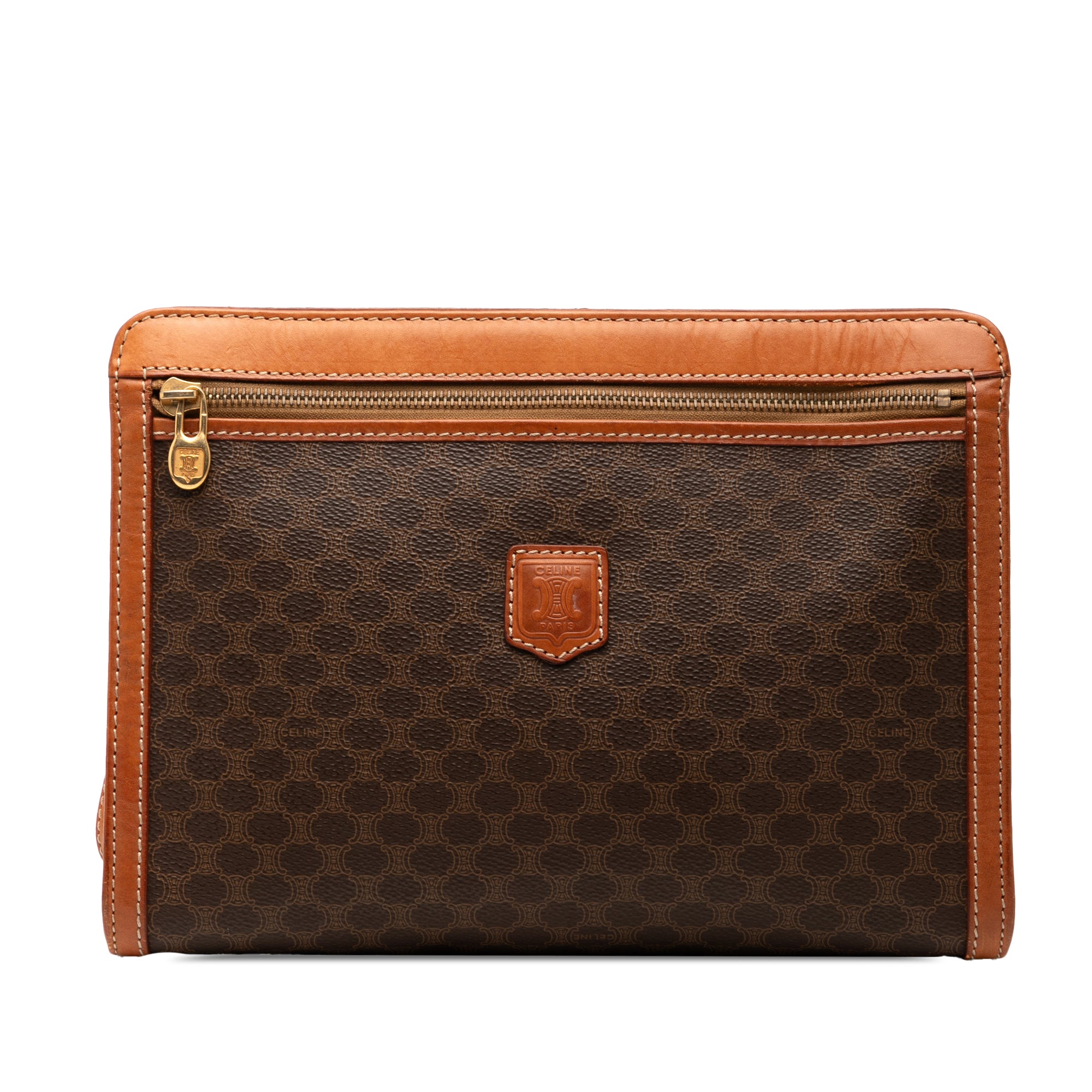 This clutch bag features a coated canvas body with leather trim, a flat leather wrist strap, a top zip closure, exterior front zip and back slip pockets, and an interior zip pocket. Retail Price: 482.00
