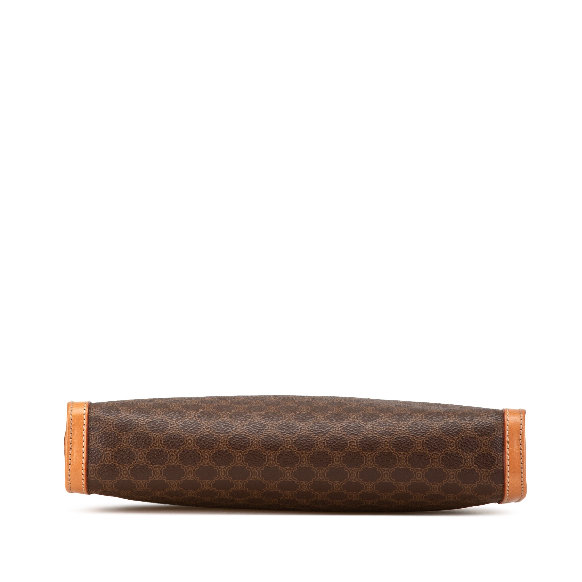 This clutch bag features a coated canvas body with leather trim, a flat leather wrist strap, a top zip closure, exterior zip and slip pockets, and an interior zip pocket. Inclusion: Dust bag. Retail Price: 495.00