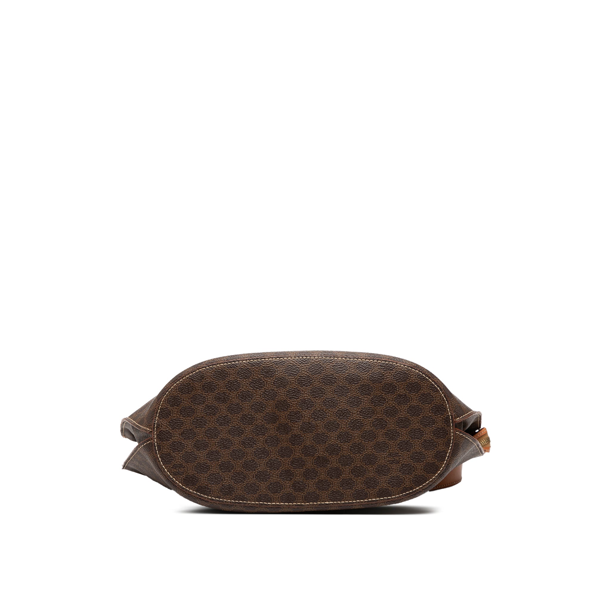 This shoulder bag features a coated canvas body with leather trim, flat leather straps, a top zip closure, and an interior zip pocket. Retail Price: 990.00