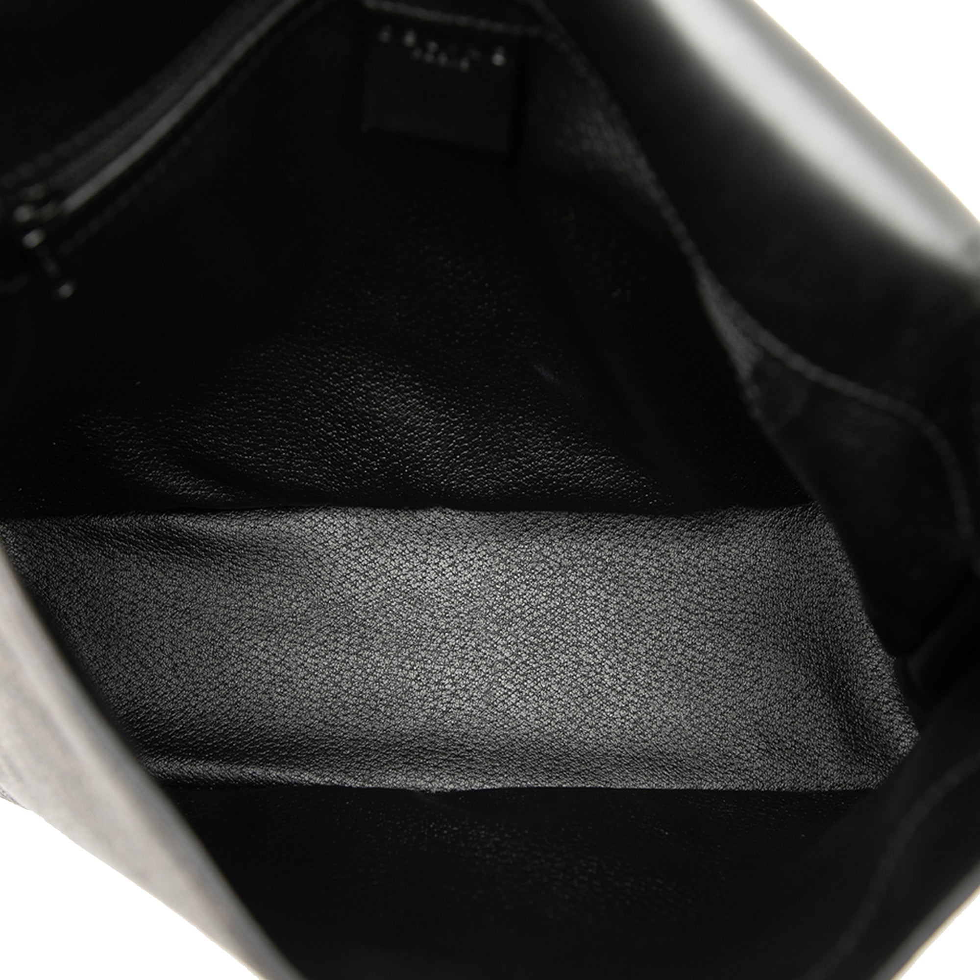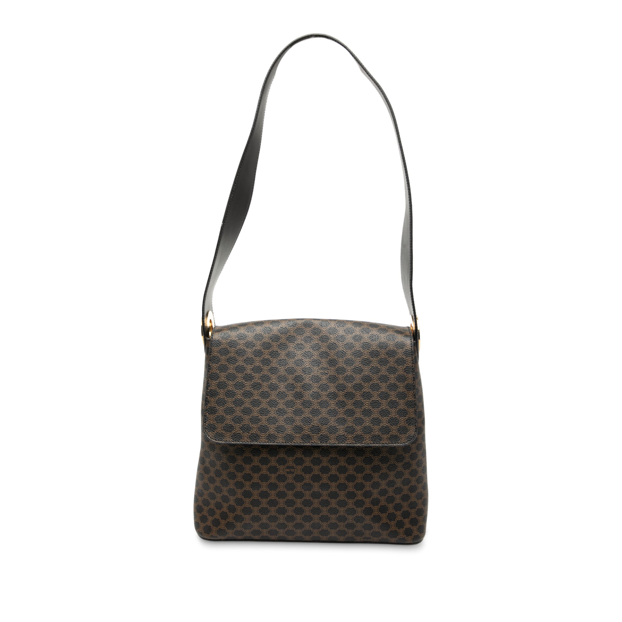 This shoulder bag features a coated canvas body, a flat leather shoulder strap, a front flap with magnetic snap closure, an exterior zip pocket, and an interior zip pocket. Retail Price: 800.00