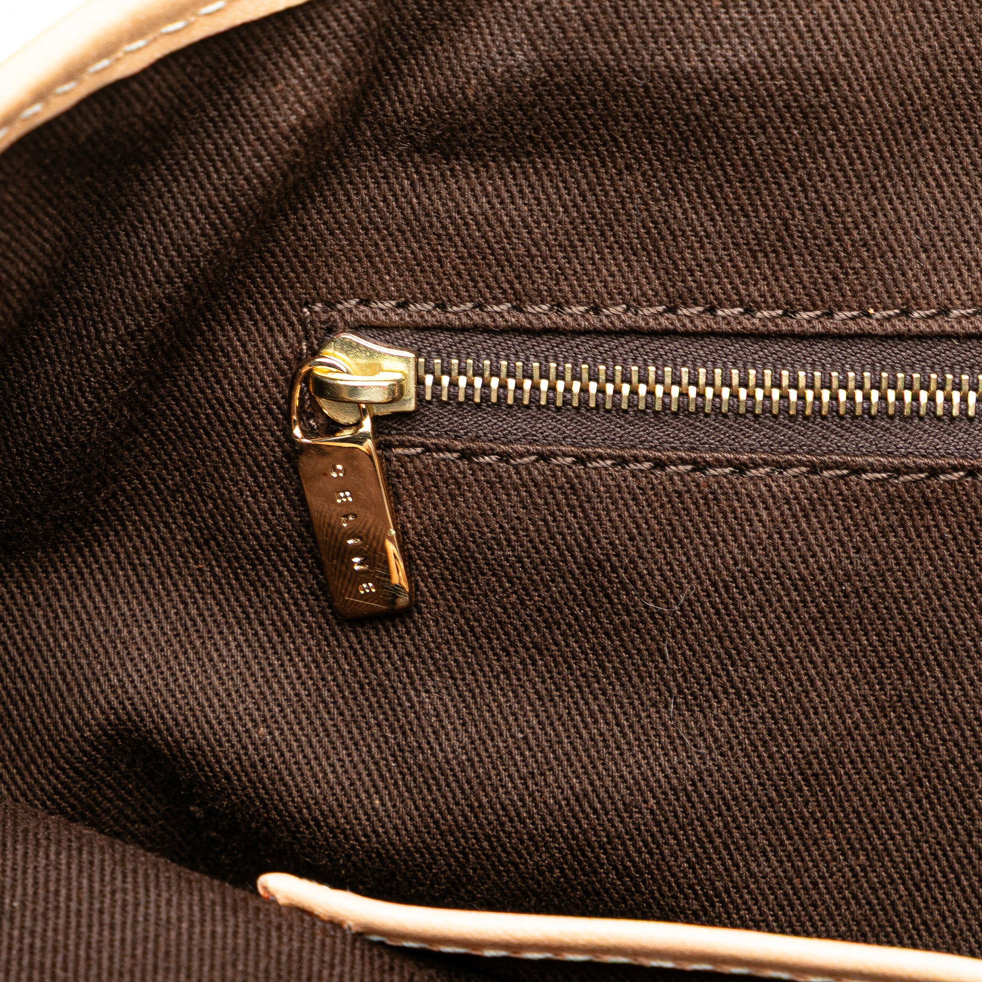 This tote bag features a coated canvas body with leather trim, flat leather straps, an open top with magnetic snap closure, and interior zip and slip pockets. Inclusion: Dust bag, authenticity card. Retail Price: 725.00
