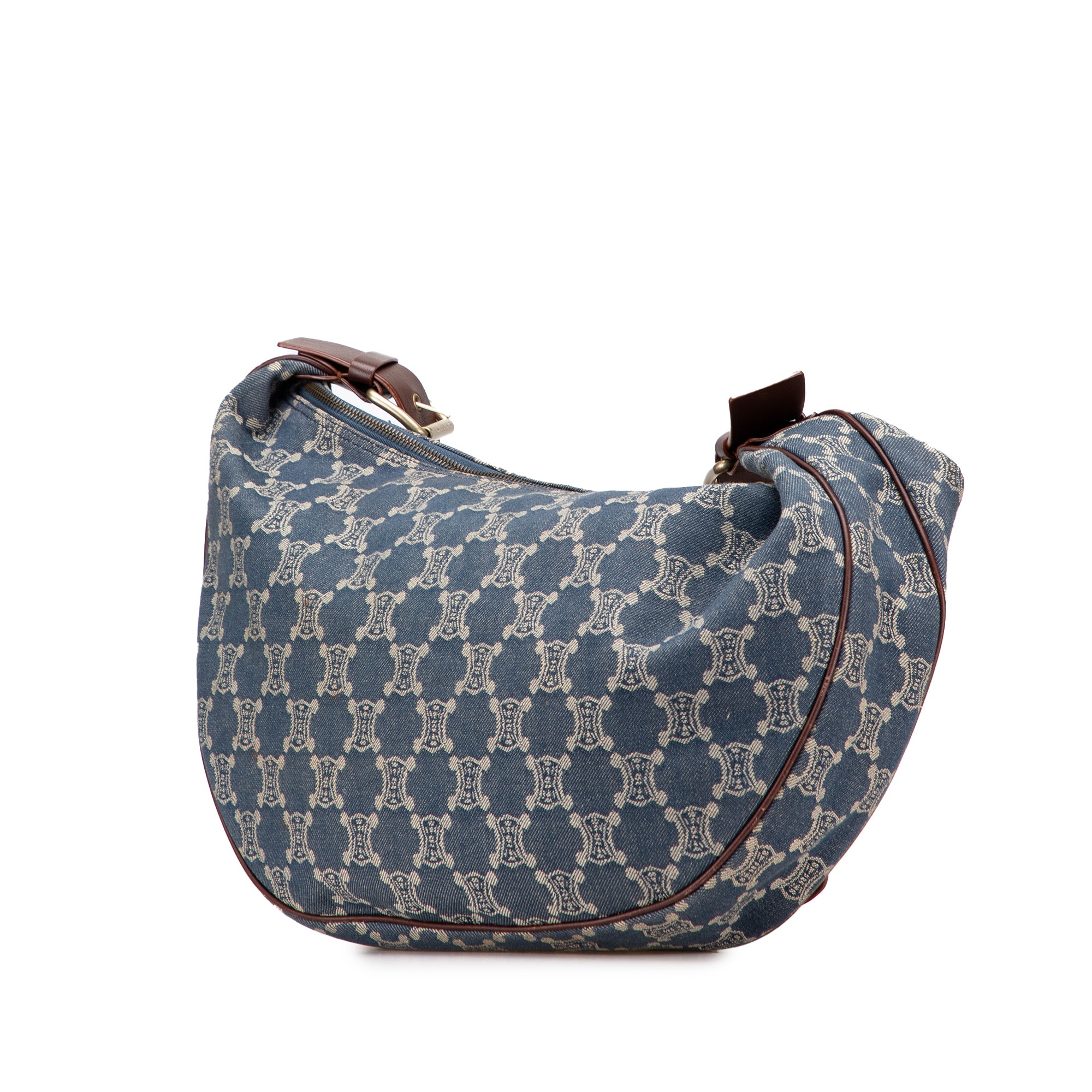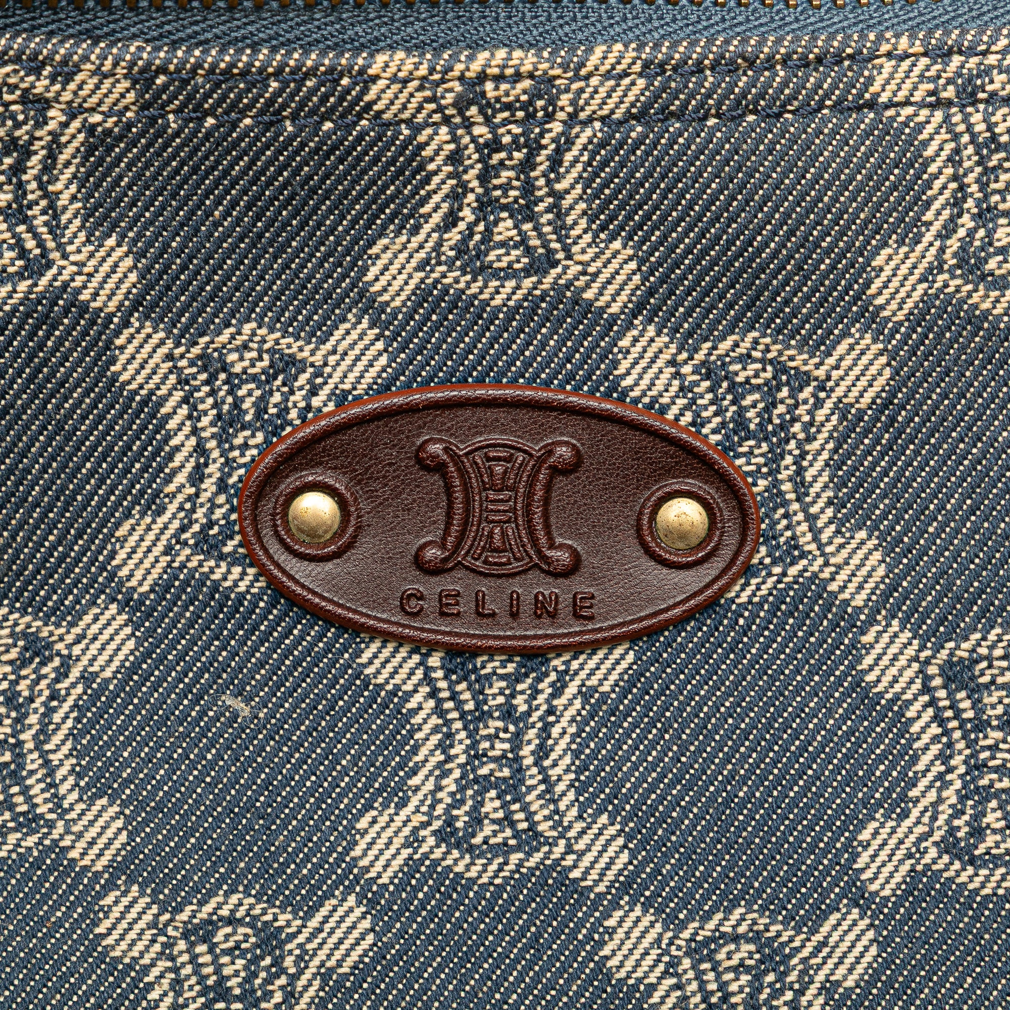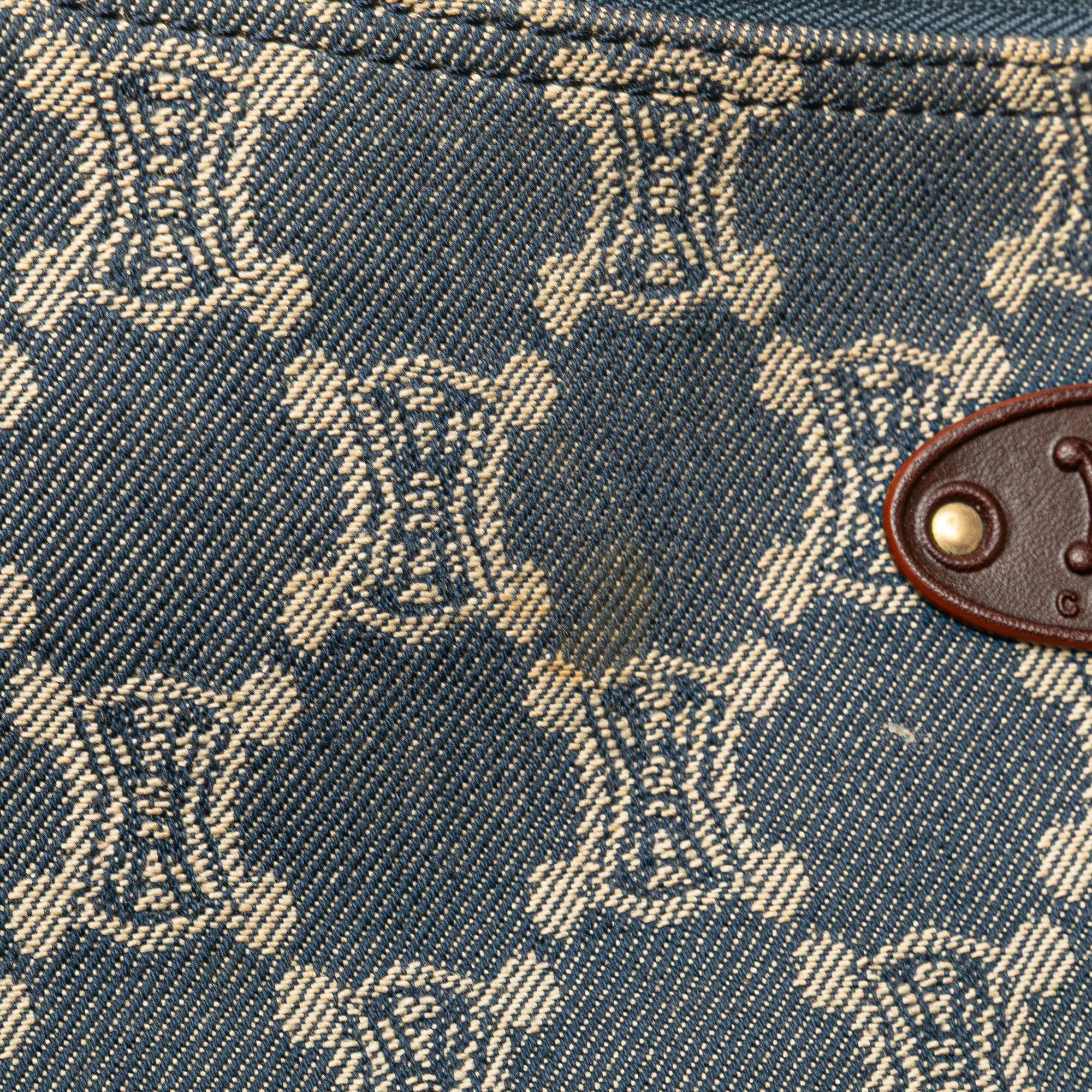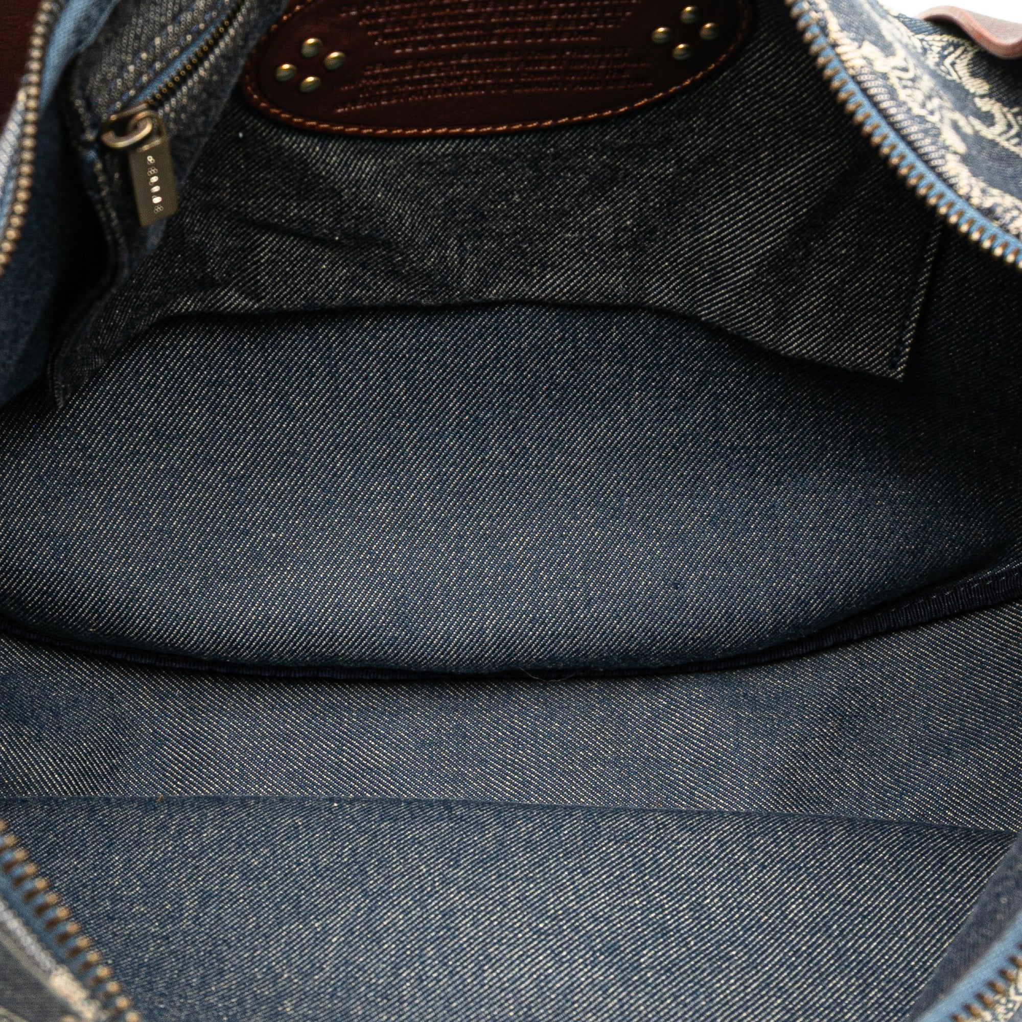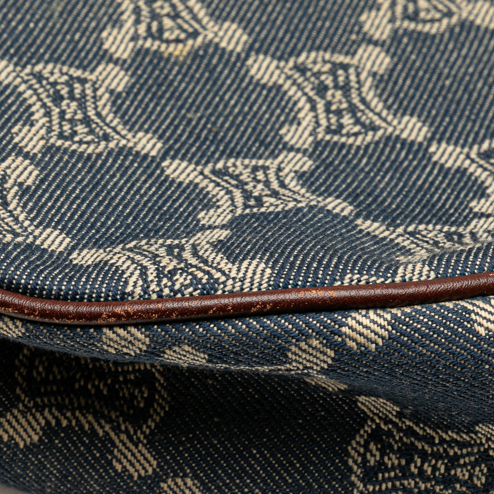 This crossbody bag features a denim body, an adjustable flat leather strap, a top zip closure, and an interior zip pocket. Retail Price: 655.00