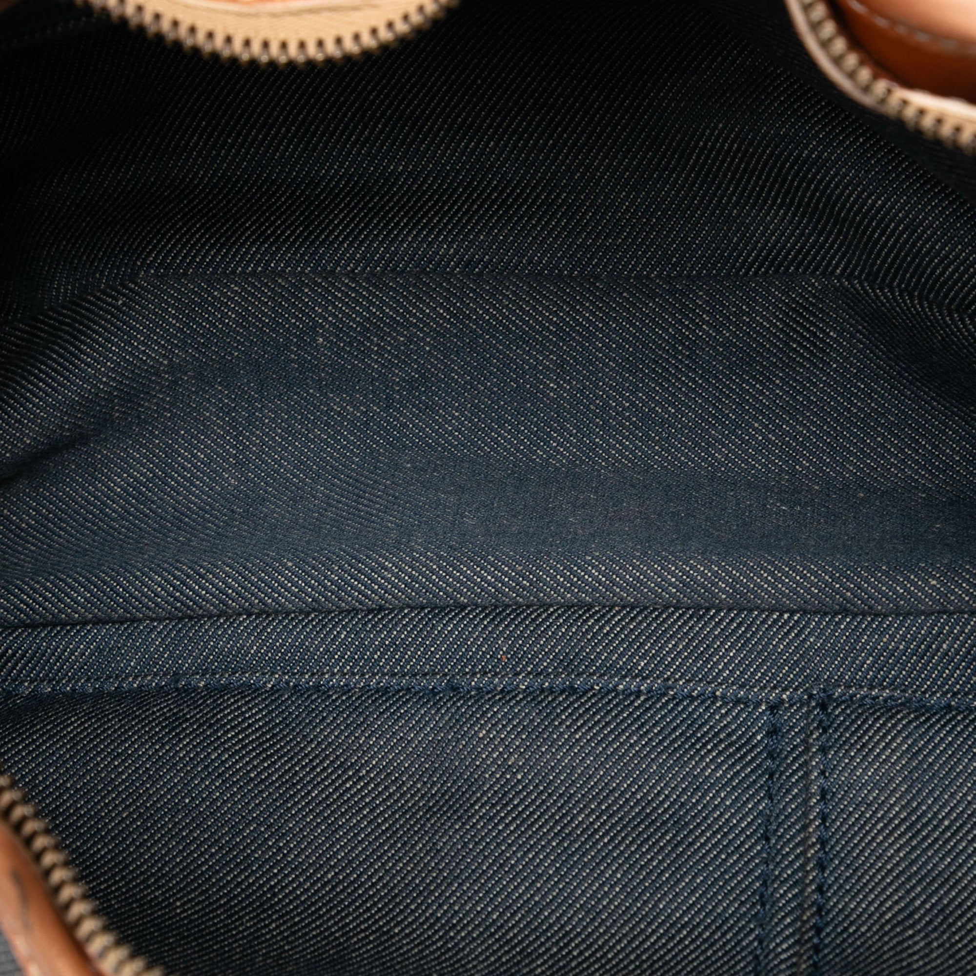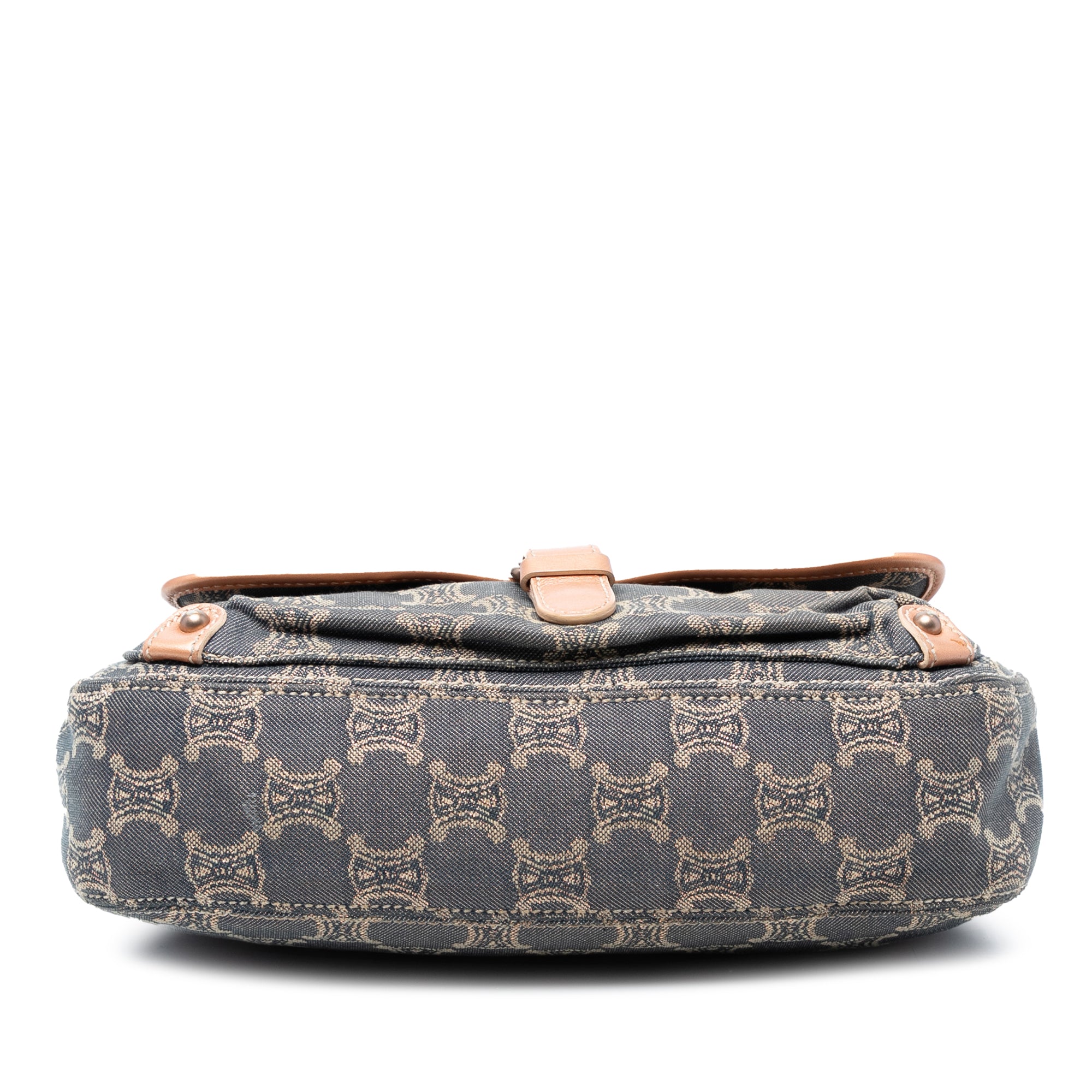 This shoulder bag features a denim body with leather trim, a flat leather shoulder strap, a top zip closure, a front flap pocket with buckle closure, and an interior zip pocket. Inclusion: Dust bag, authenticity card. Retail Price: 995.00