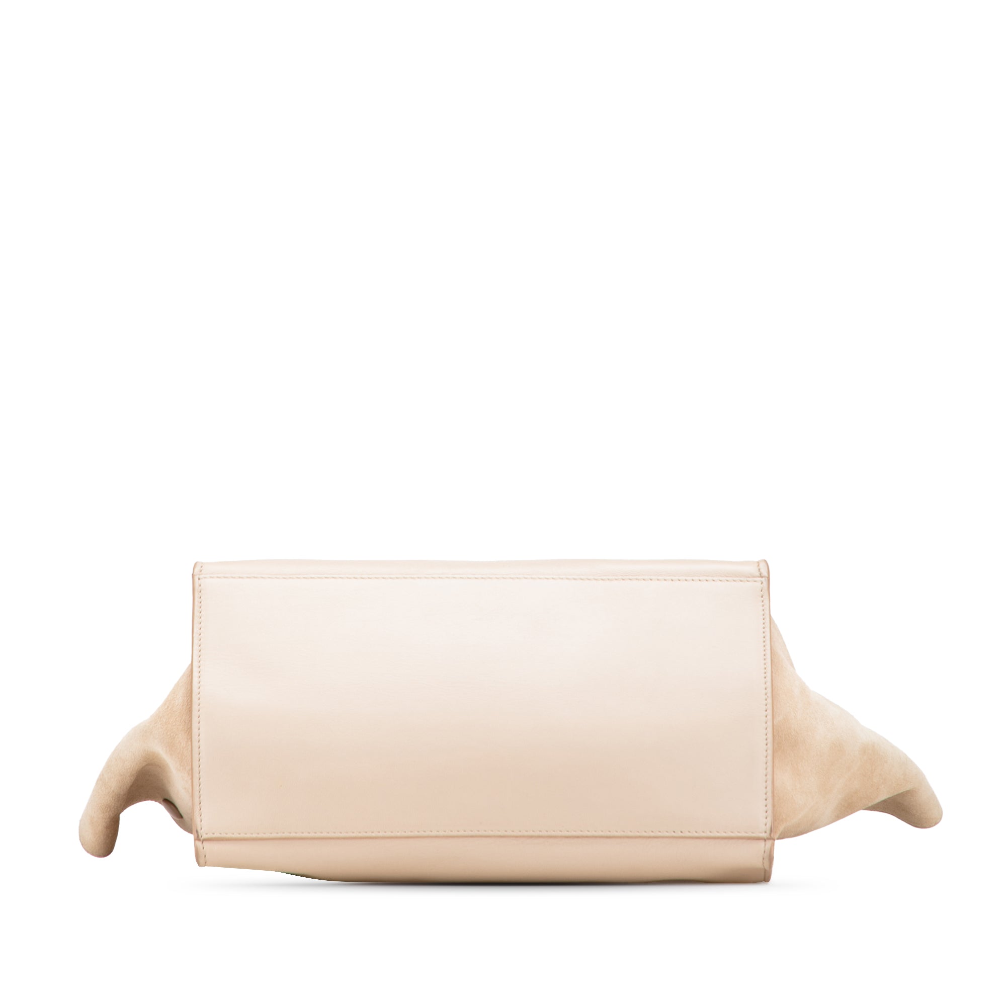 The Trapeze features a calfskin body with suede leather side panels, a rolled top handle, a detachable flat leather strap, a front flap with clasp closure, a top zip closure, an exterior back zip pocket, and interior slip pockets. Retail Price: 3100.00