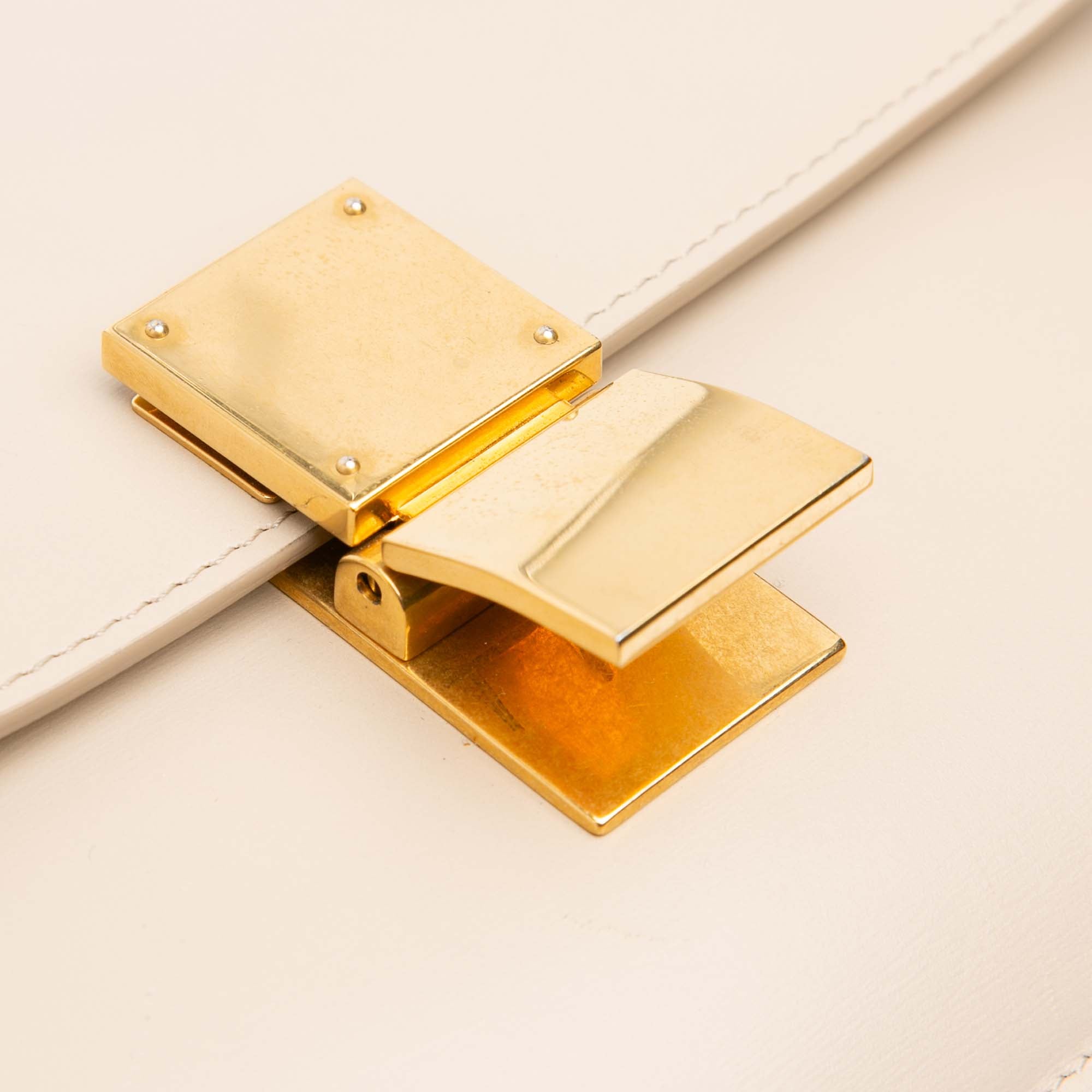 The Classic Box bag features a leather body, an adjustable flat leather strap, a front flap with a push lock closure, and interior slip pockets. Retail Price: 3218.00