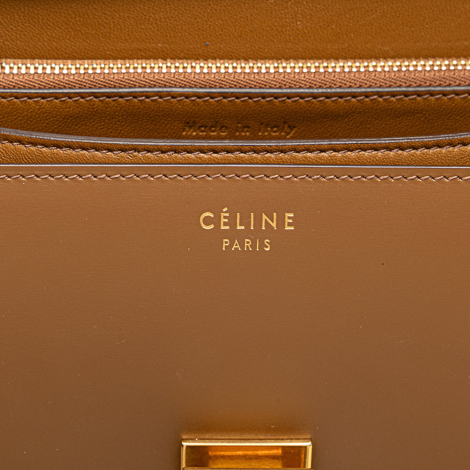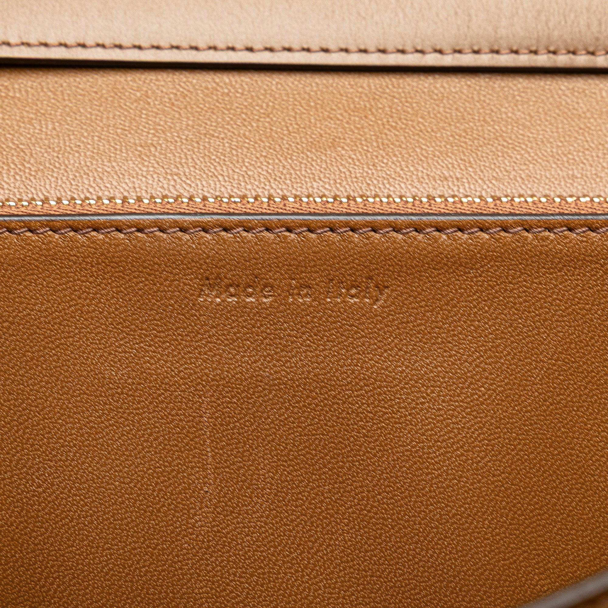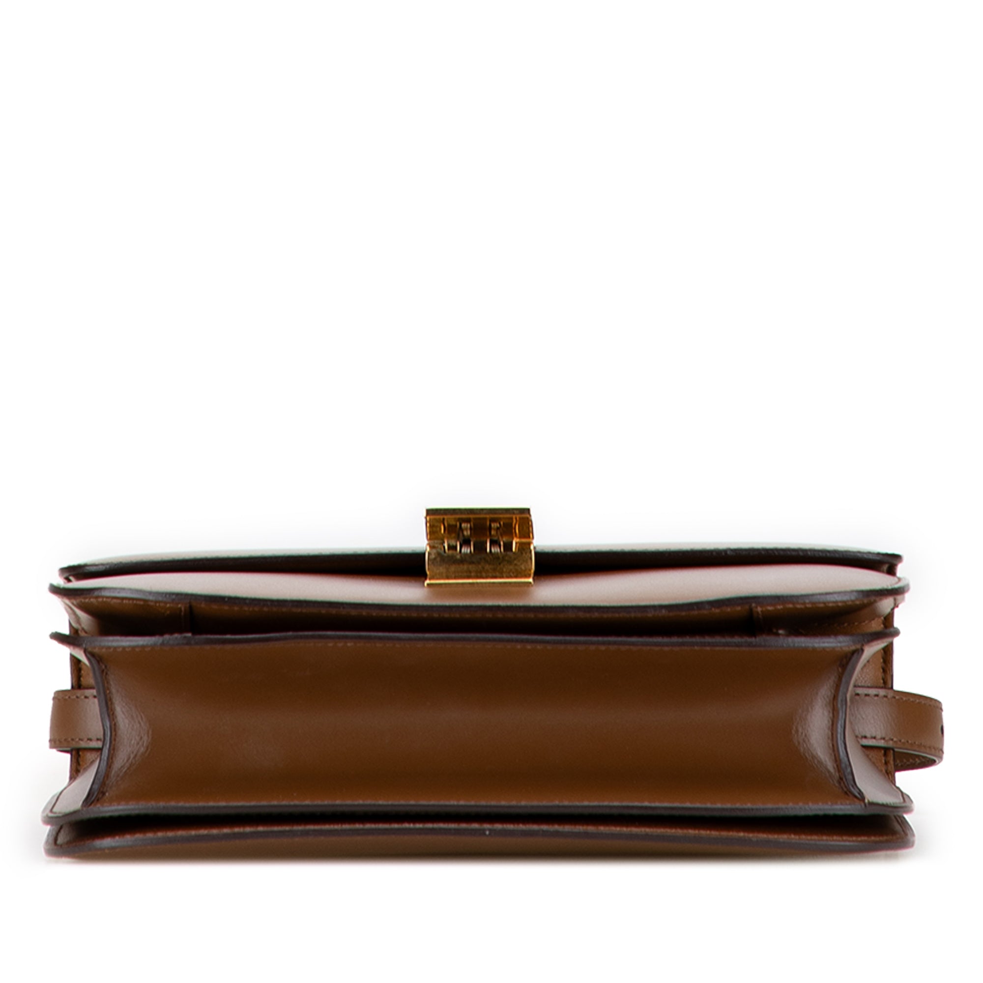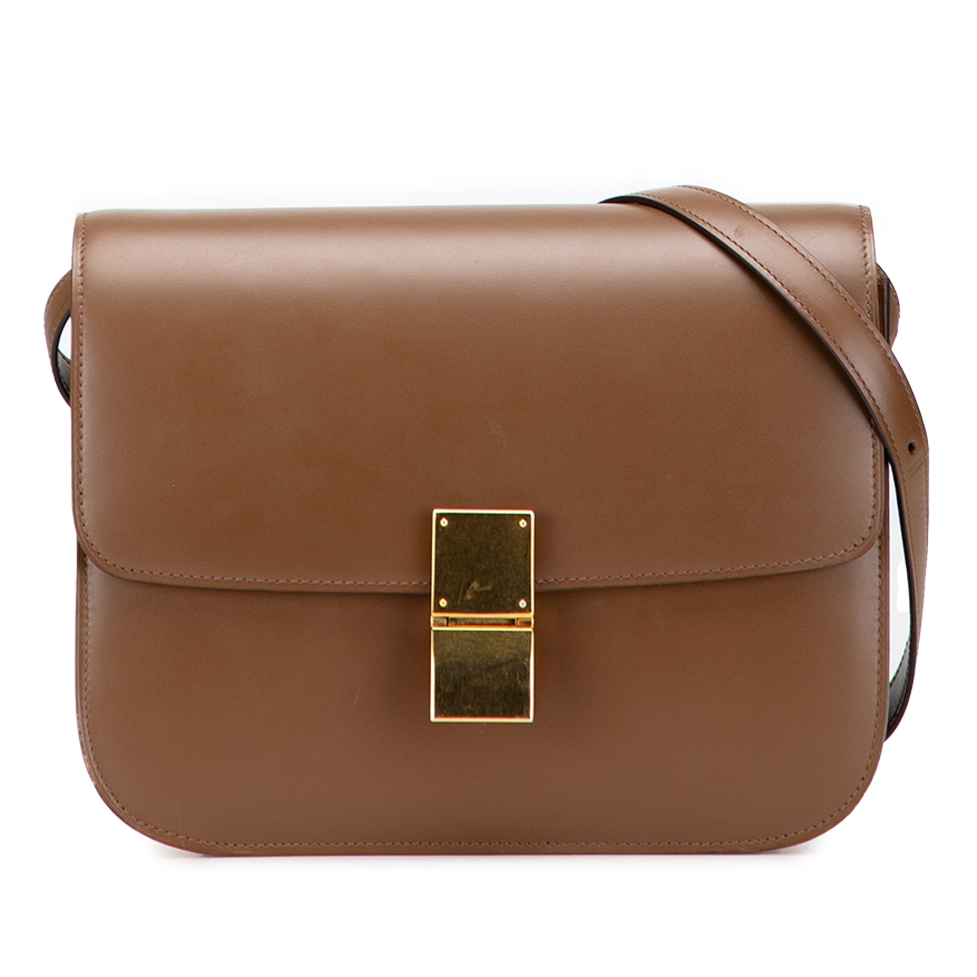 The Classic Box bag features a leather body, a flat leather strap, a front flap with a push lock closure, and interior slip pockets. Retail Price: 3195.00