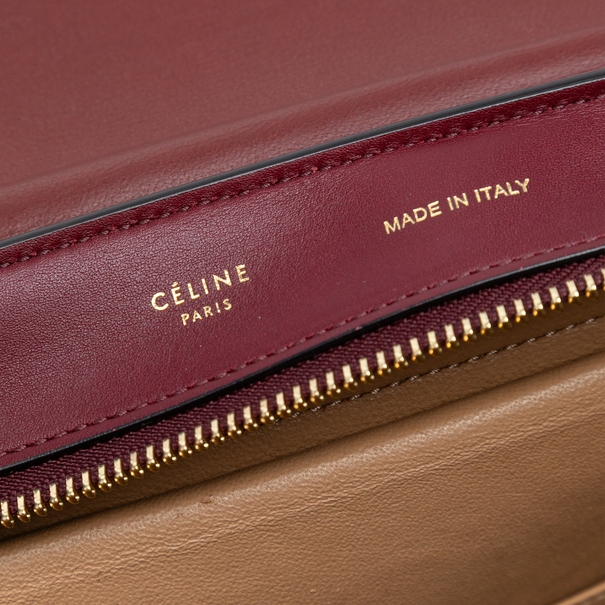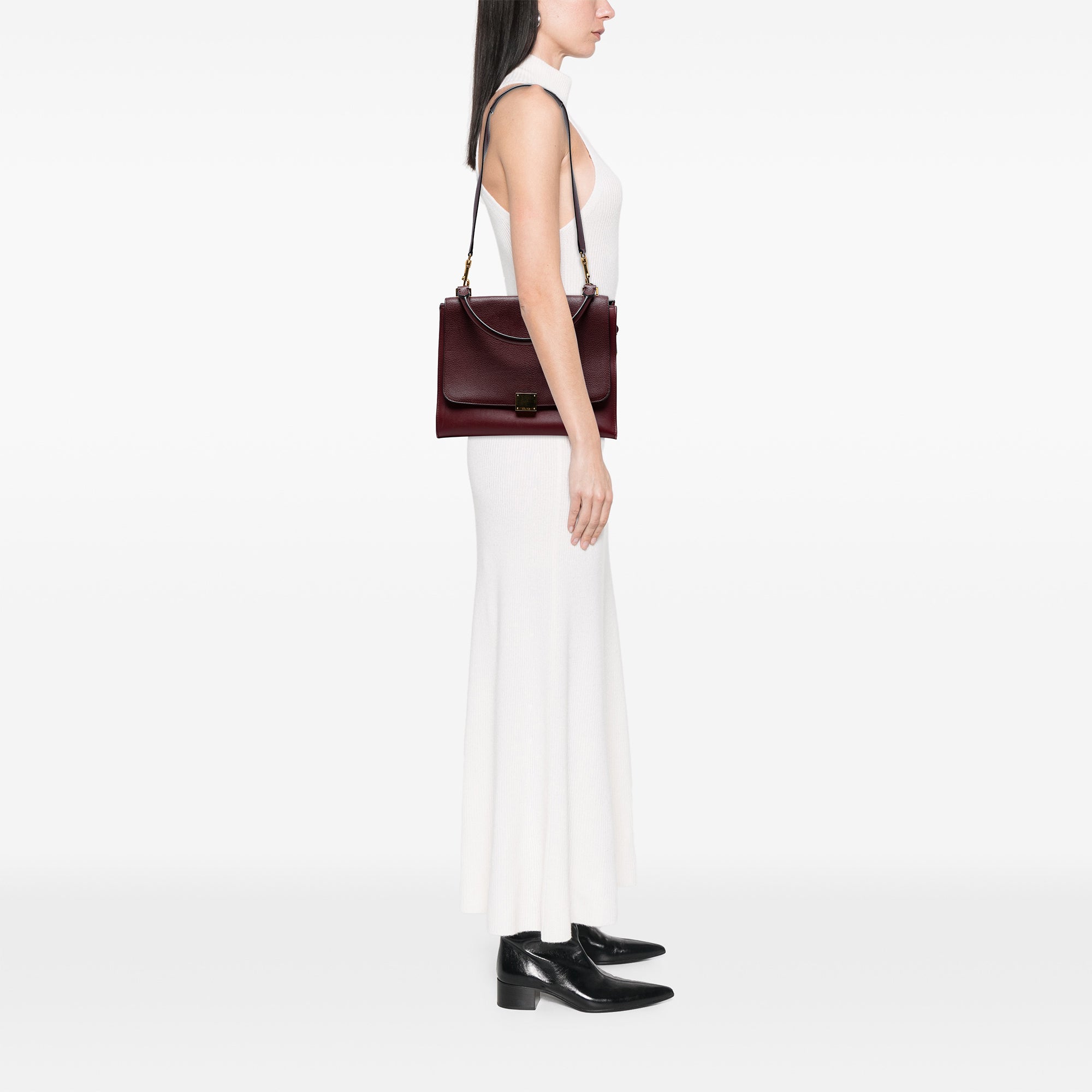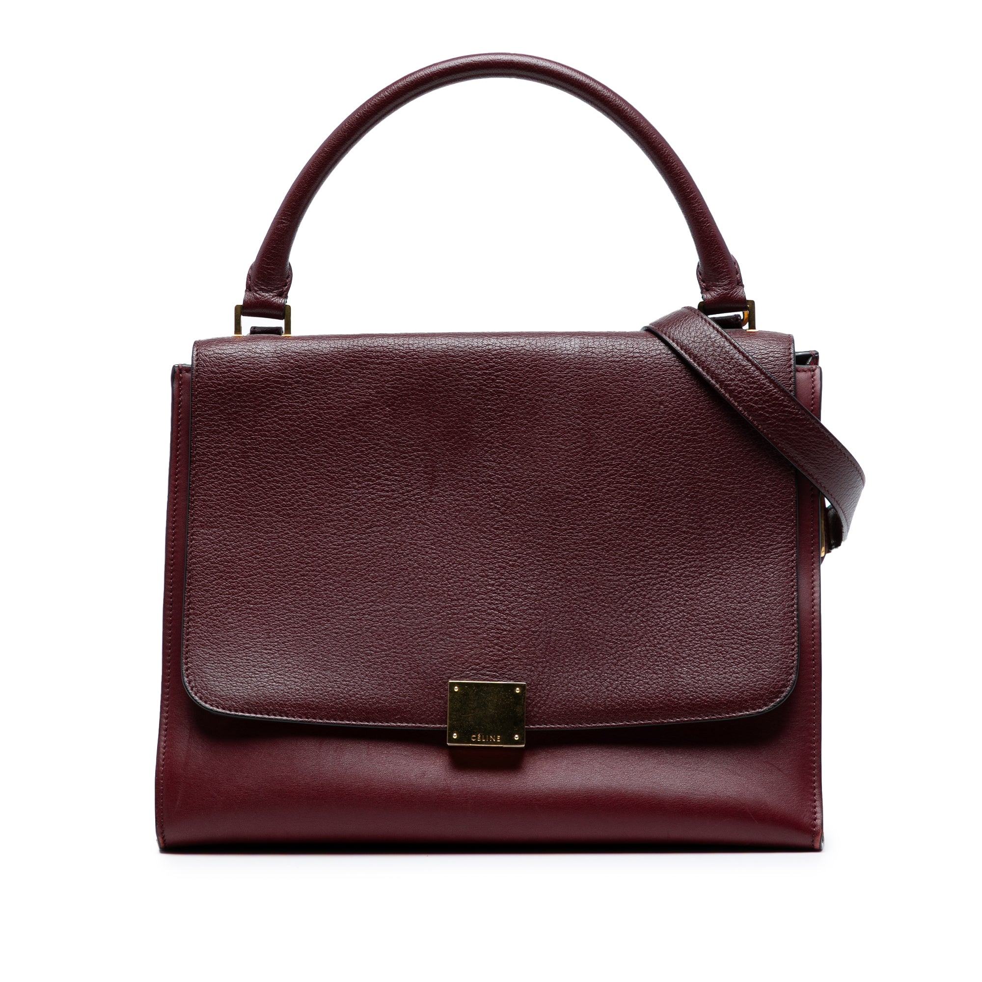The Trapeze features a leather body, suede leather side panels, a rolled top handle, a detachable flat leather strap, a front flap with clasp closure, a top zip closure, and interior slip pockets. Retail Price: 1500.00
