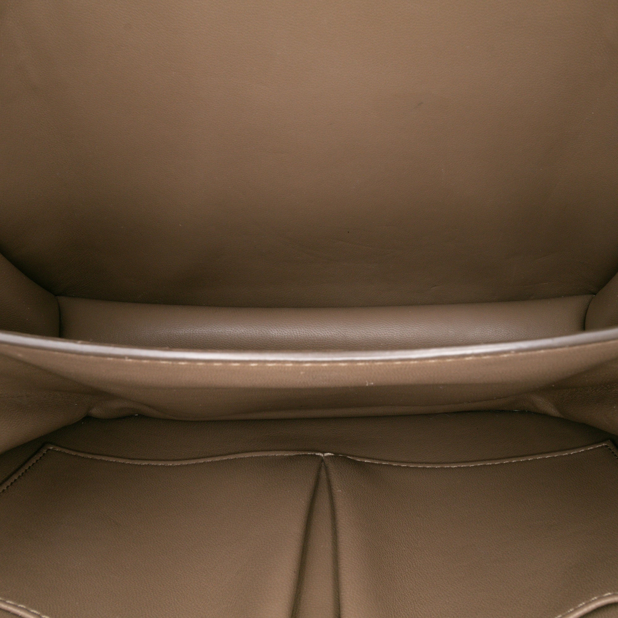 The Classic Box bag features a leather body, a flat leather strap, a front flap with a push lock closure, and interior slip pockets. Retail Price: 3195.00