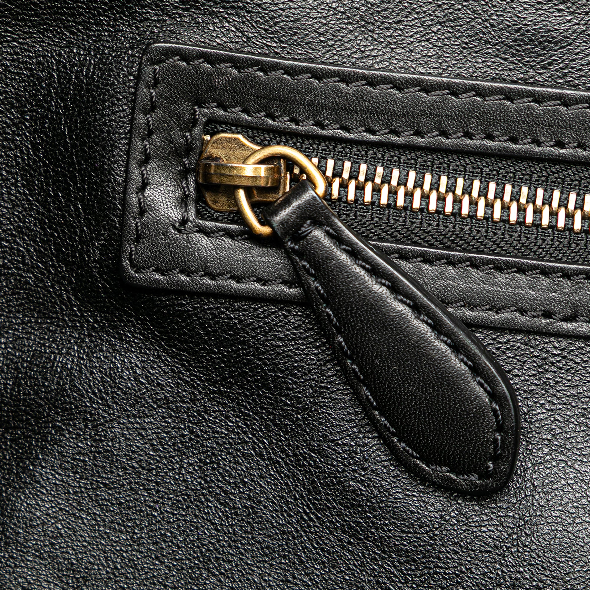 The Luggage Tote features a canvas and leather body, rolled leather handles, a top zip closure, an exterior front zip pocket, and interior zip and slip pockets. Retail Price: 2800.00