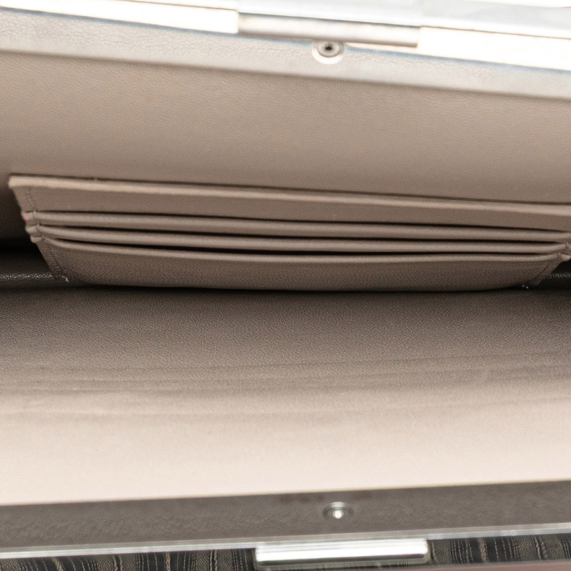 This crossbody bag features a leather body, a flat leather strap, an open top with clasp closure, and interior slip pockets. Retail Price: 2100.00
