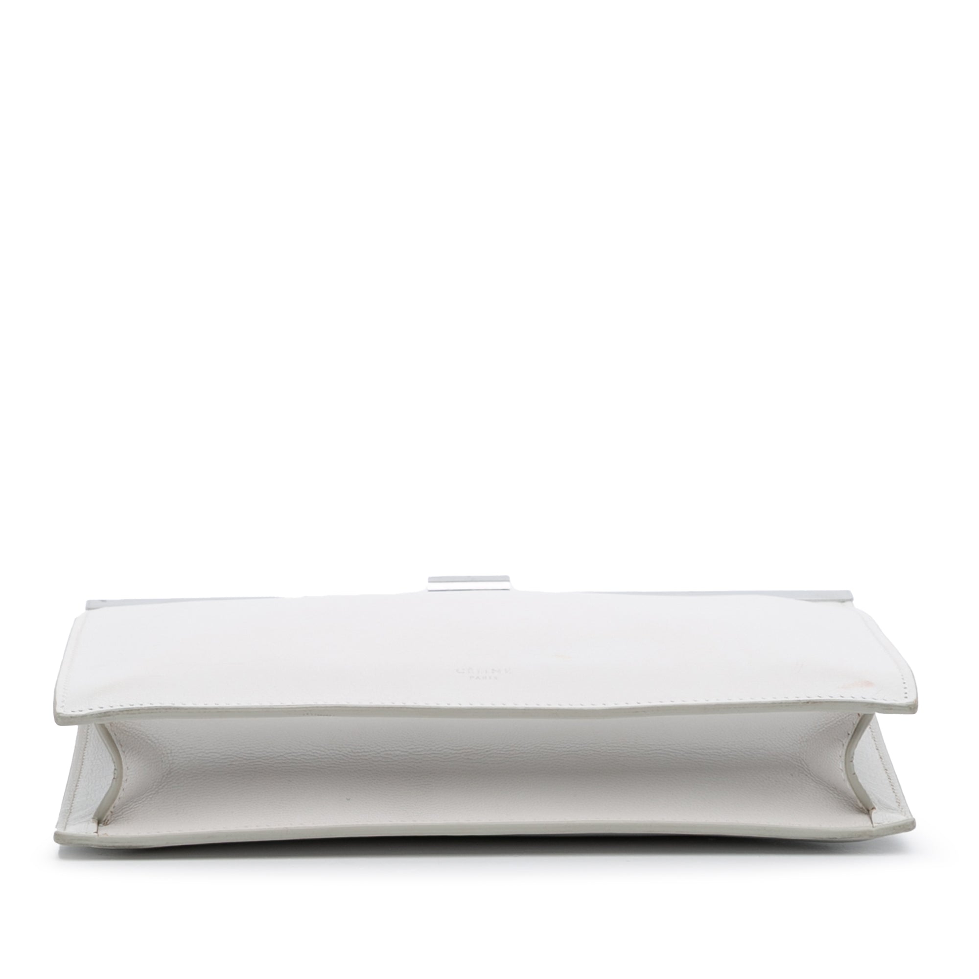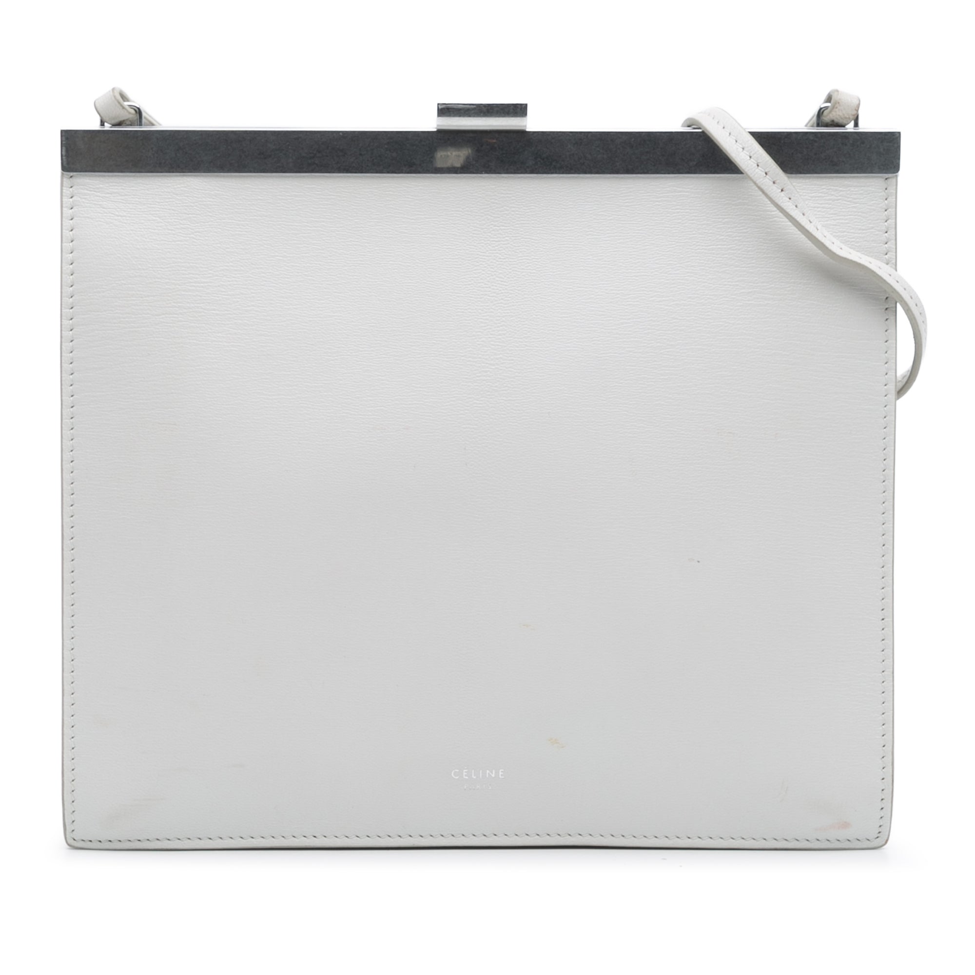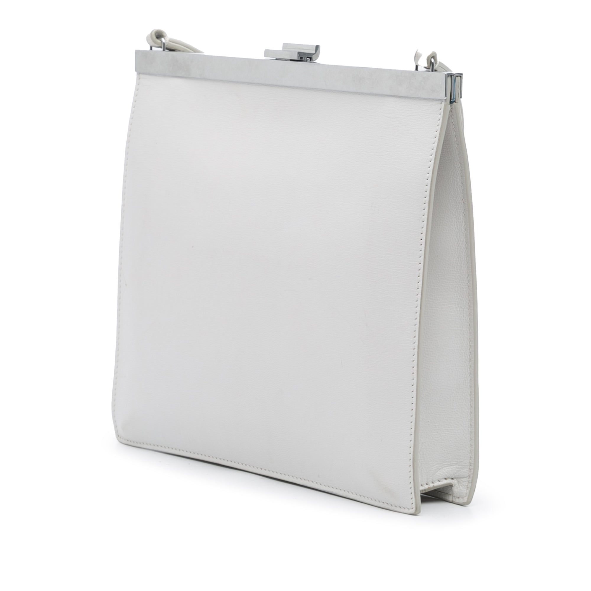 This crossbody bag features a leather body, a flat leather strap, an open top with clasp closure, and interior slip pockets. Retail Price: 2100.00
