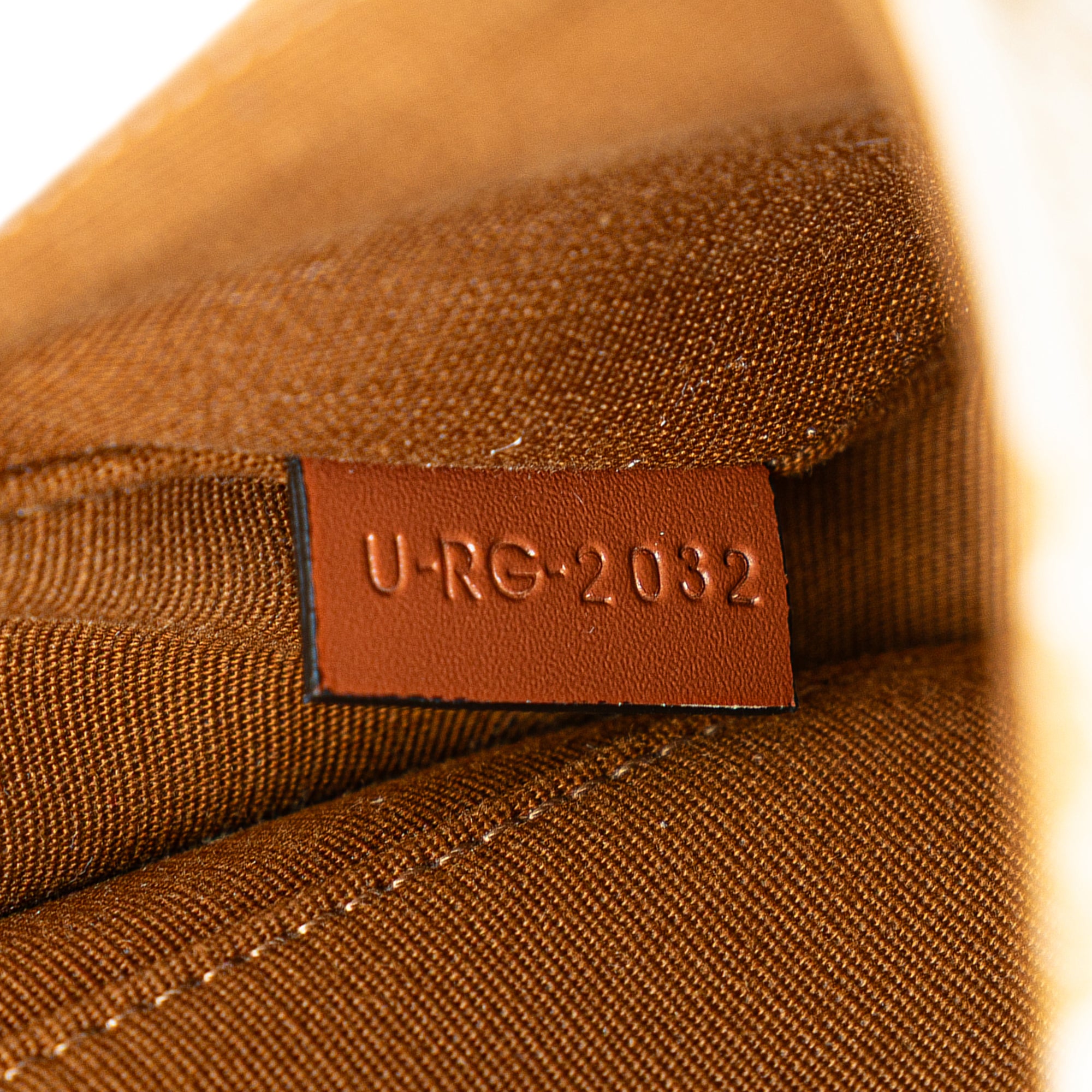 This crossbody bag features a coated canvas body with leather trim, an adjustable flat leather strap, a front flap with magnetic snap closure, and an interior slip pocket. Retail Price: 1350.00