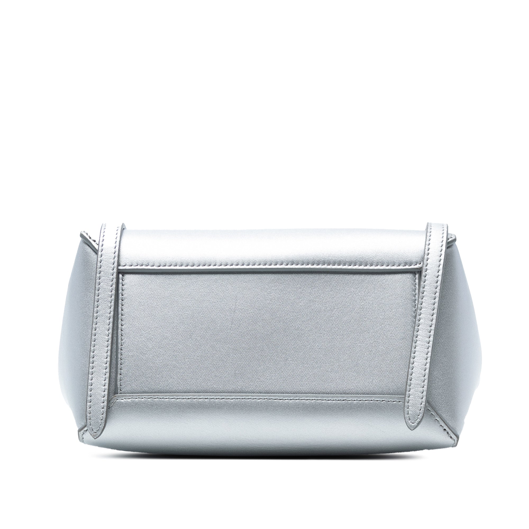 The Belt satchel features a leather body, a flat leather top handle, a detachable flat leather strap, a front flap with magnetic snap closure, and a top zip closure. Retail Price: 2450.00