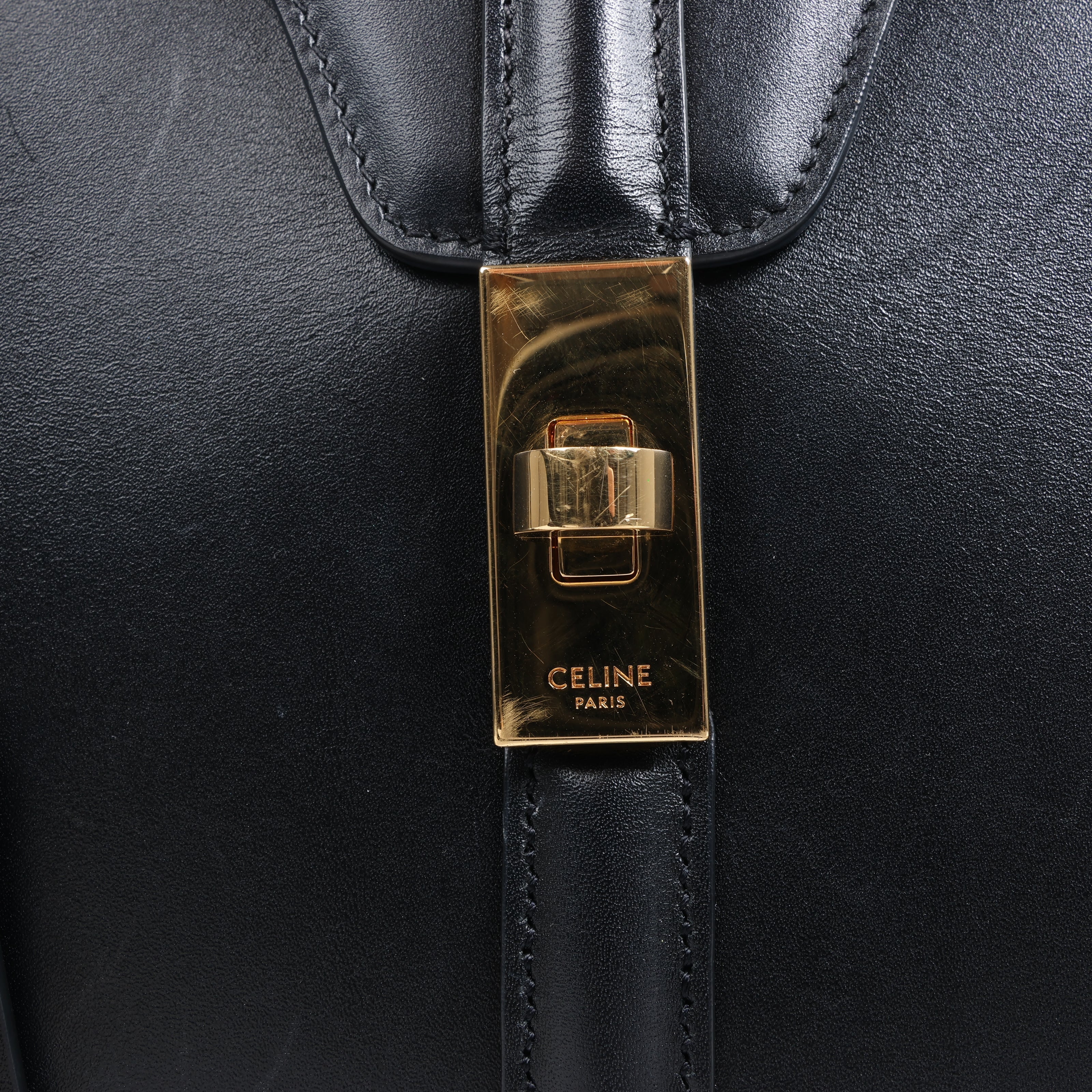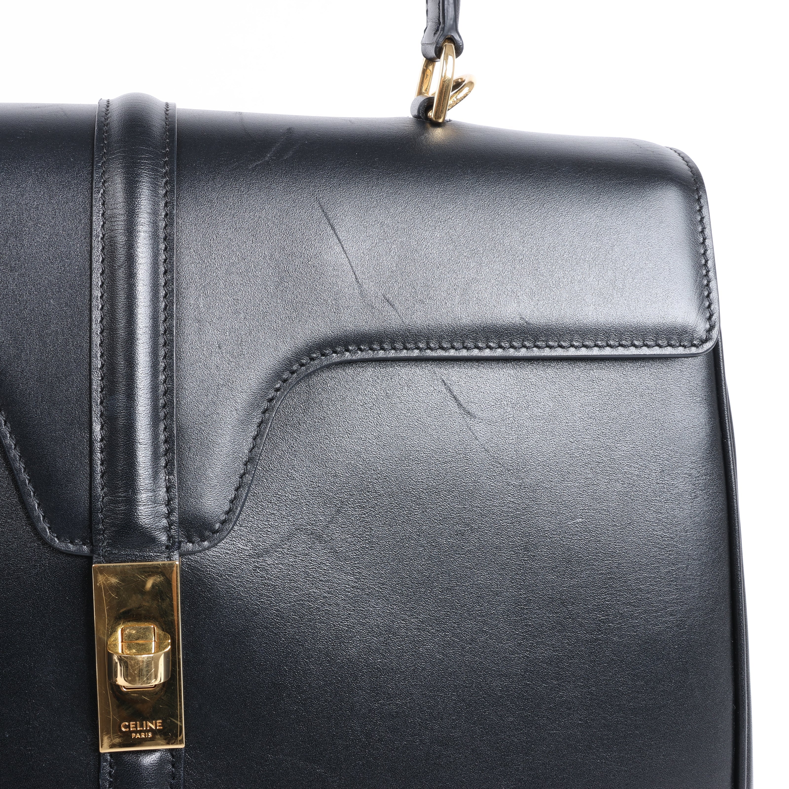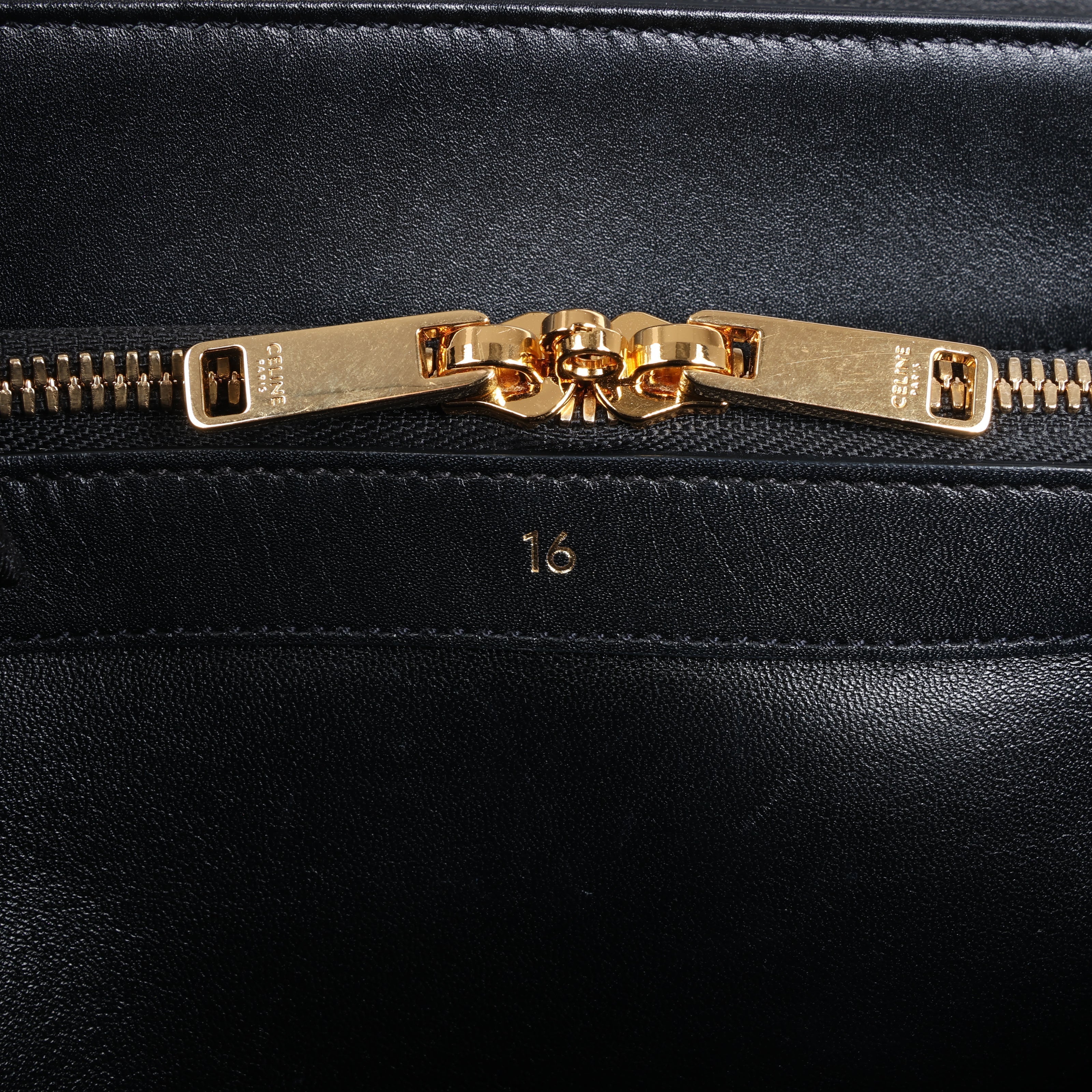Celine Sac 16 Medium Handbag in smooth black leather with gold-tone hardware, top handle, and detachable strap. A timeless 2-way design exuding Parisian elegance and structured sophistication.