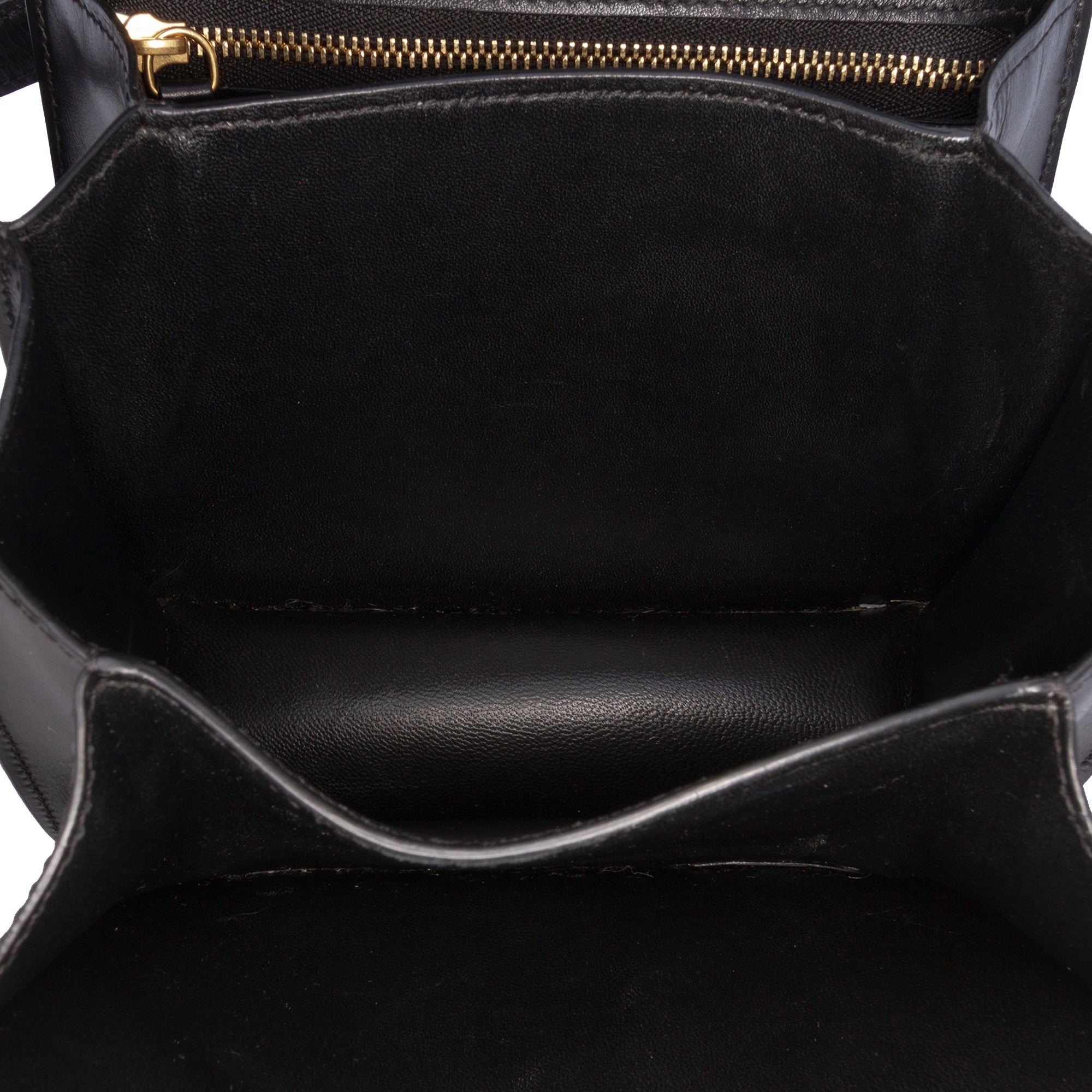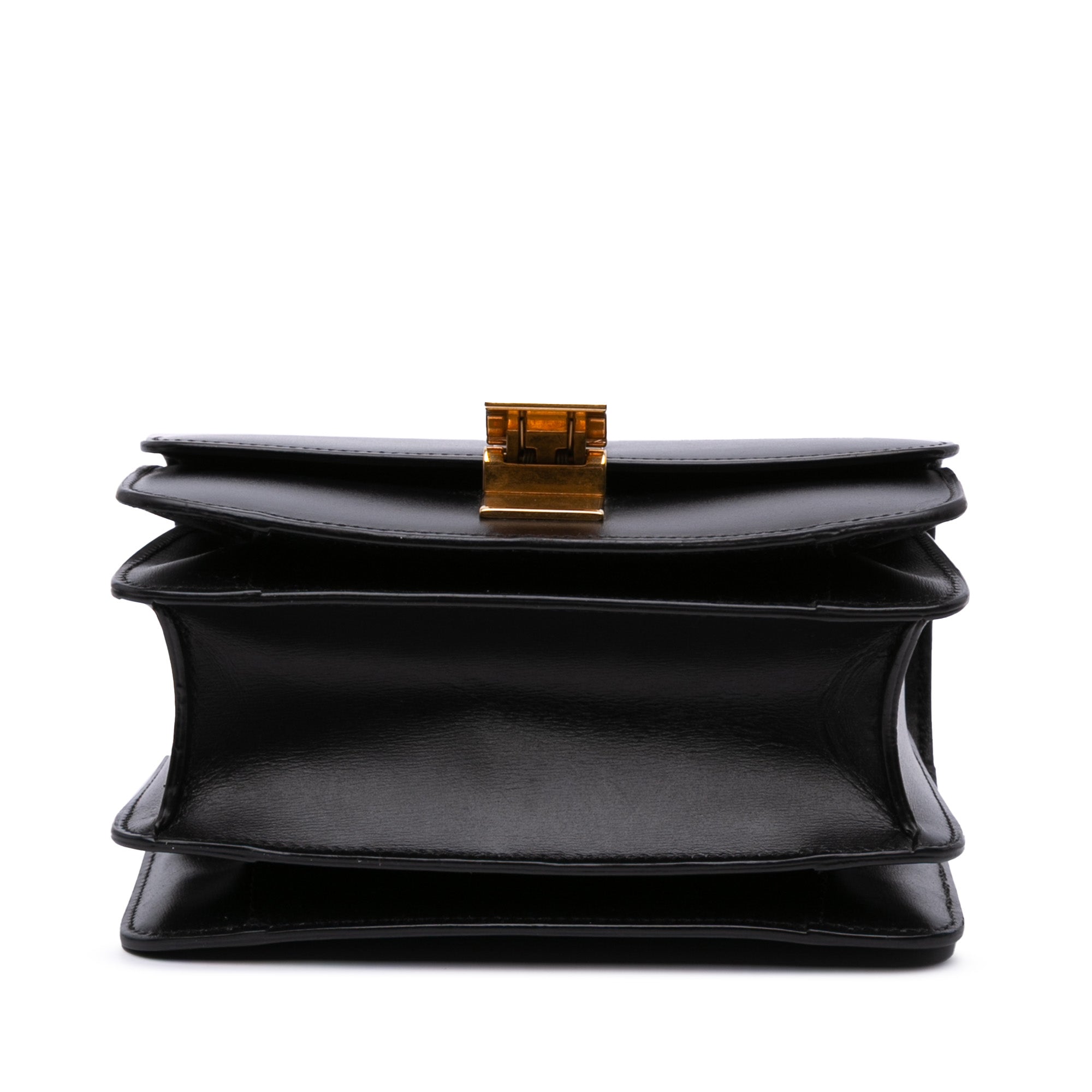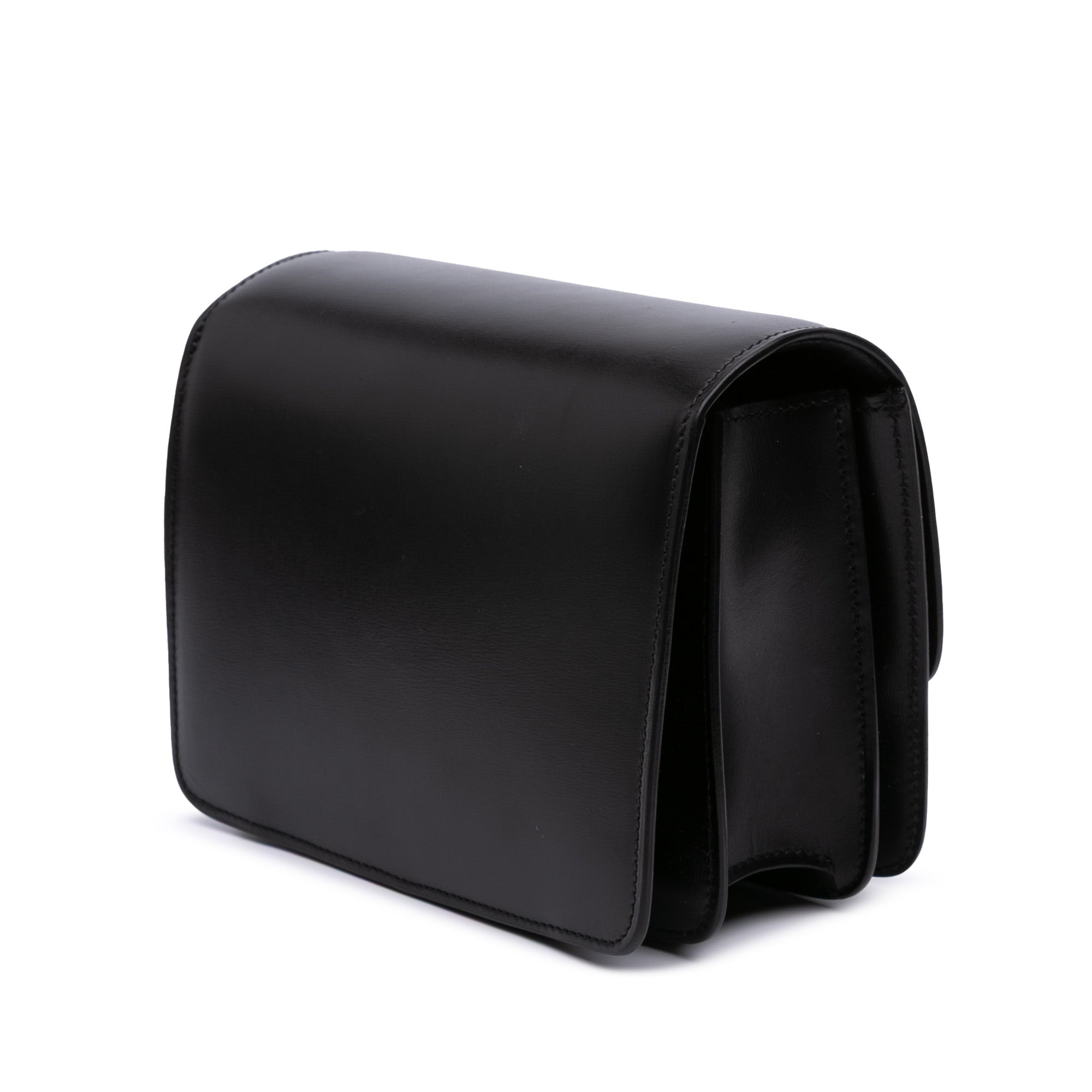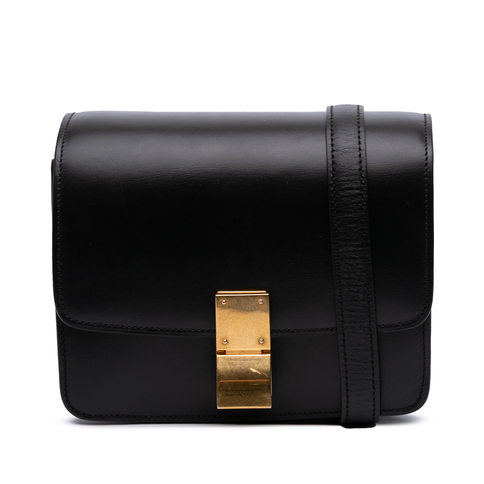 The Classic Box crossbody bag features a leather body, a flat leather strap, a front flap with a push lock closure, and interior slip and zip pockets. Retail Price: 3700.00