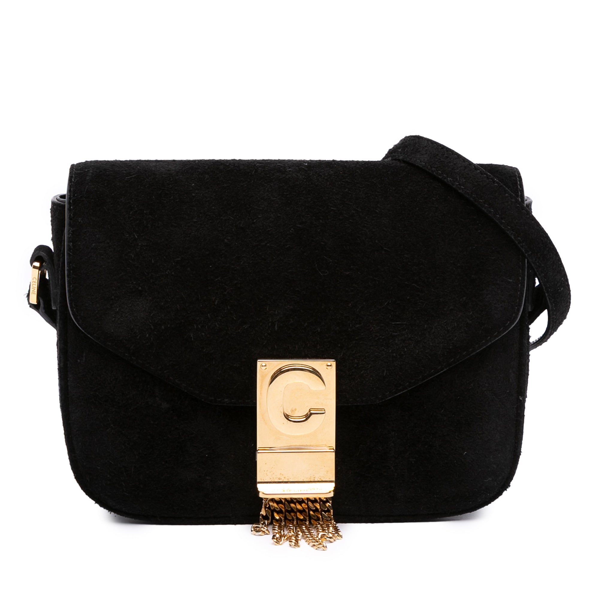 The Pampille C bag features a suede leather body, a flat leather strap, a flap with metal closure, and interior slip pockets. Retail Price: 2800.00