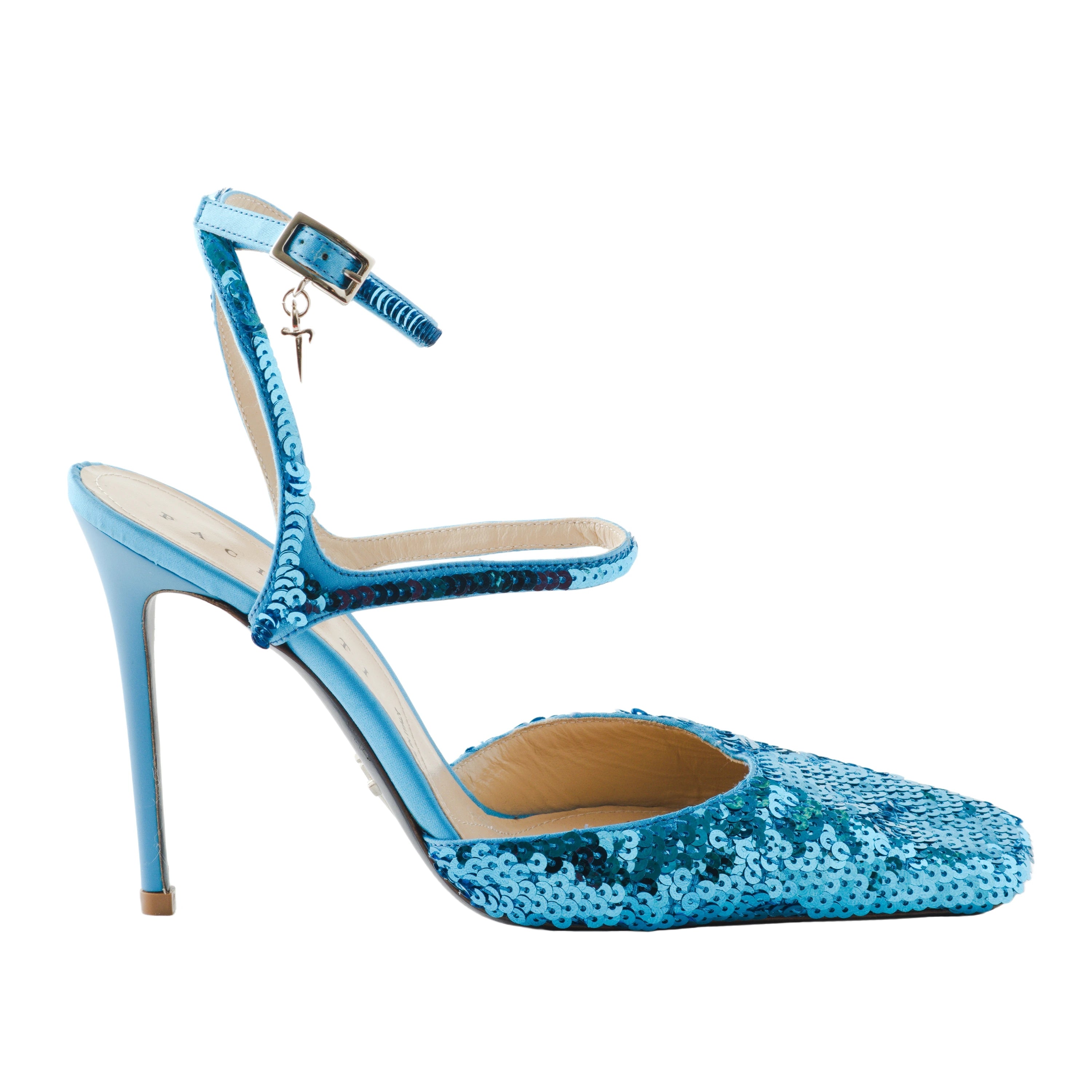 These blue sequin-embellished stiletto pumps by Cesare Paciotti represent the perfect blend of refinement, style, and radiant glamour. The pointed-toe design and slender stiletto heel enhance femininity, while the ankle strap ensures a secure and comfortable fit.