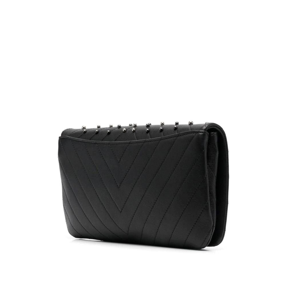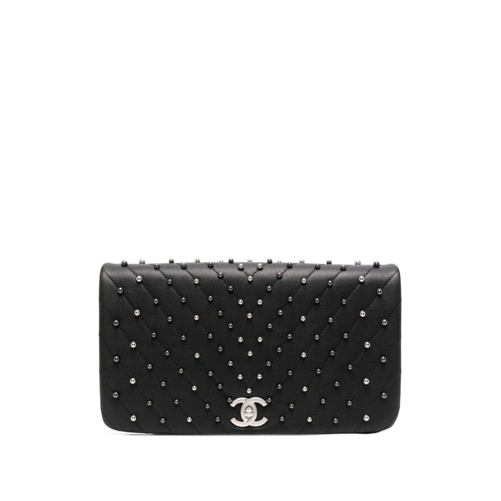 Chanel black Chevron quilted leather 2010s purse with beaded flap. Flap with double C metal closure and rows of aplliqué silver and grey spherical beads. A maxi rear patch pocket. Two inner compartments, one of which with zip, and one zip pocket. Codice: 27139573 - Year: 2019 - The bag shows minor signs of wear on the leather, as shown in the pictures.