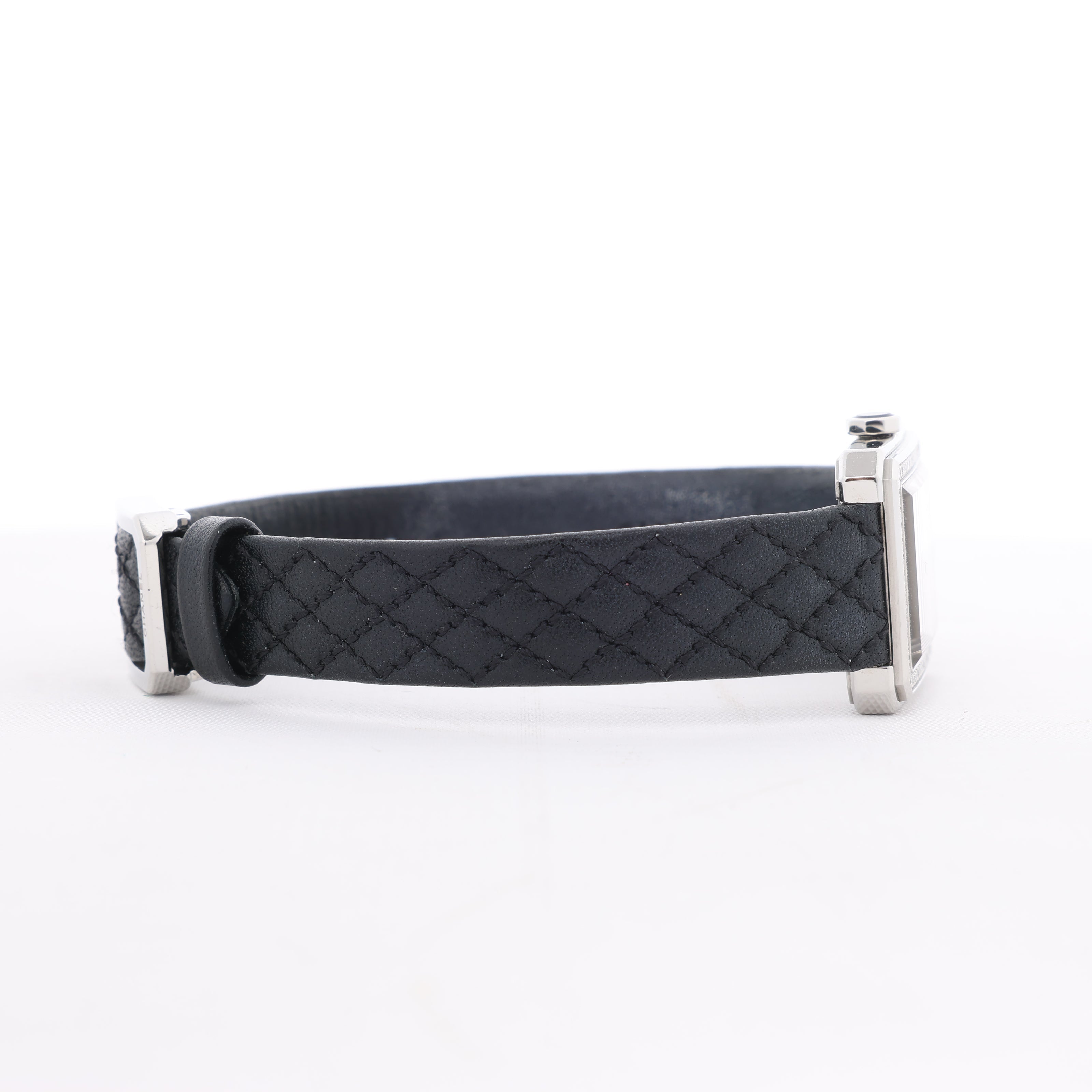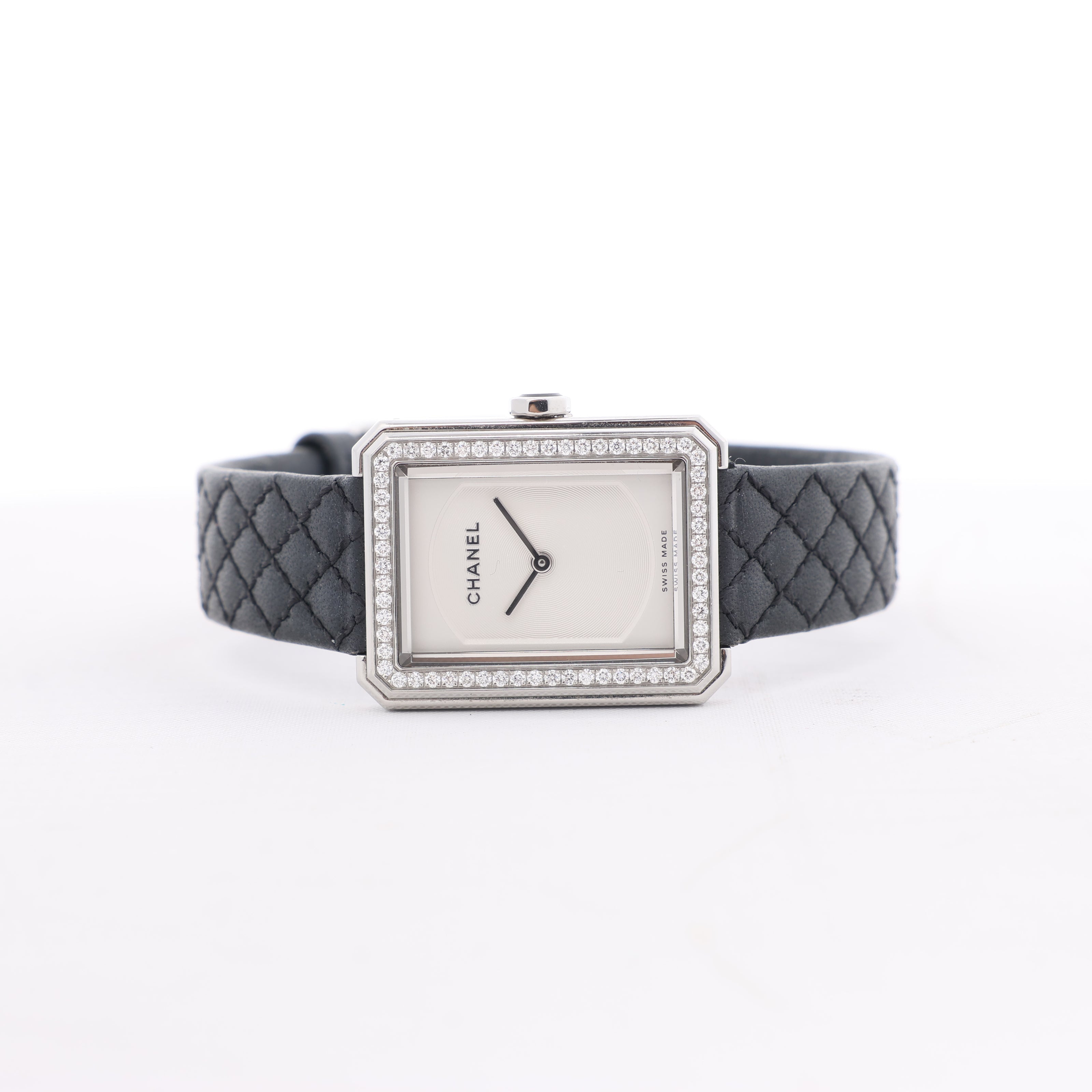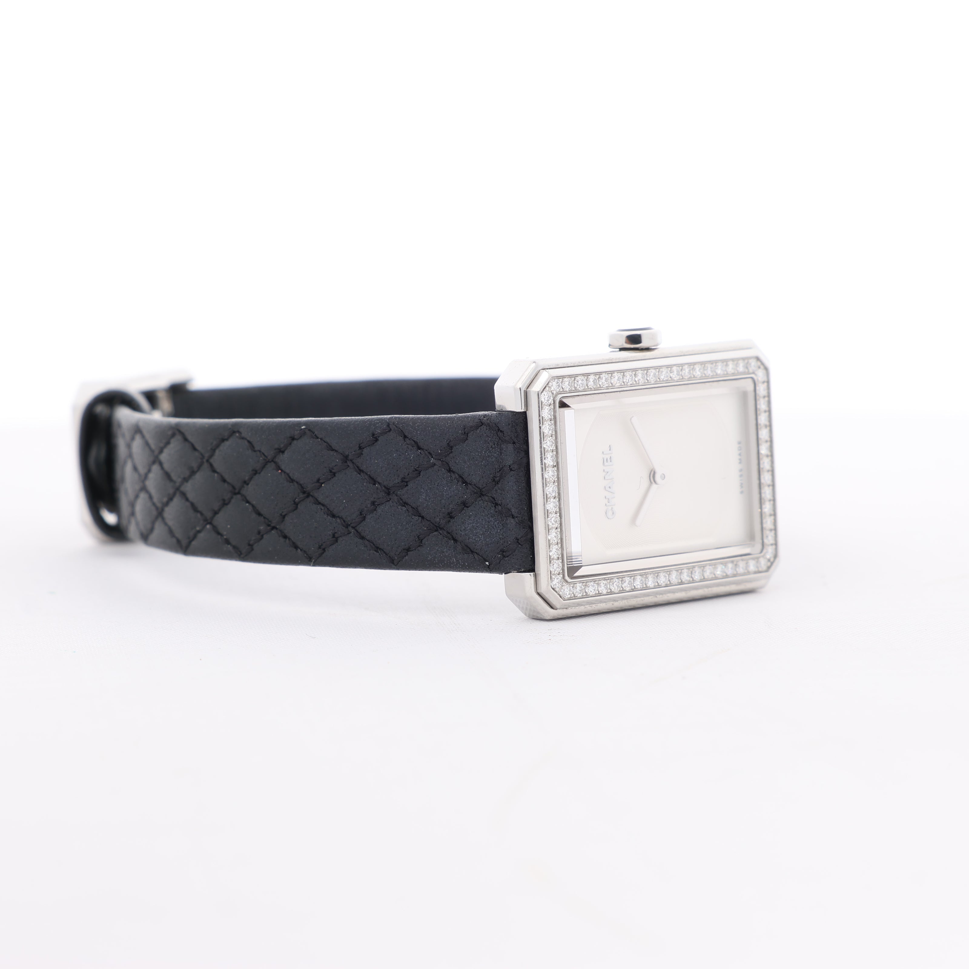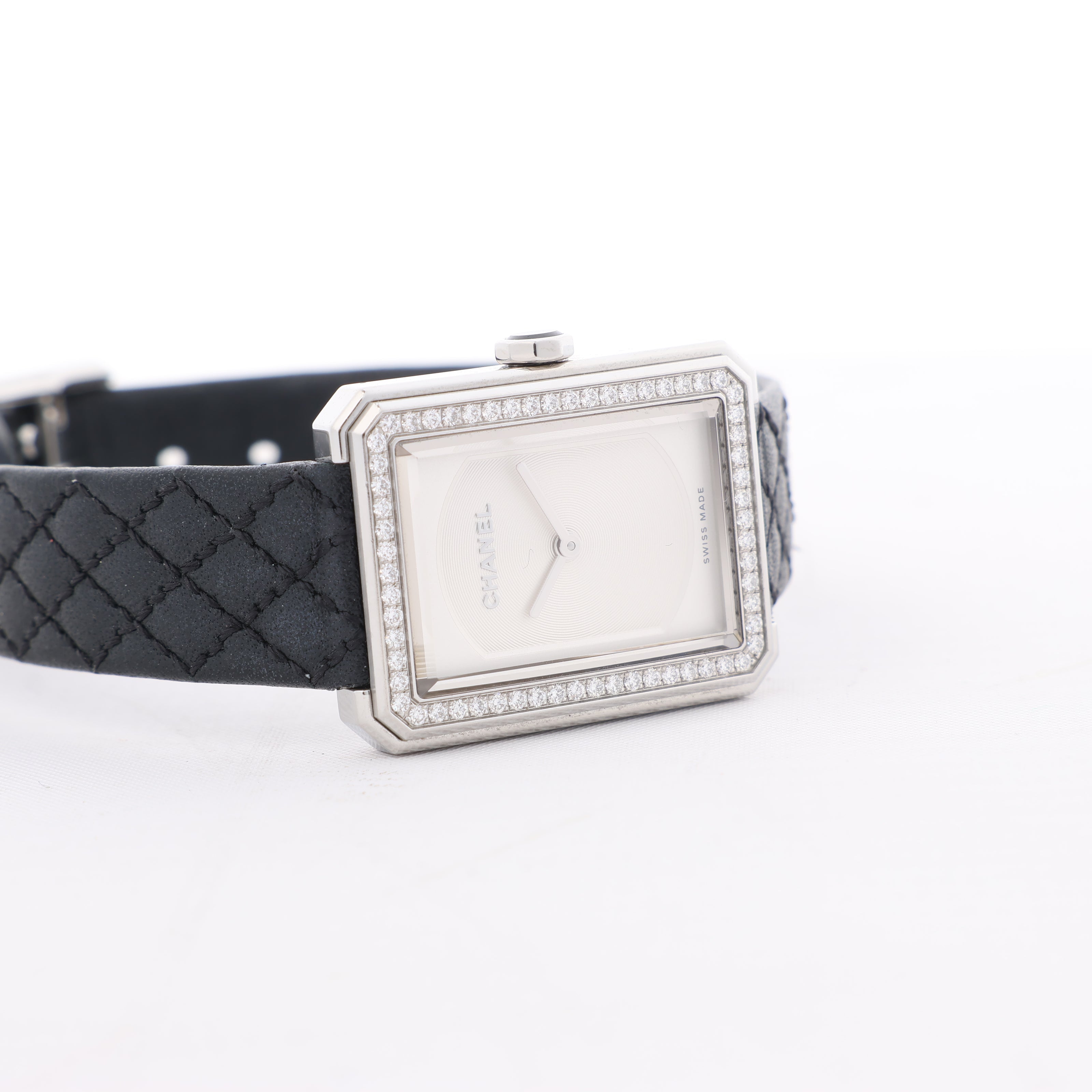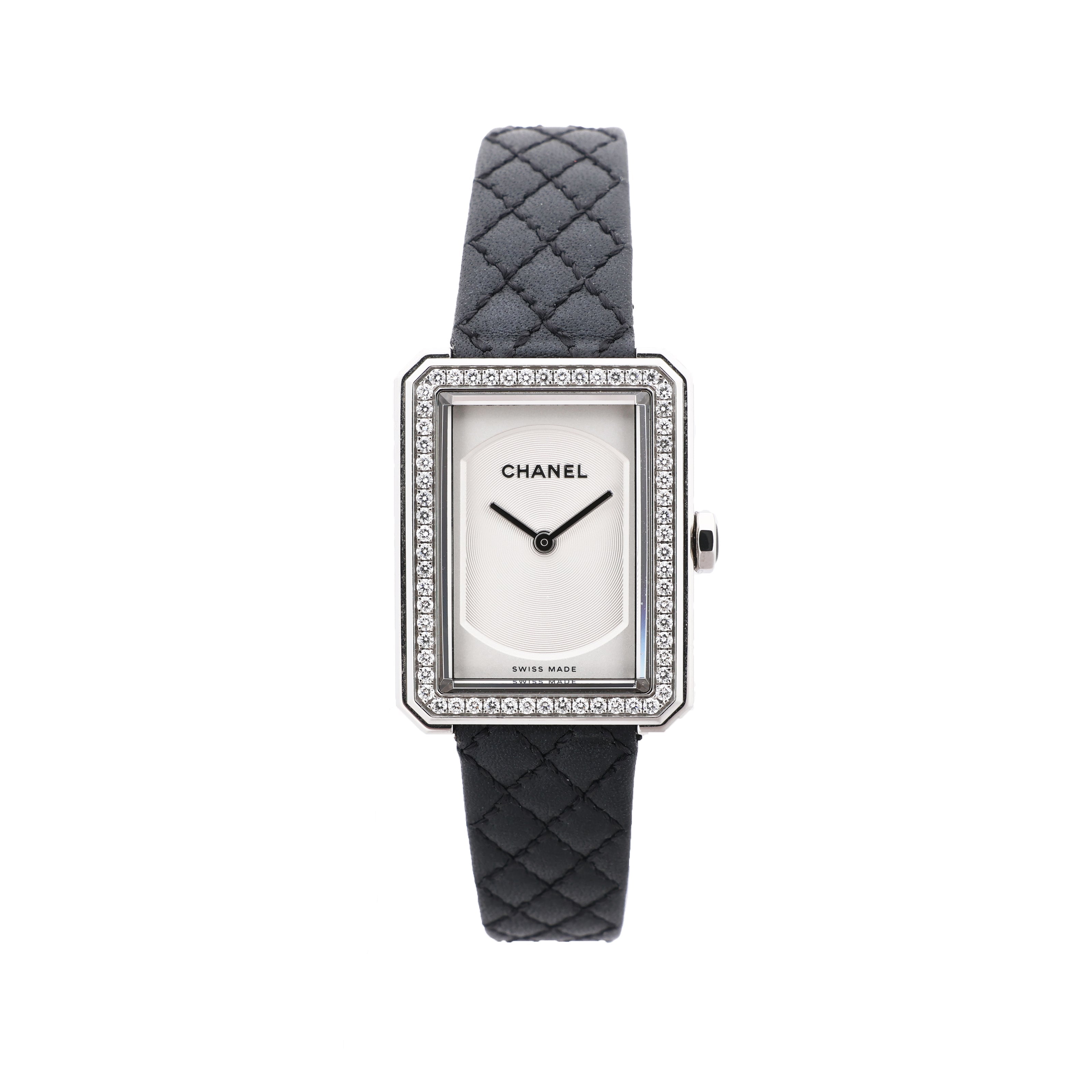 Chanel Boyfriend Watch H6955 in stainless steel with silver dial, diamond-set bezel, and quilted black leather strap. A timeless blend of elegance and modern minimalism, perfect for refined sophistication.