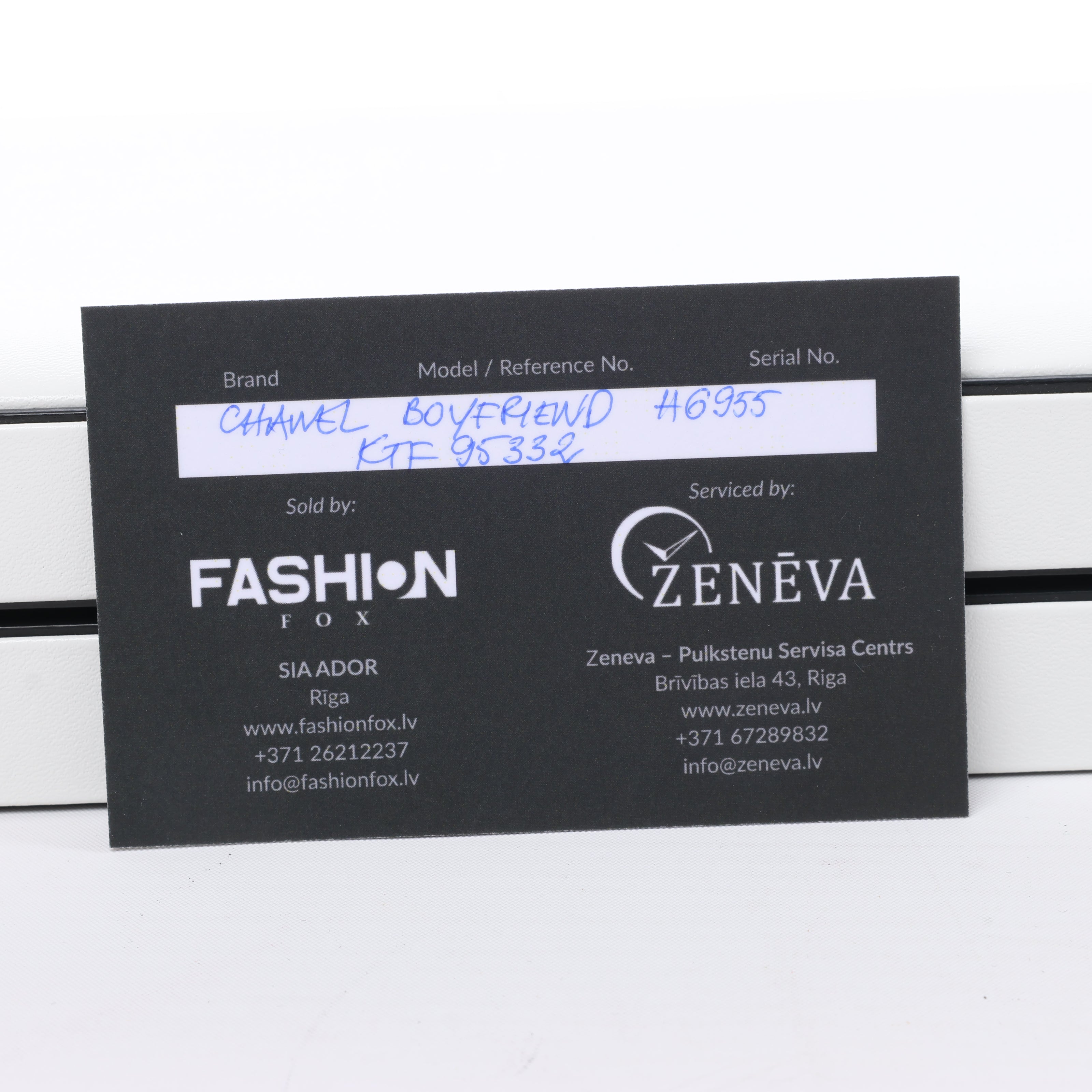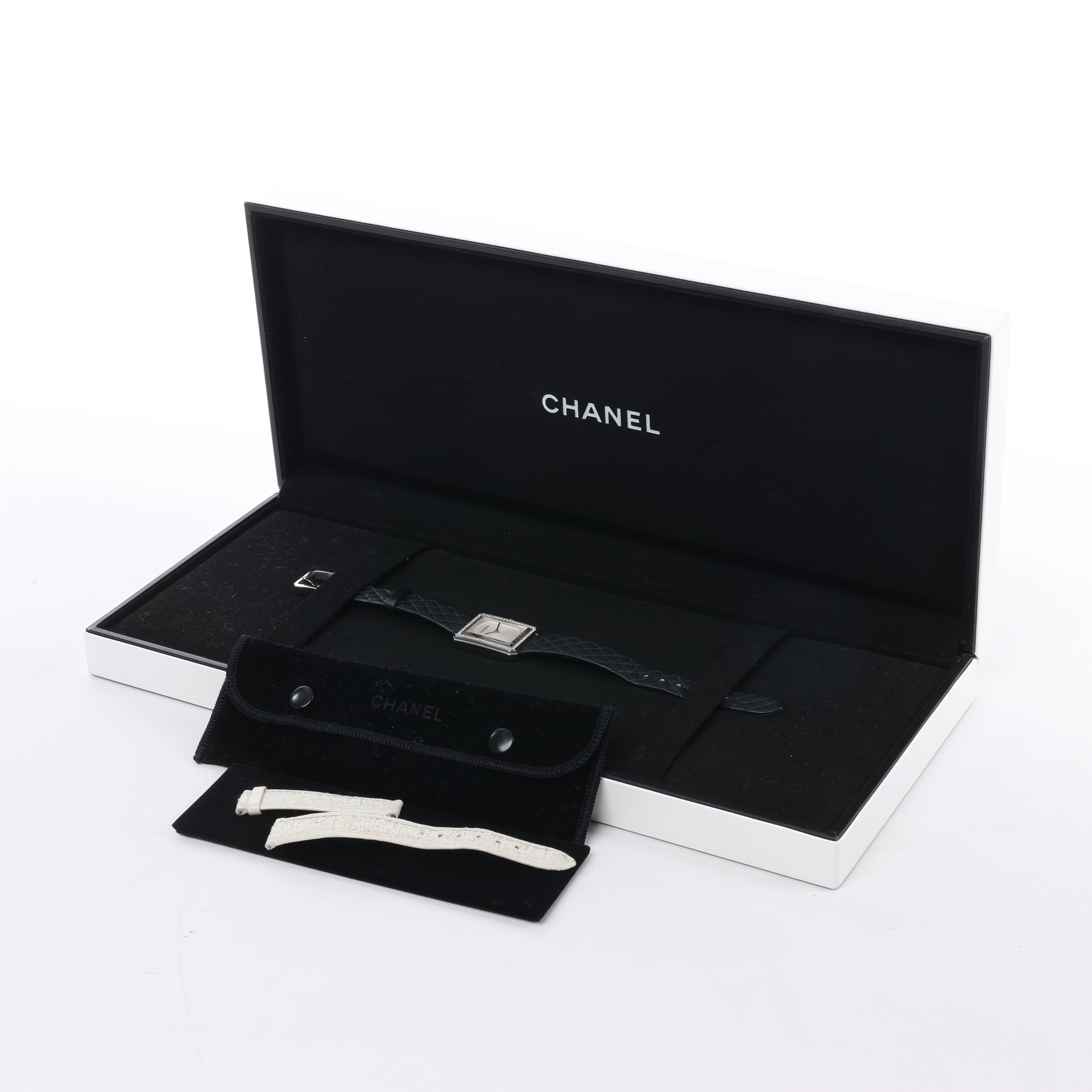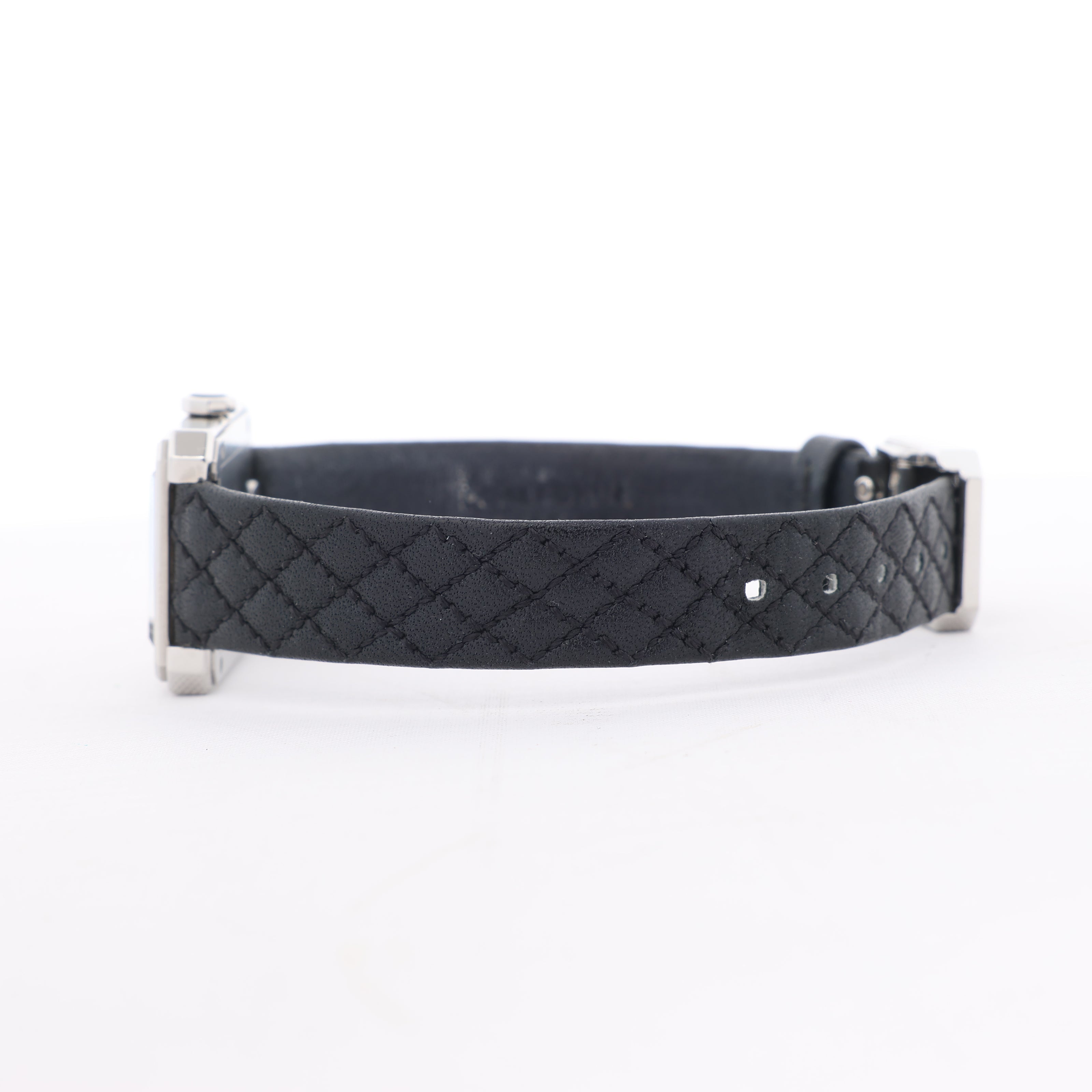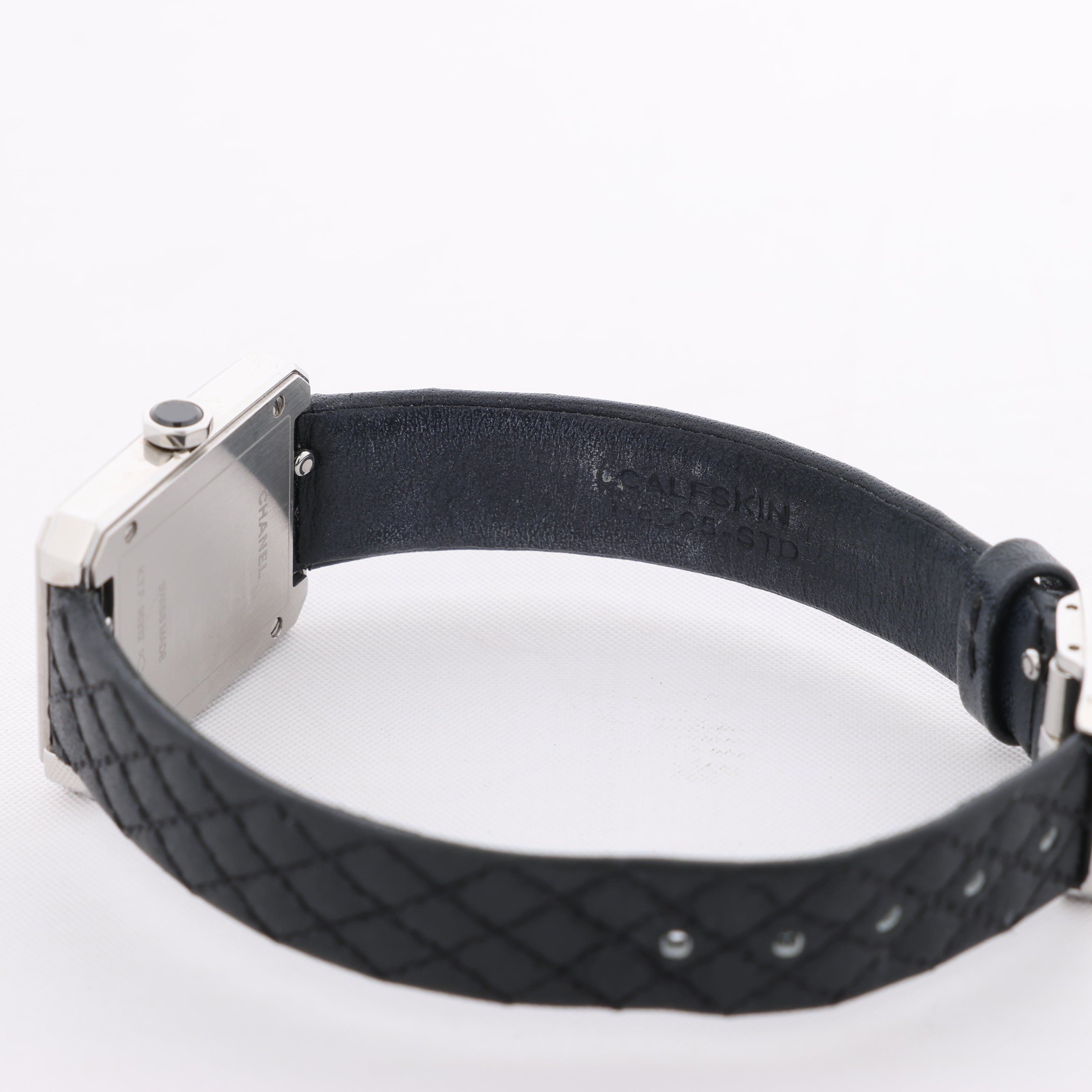 Brand: Chanel Model: BoyfriendReference: H6955Condition: ExcellentCondition Details: Excellent overall condition with almost no visible signs of use. Barely noticeable hairline marks may be present, but they are not visible to the naked eye. Inner strap part has light rubbings. Please see photos for details.Dial Colour: SilverCase Material: Stainless steelStarp Colour: BlackStrap material: LeatherMovement: QuartzFace Diameter: 28 x 22 mm Approx. max circumference: 16 cmComes With: Box, Replacement strap, Service card