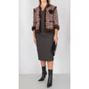 Chanel burgundy and beige silk blend tweed short jacket with check pattern and gold-tone details. Crewneck model, metal hooks front fastening, three-quarter sleeves, patch pockets, brown rabbit fur cuffs and edges. Logoed silk lining. Camelia decorative brooch in rabbit fur. Items shows signs of wear on the fur cuffs, as shown in the pictures.