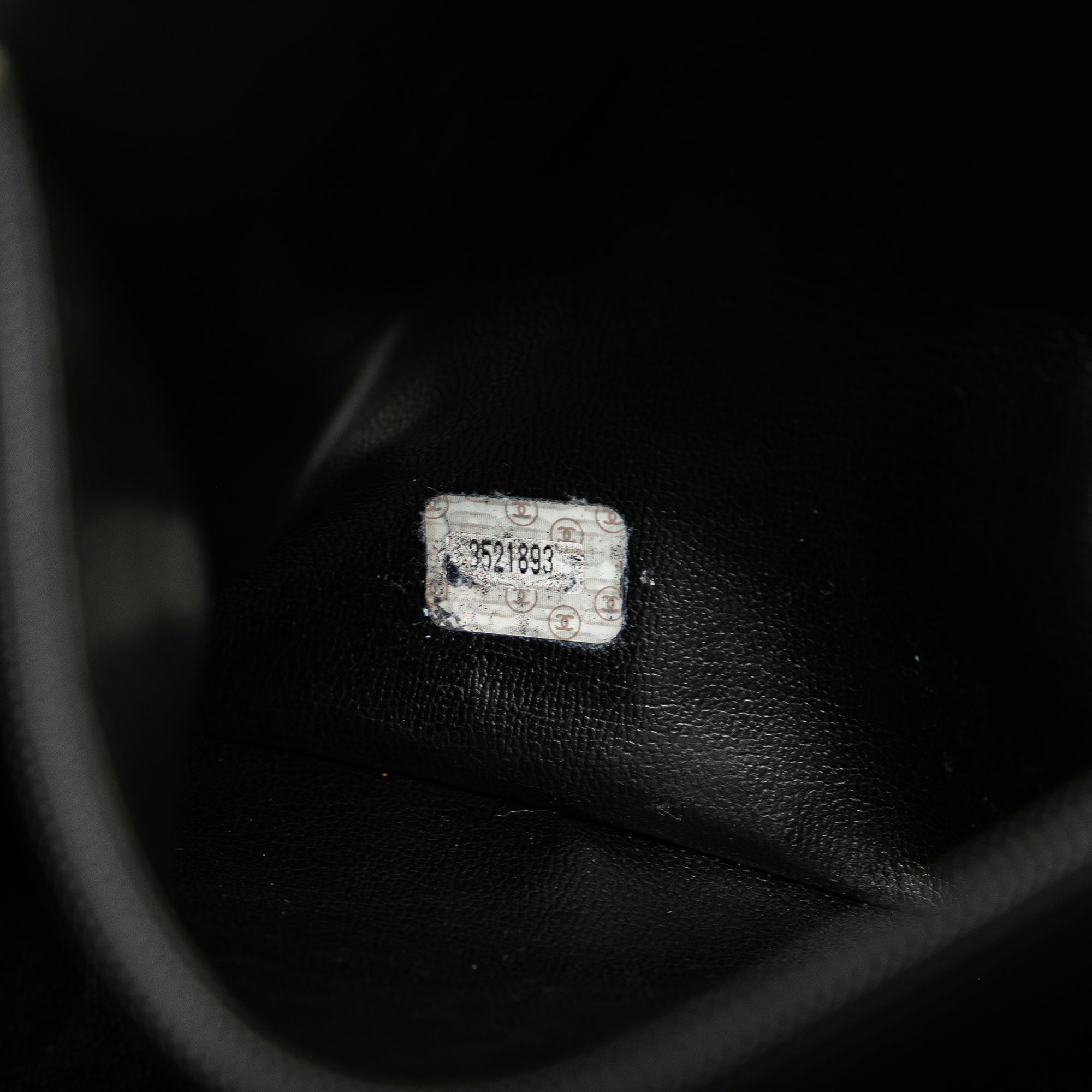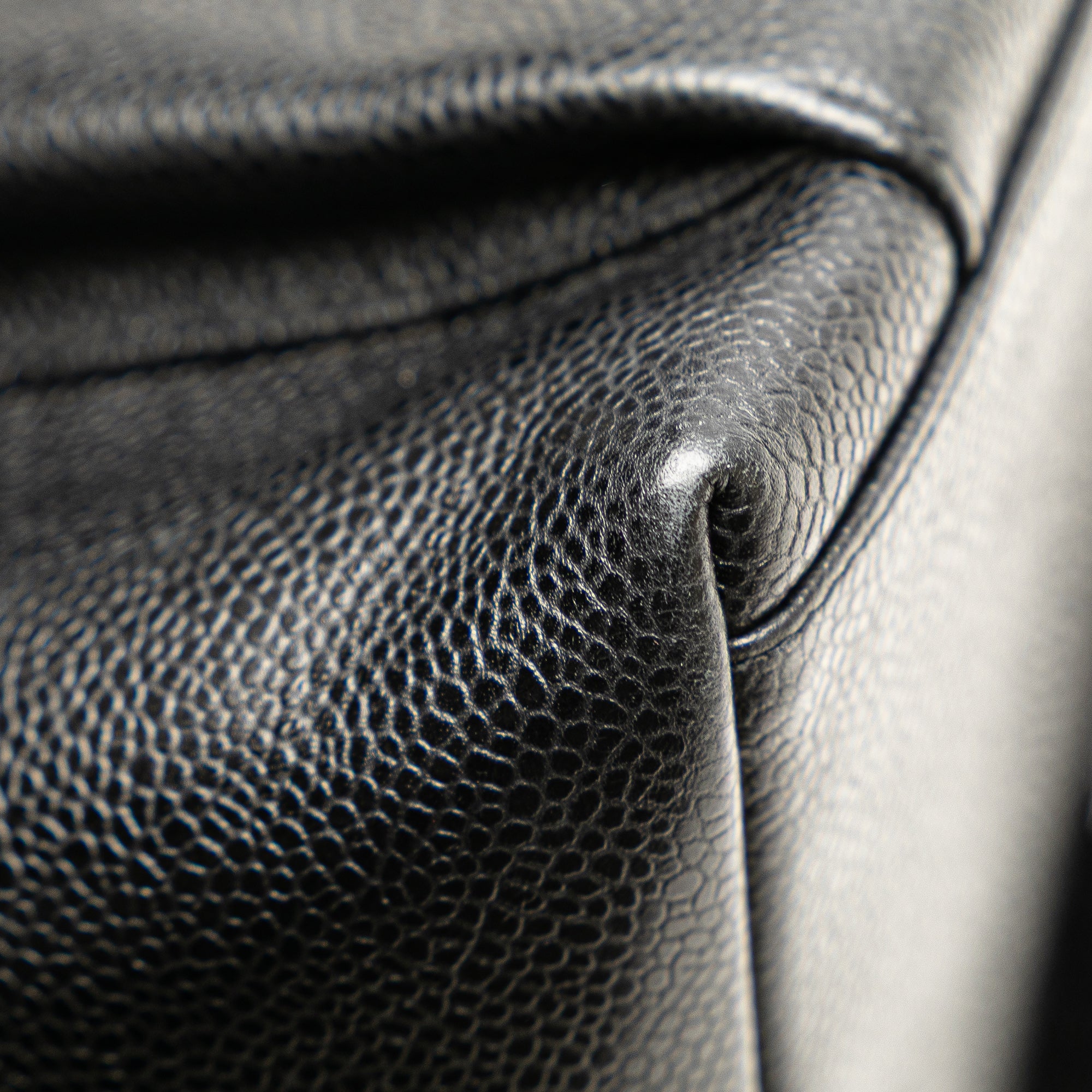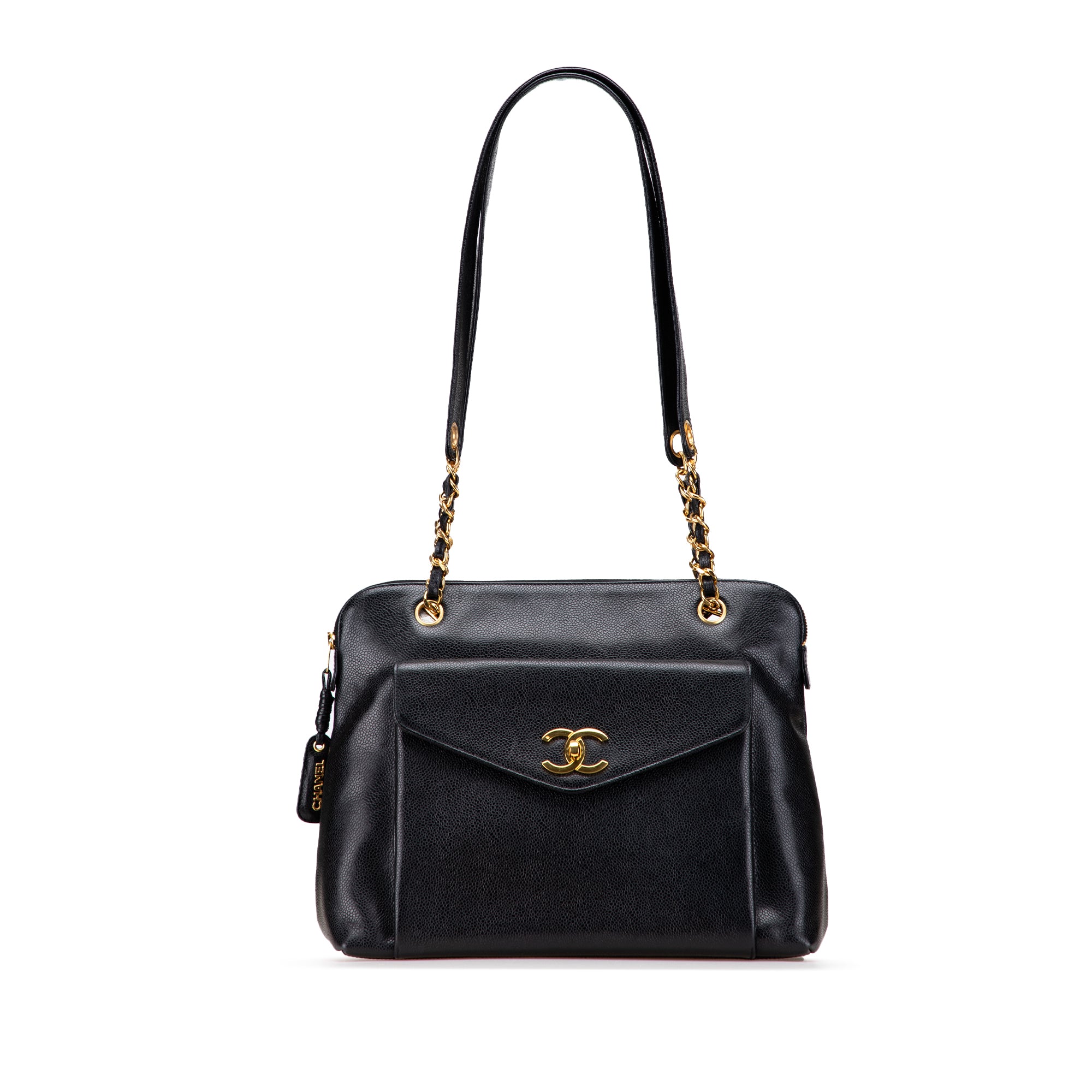This chain tote features a caviar leather body, chain link and flat leather straps, a top zip closure, an exterior front flap pocket with a twist lock closure, and an interior zip pocket. Retail Price: 3954.00