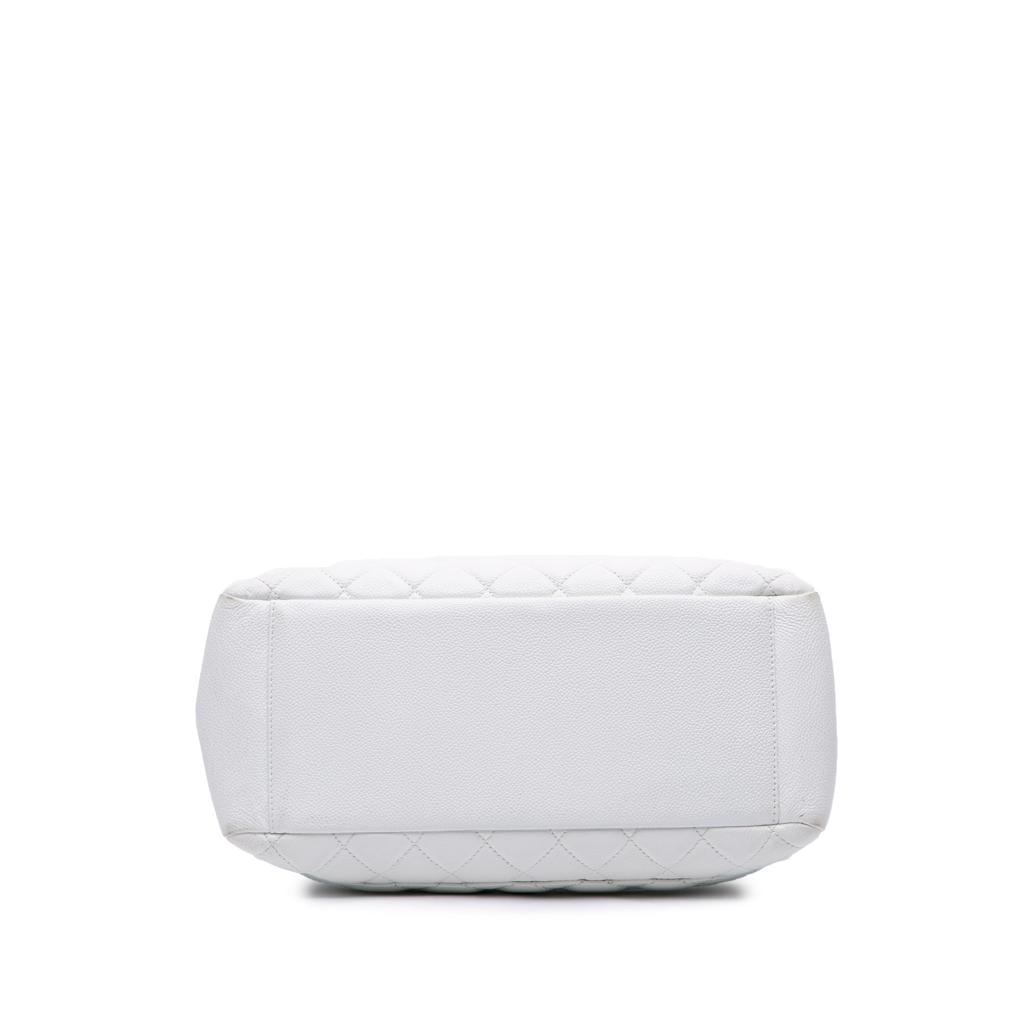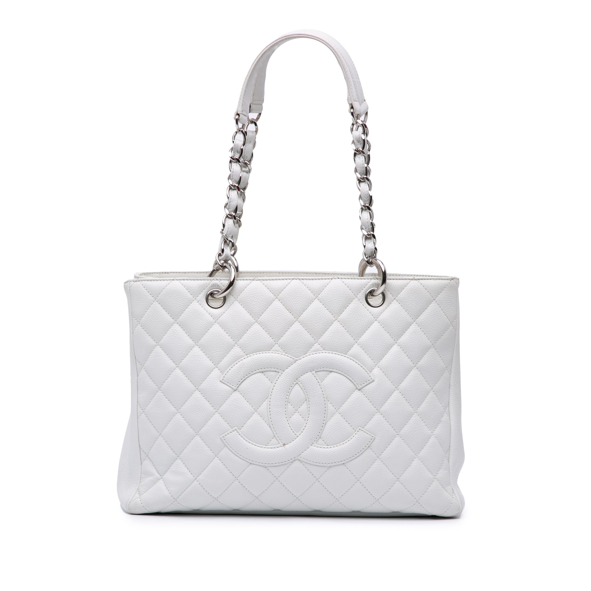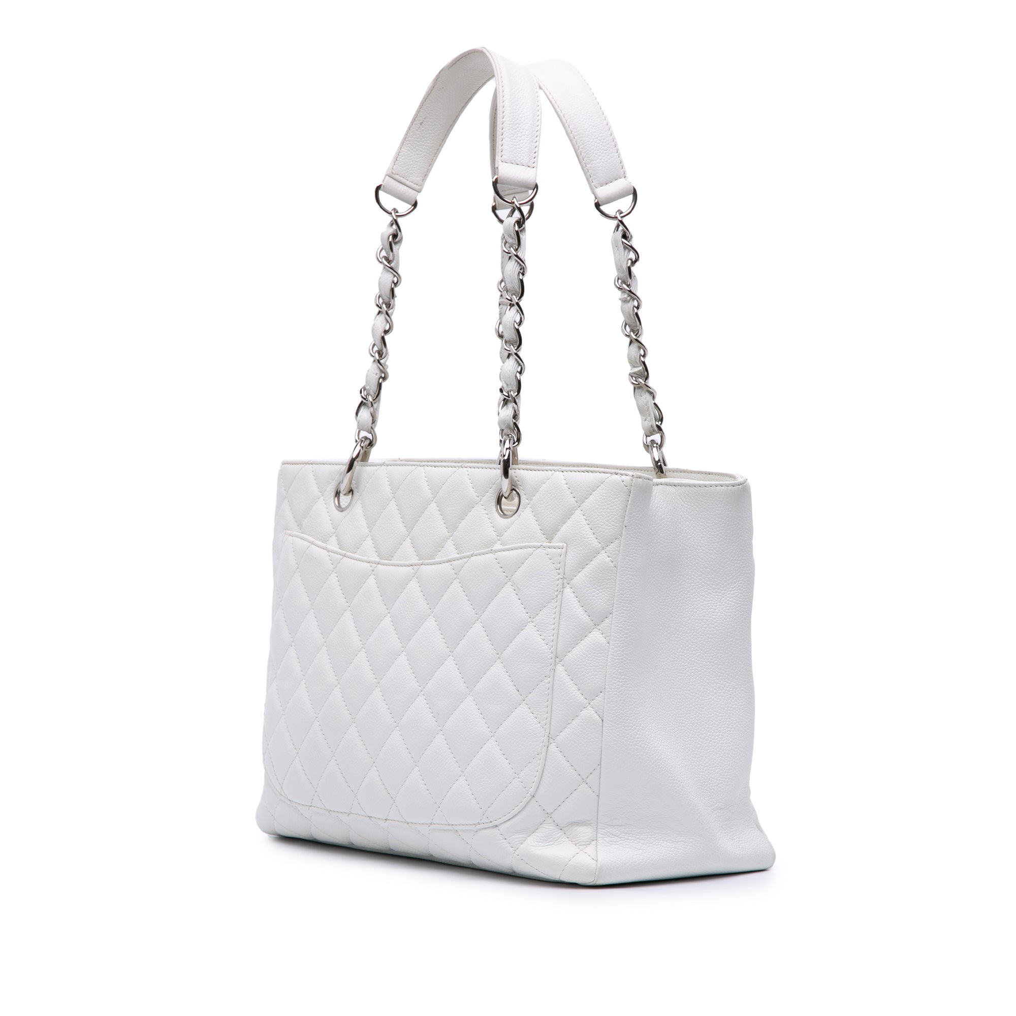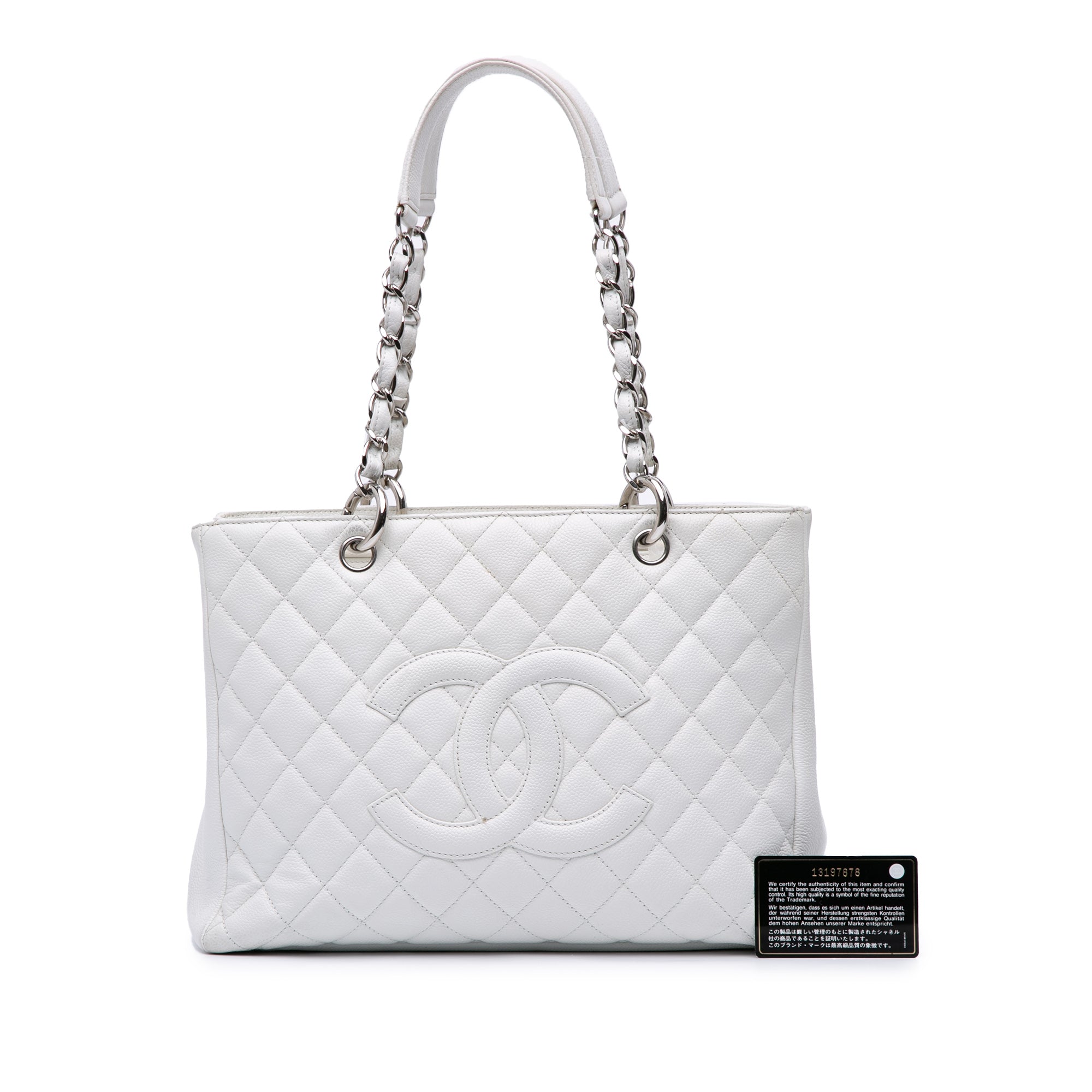 The Grand Shopping Tote features a quilted caviar leather body, leather woven curb chain straps with leather guard, an open top, an exterior back slip pocket, interior center zip compartment, and interior zip and slip pockets. Inclusion: authenticity card. Retail Price: 2900.00