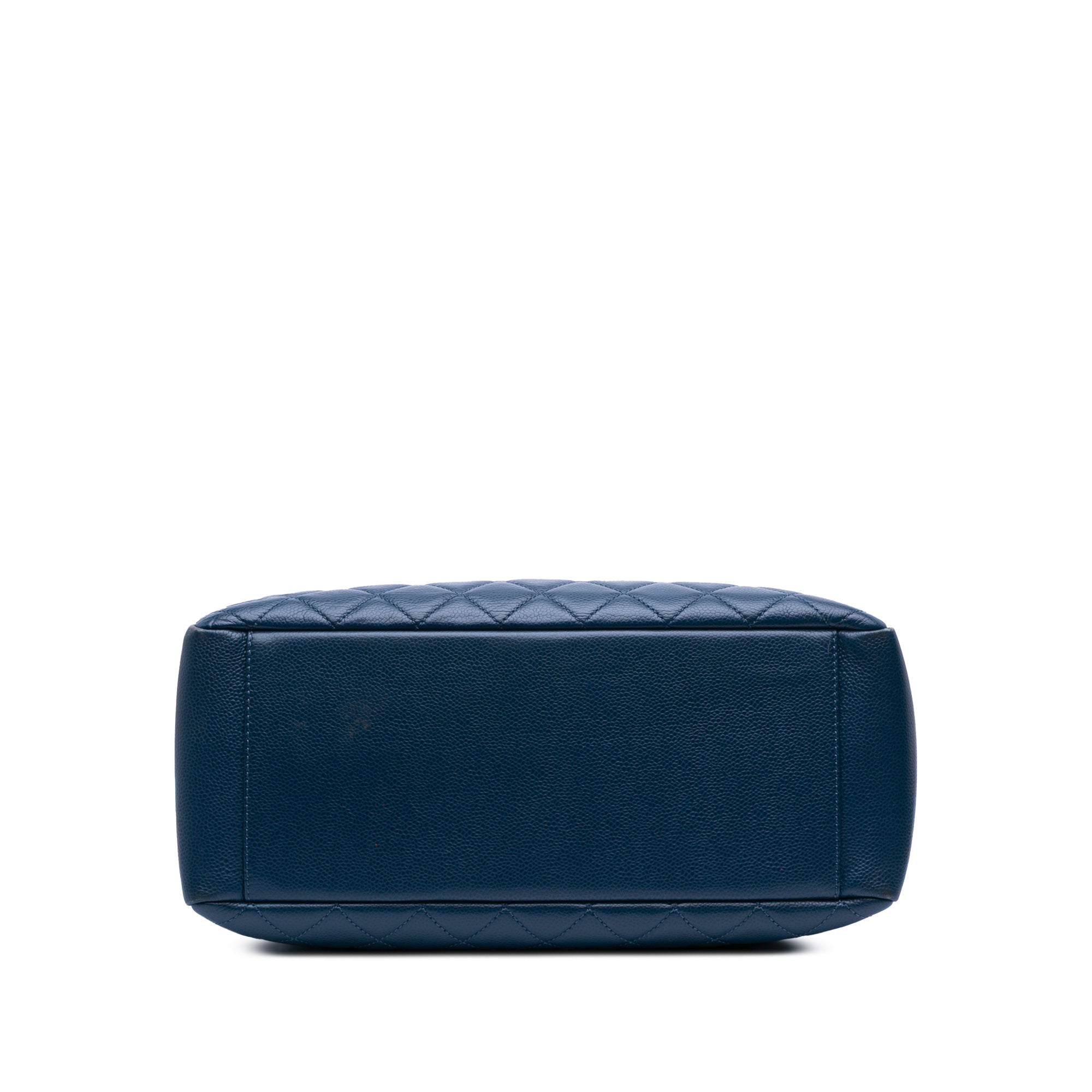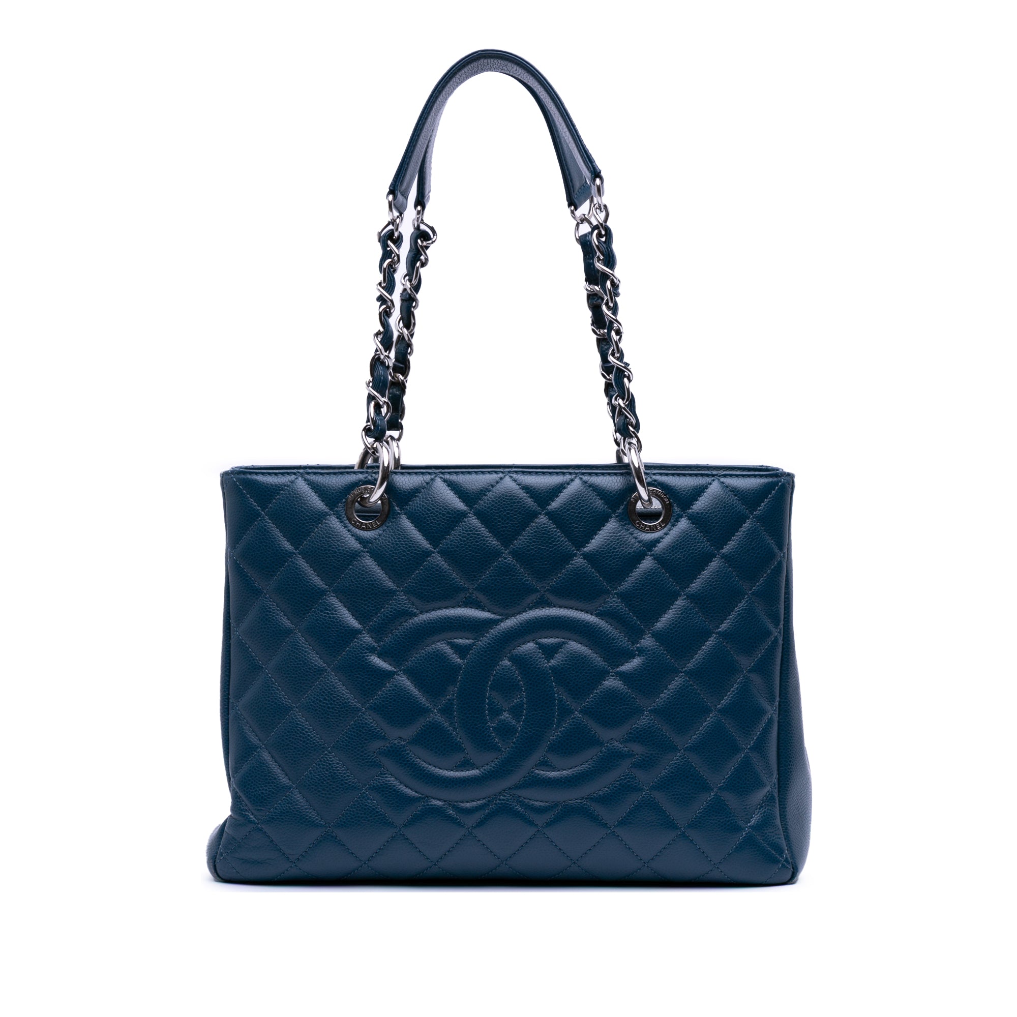 The Grand Shopping Tote features a caviar leather body, curb chain straps, an open top, an exterior back slip pocket, and interior zip and slip pockets. Inclusion: authenticity card. Retail Price: 3890.00