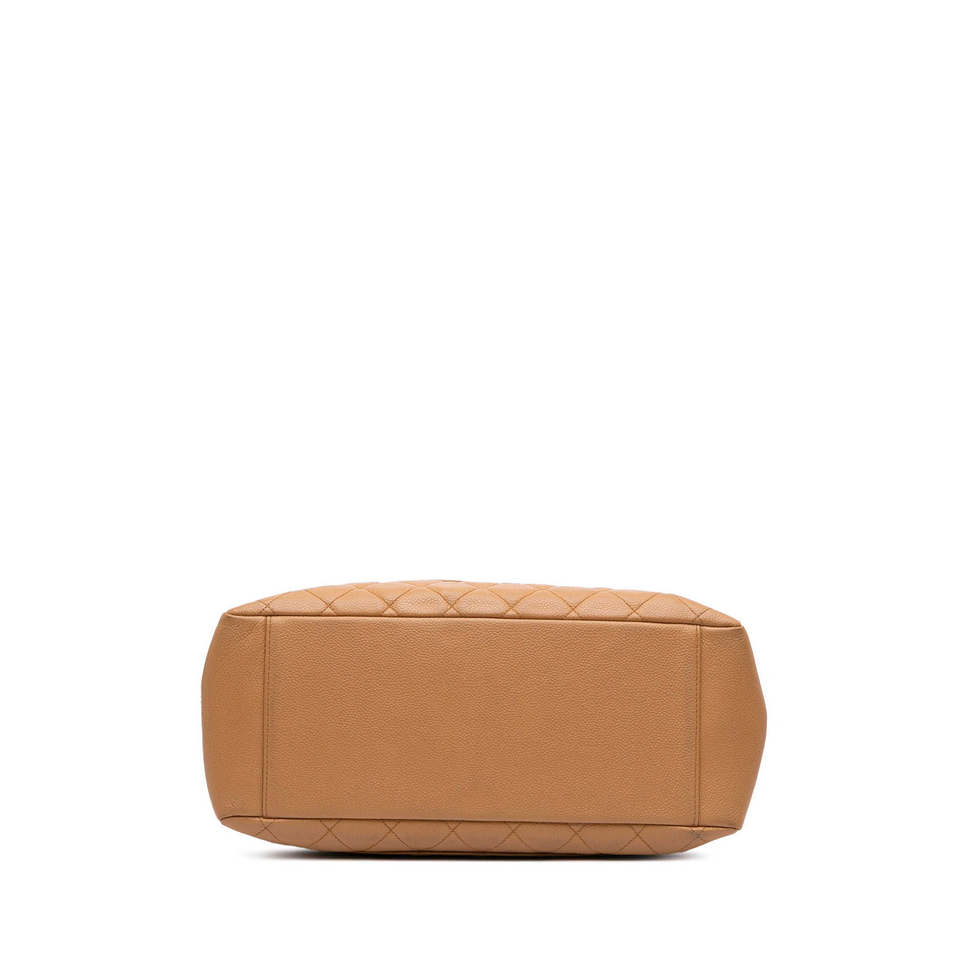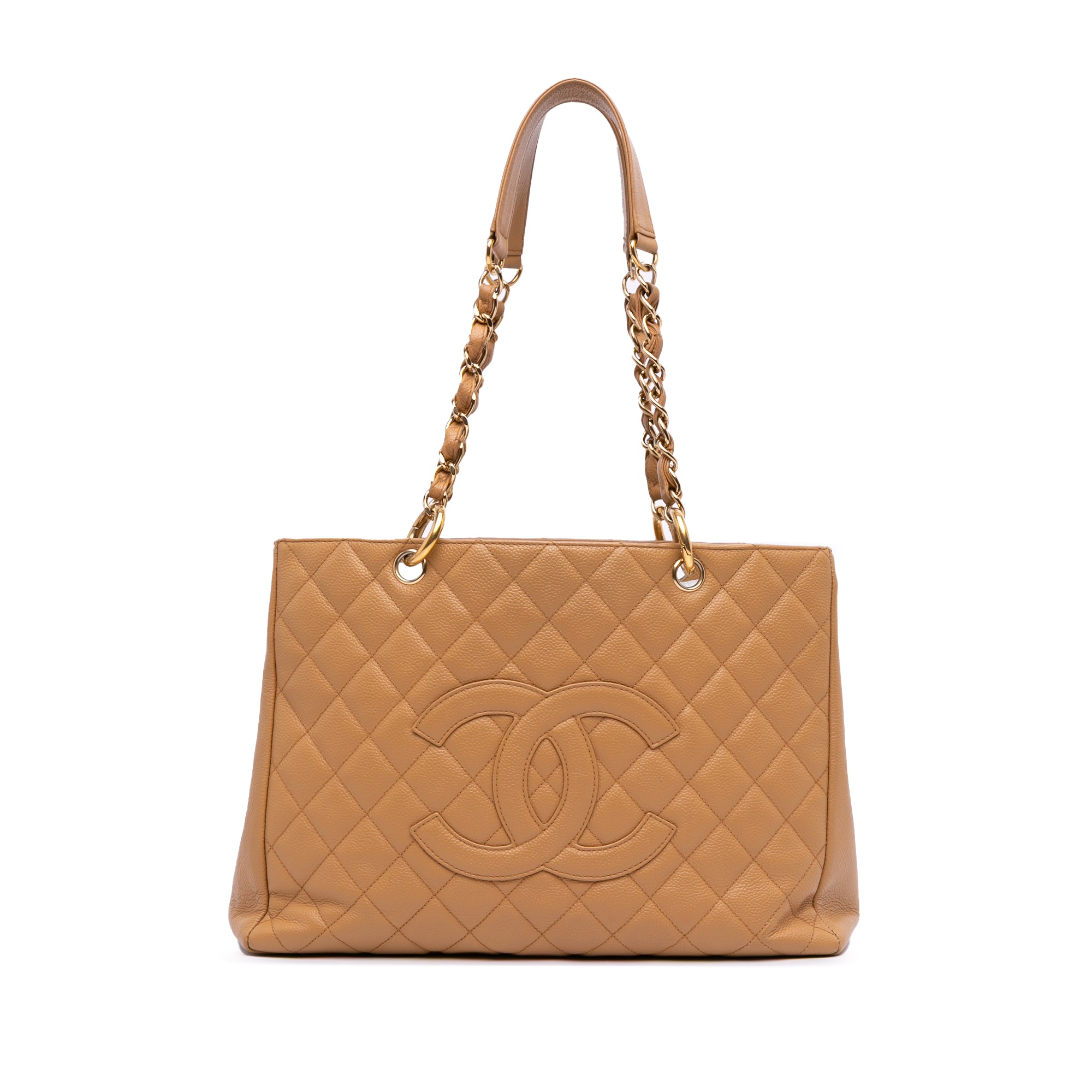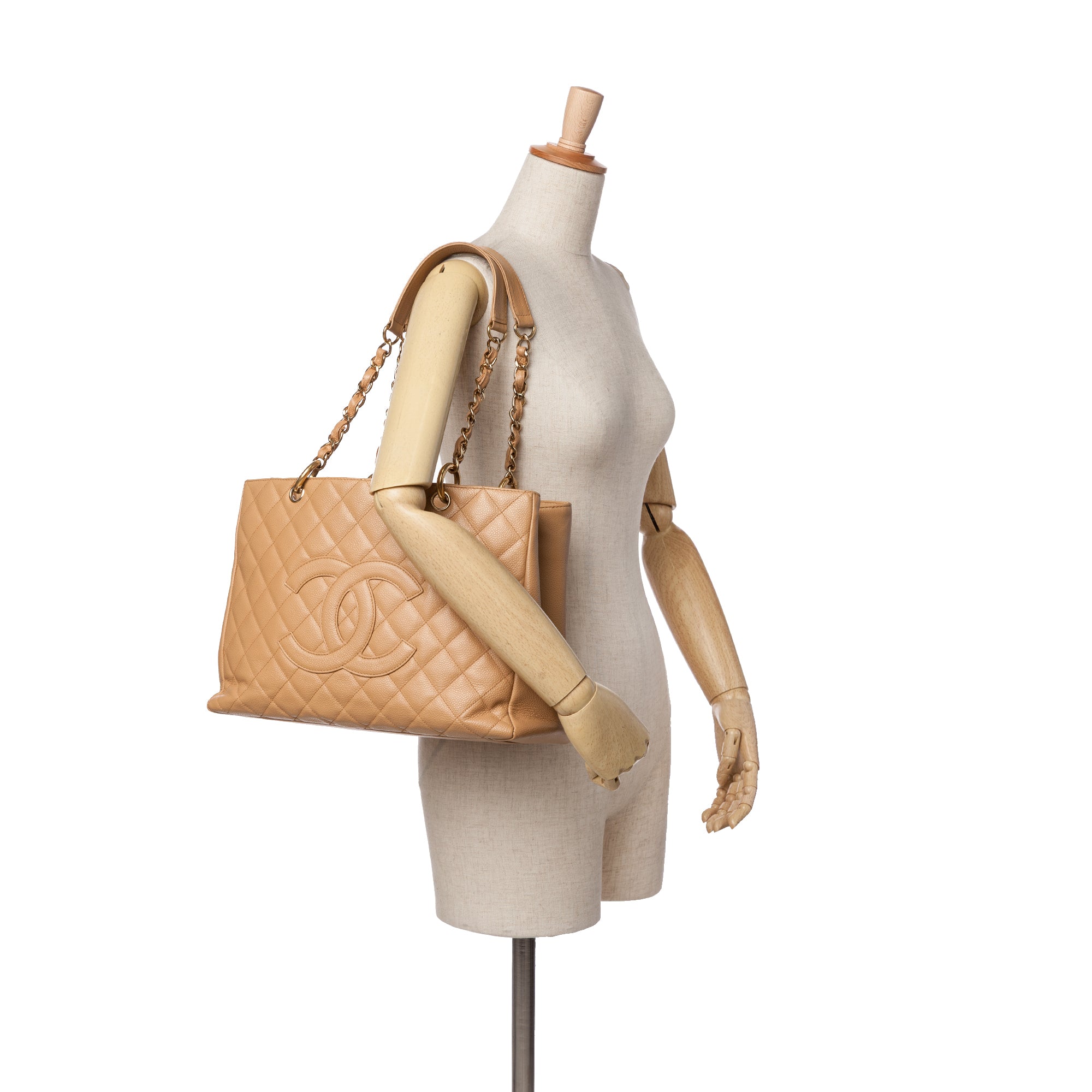The Grand Shopping Tote features a caviar leather body, an exterior back slip pocket, curb chain handles, an open top with magnetic snap button closure, and interior zip and slip pockets. Retail Price: 3500.00
