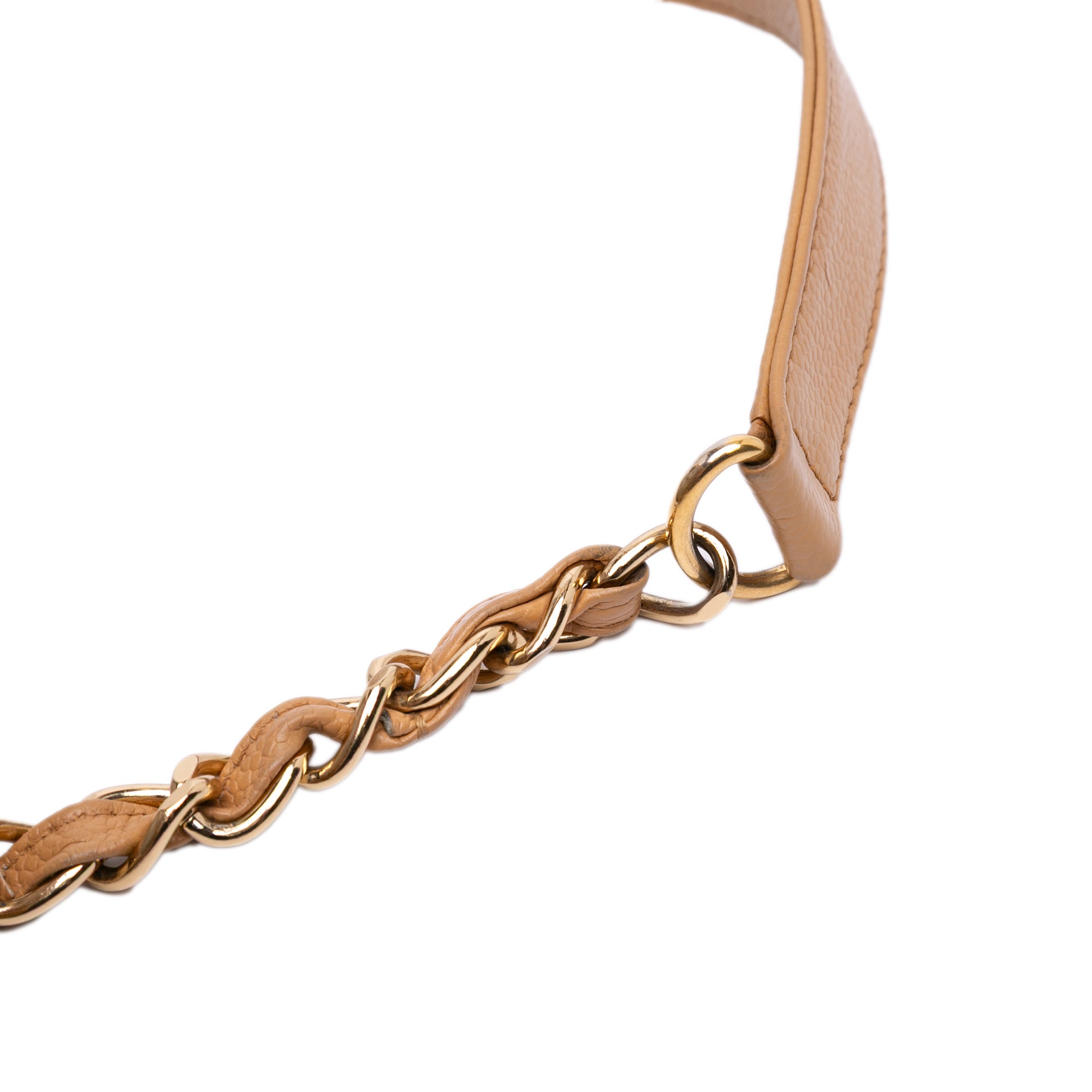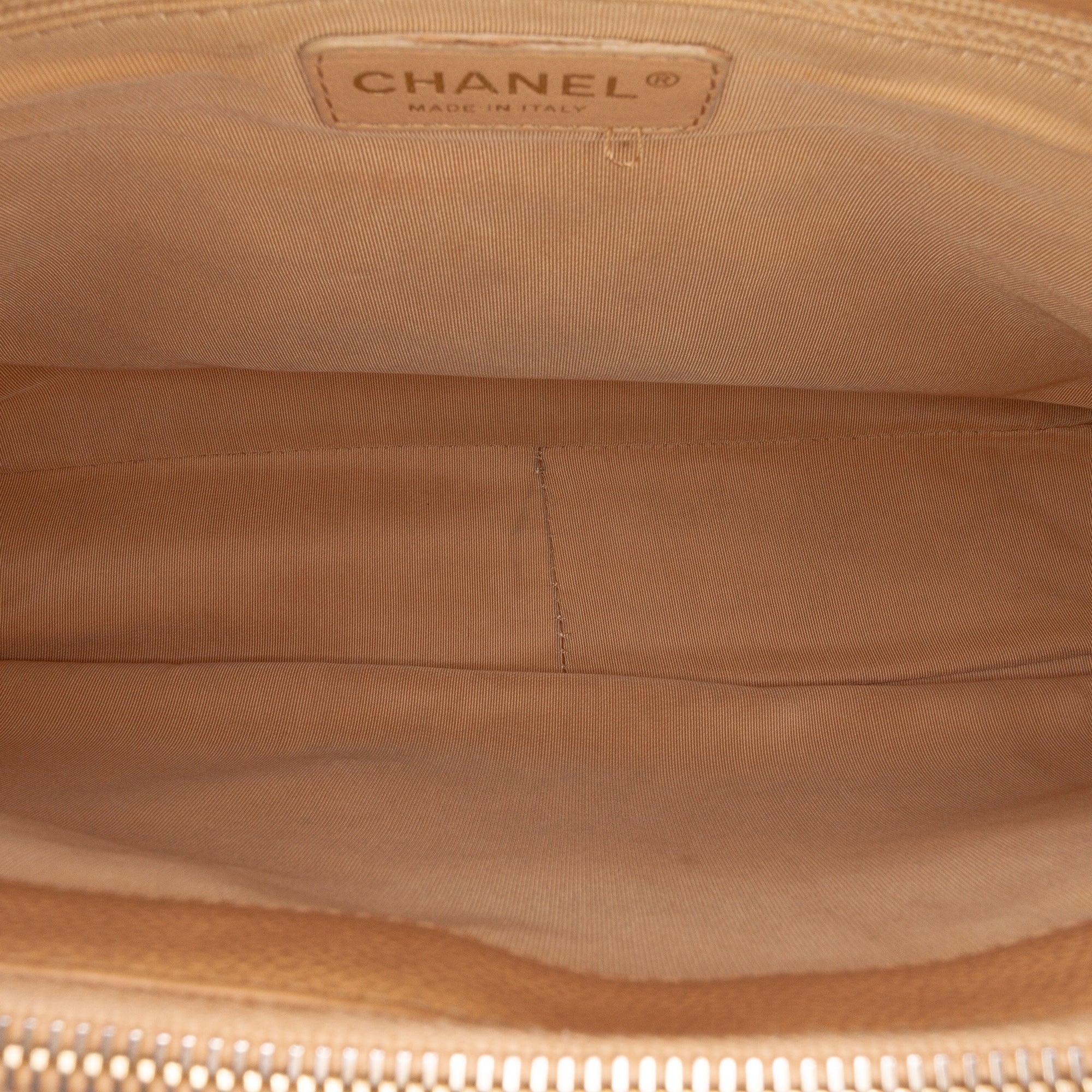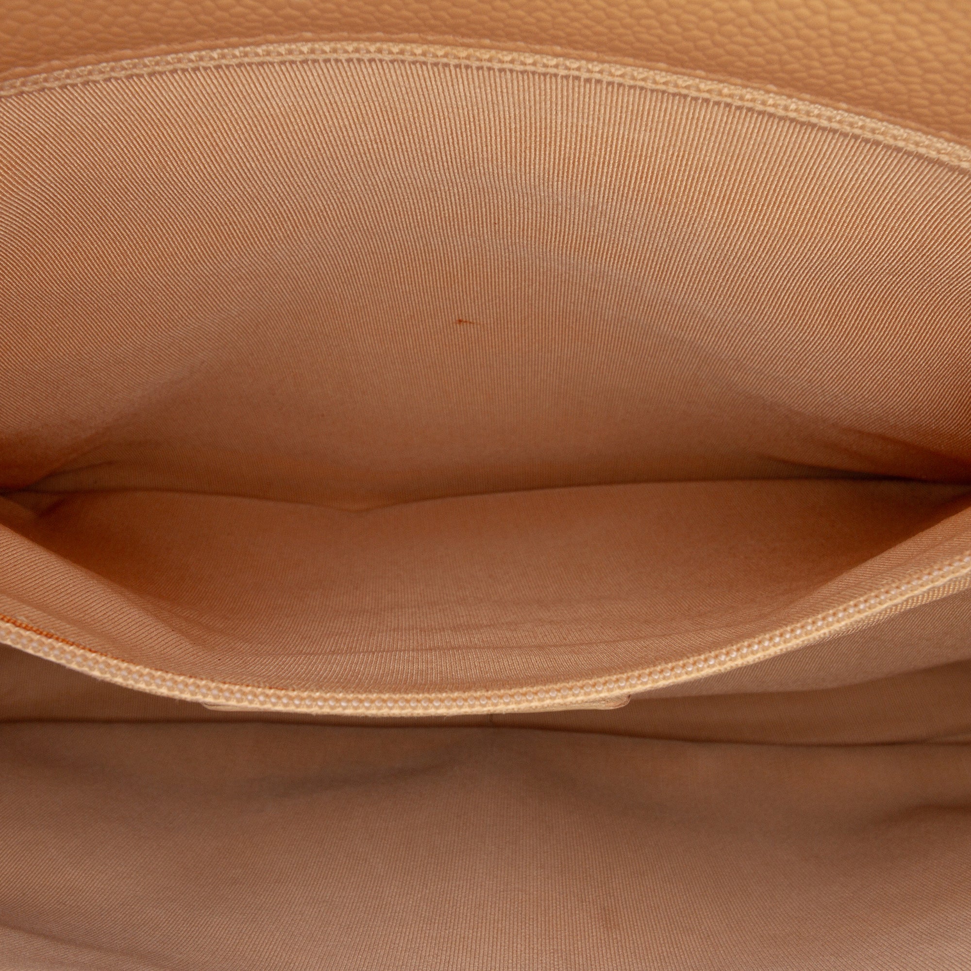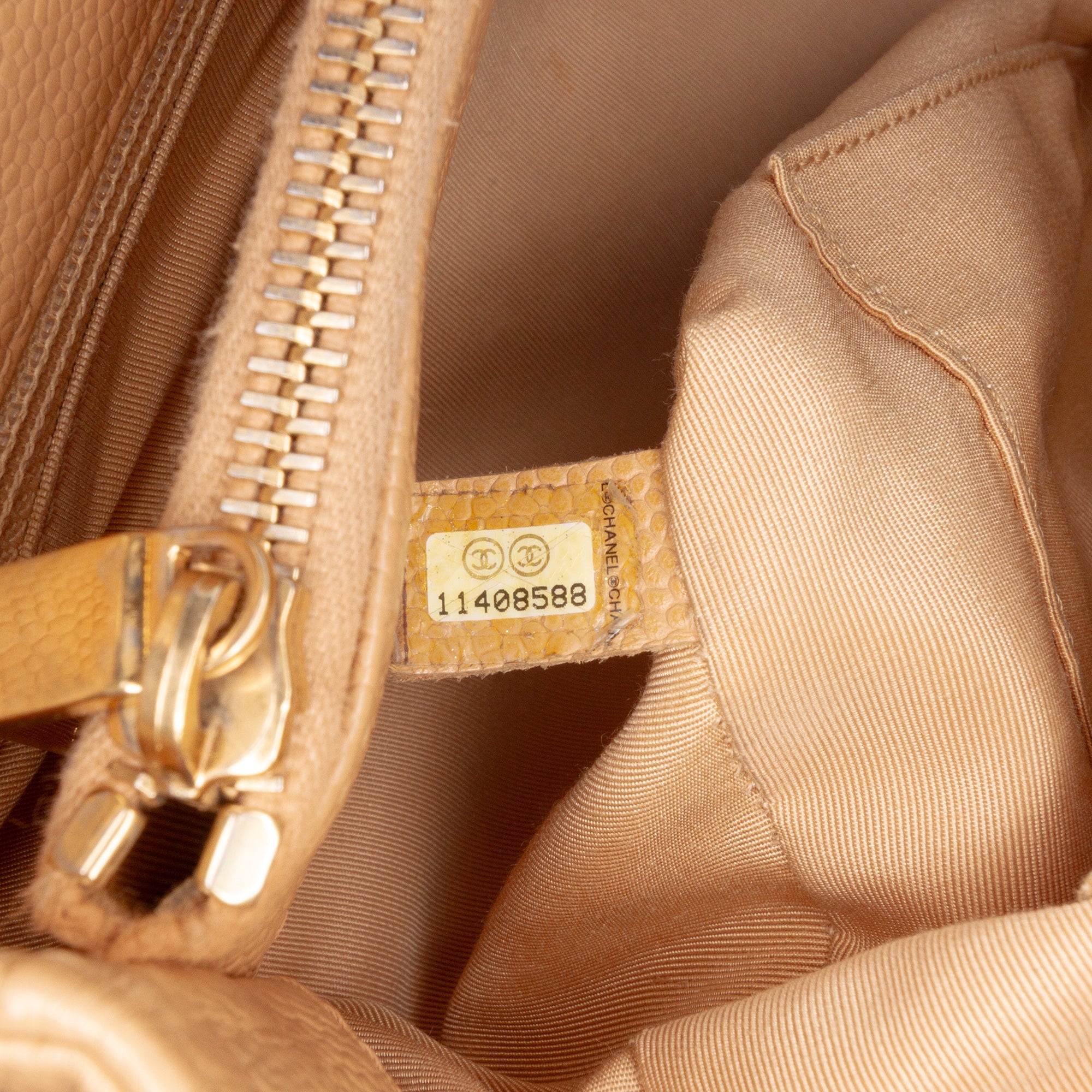 The Grand Shopping Tote features a caviar leather body, an exterior back slip pocket, curb chain handles, an open top with magnetic snap button closure, and interior zip and slip pockets. Retail Price: 3500.00
