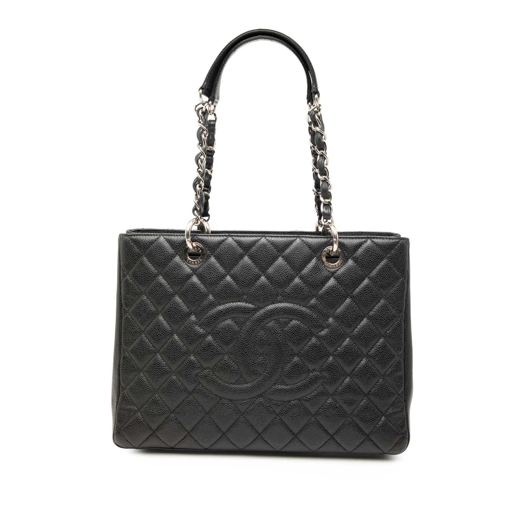 The Grand Shopping Tote features a quilted Caviar leather body, leather woven chain shoulder straps, an open top, an interior zip compartment, an exterior back slip pocket, and interior zip and slip pockets. Retail Price: 3890.00