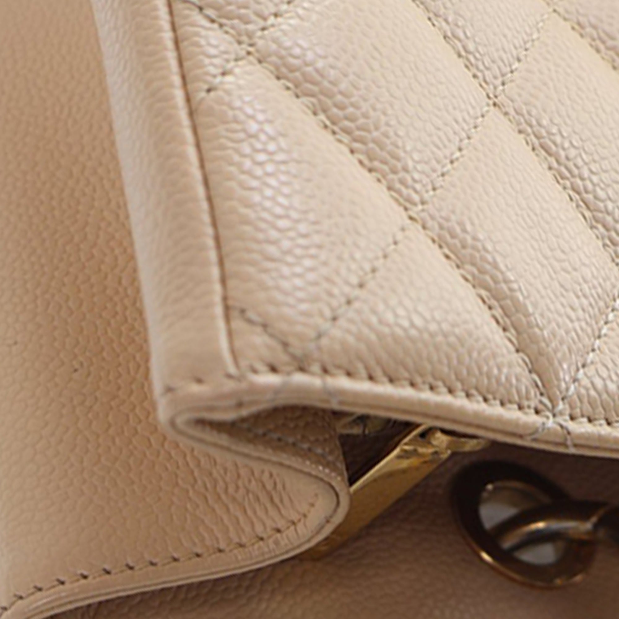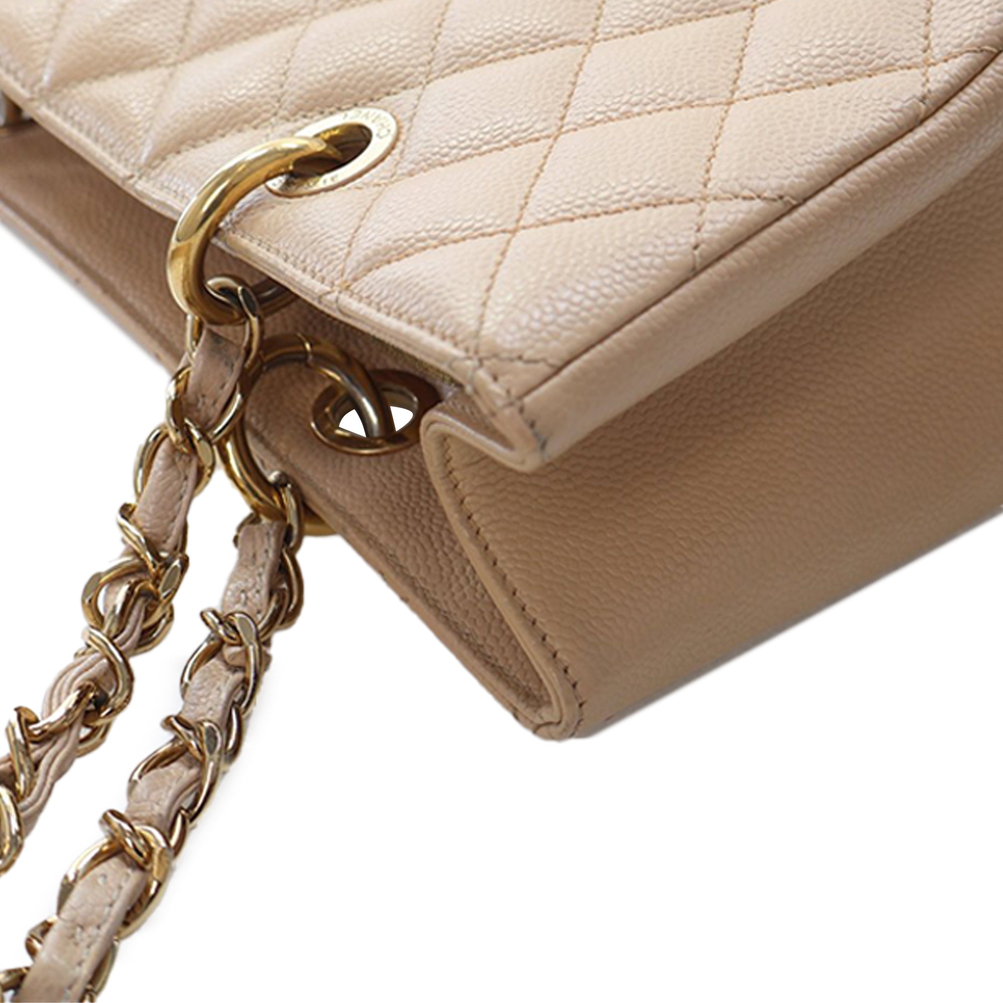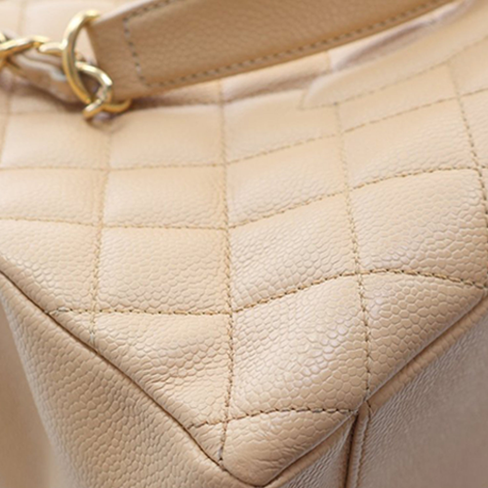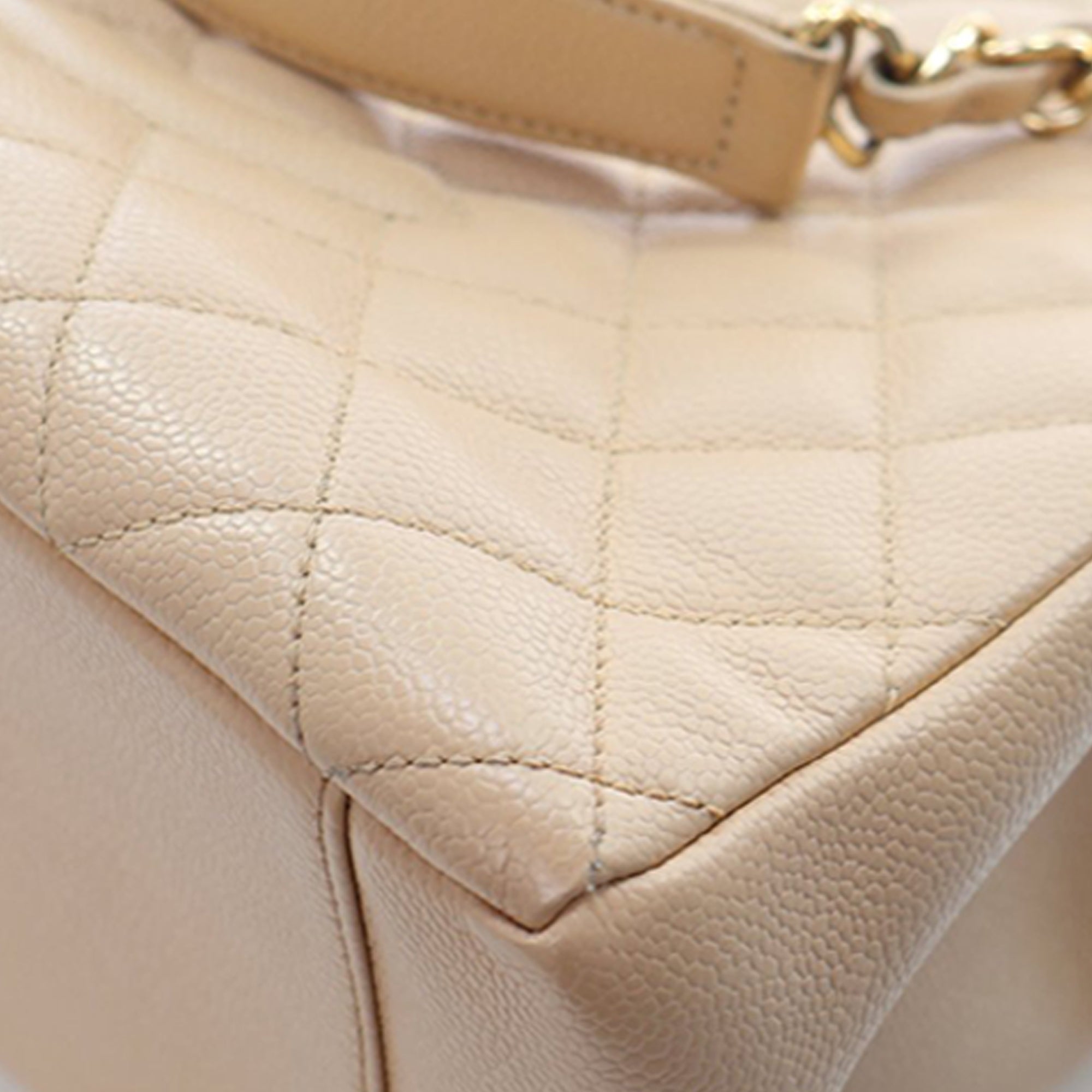 The Grand Shopping Tote features a caviar leather body, leather woven chain-link strap with leather guard, an open top with magnetic snap button closure, an exterior back slip pocket, and interior zip and slip pockets. Inclusion: Dust bag. Retail Price: 3500.00